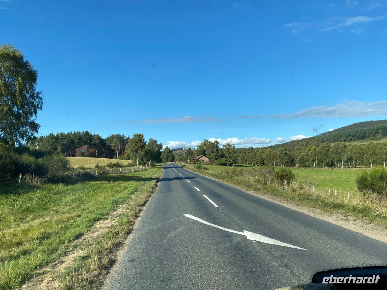 Auch wenn mittlerweile offiziell der Herbst begonnen hat, fahren wir nun bei schönstem Sommerwetter entlang des Flusses Spey nach Norden durch herrliche Landschaften. Immer wieder sehen wir Whisky-Brennereien mit klingenden Namen, manche davon inmitten der Felder, in den Orten stehen gelegentlich mehrere nebeneinander.