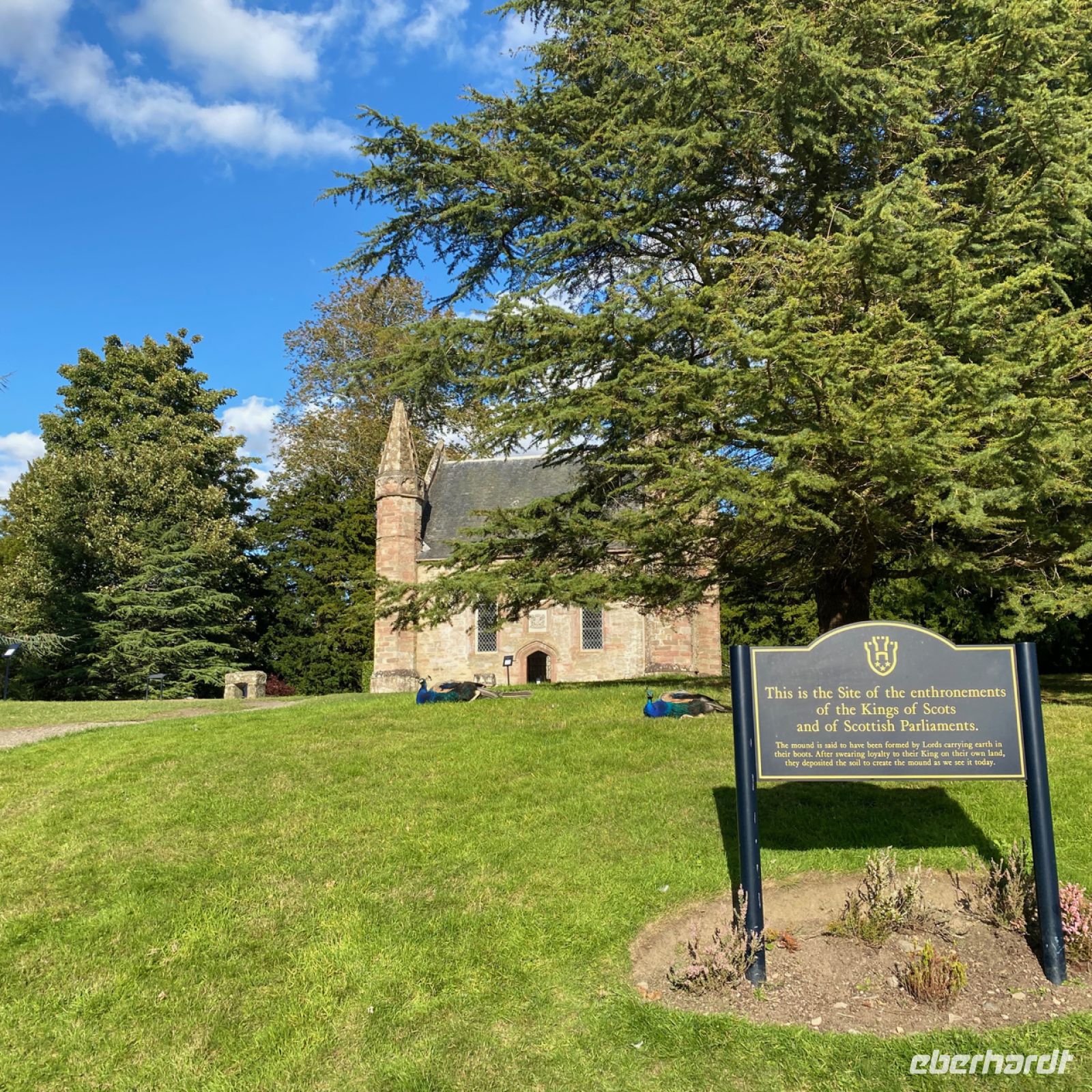 Hier wurden einst die schottischen Könige gekrönt, den Hügel an dem die Zeremonien stattfanden sehen wir natürlich genauso wie die herrliche Parkanlage in der man auch gerne tagelang spazieren gehen würde! Wir überlassen das für heute den Pfauen, die hier wohnen, wir haben noch etwas vor heute.