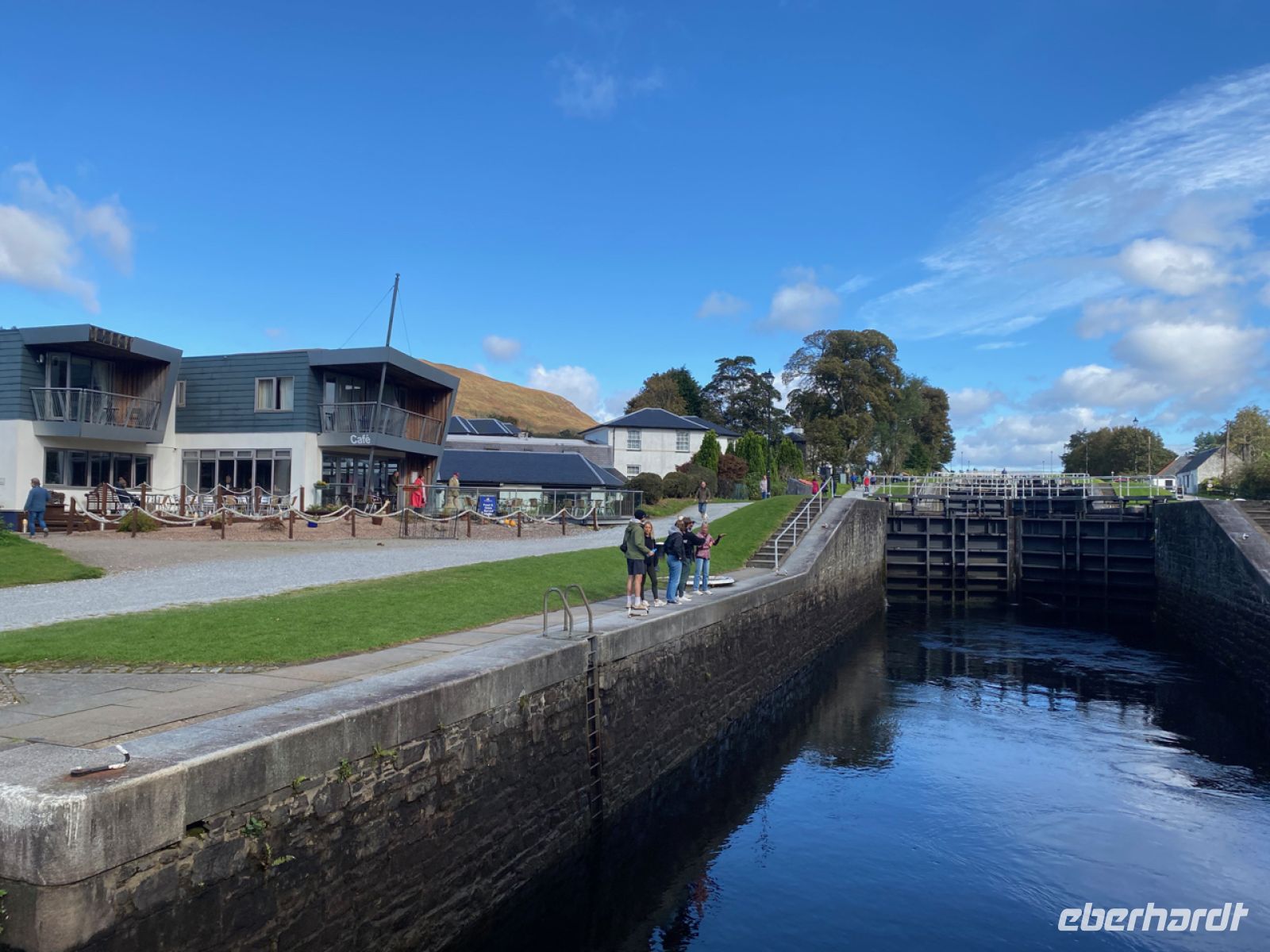 An den Ufern der Seen entlang geht es nun zurück, jeder kann nun auch die andere Seite des Panoramas genießen. Ein Halt an der Treppe von Neptun, einer über 200 Jahre alten Schleusenanlage, lässt uns staunen, bevor es nun an den Fuß der Ben-Navis-Range geht, der höchsten Bergkette von Großbritannien. Hier steigen wir in eine Seilbahn, die uns lautlos in eine wunderschöne Bergwelt trägt. Im Winter wird hier Ski gefahren, im Sommer mit dem Mountainbike. Wir aber spazieren gemütlich durch die Heidelandschaft oder genießen einfach so die weiten Ausblicke, und ein Bergcafé gibt es hier auch, um einzukehren.