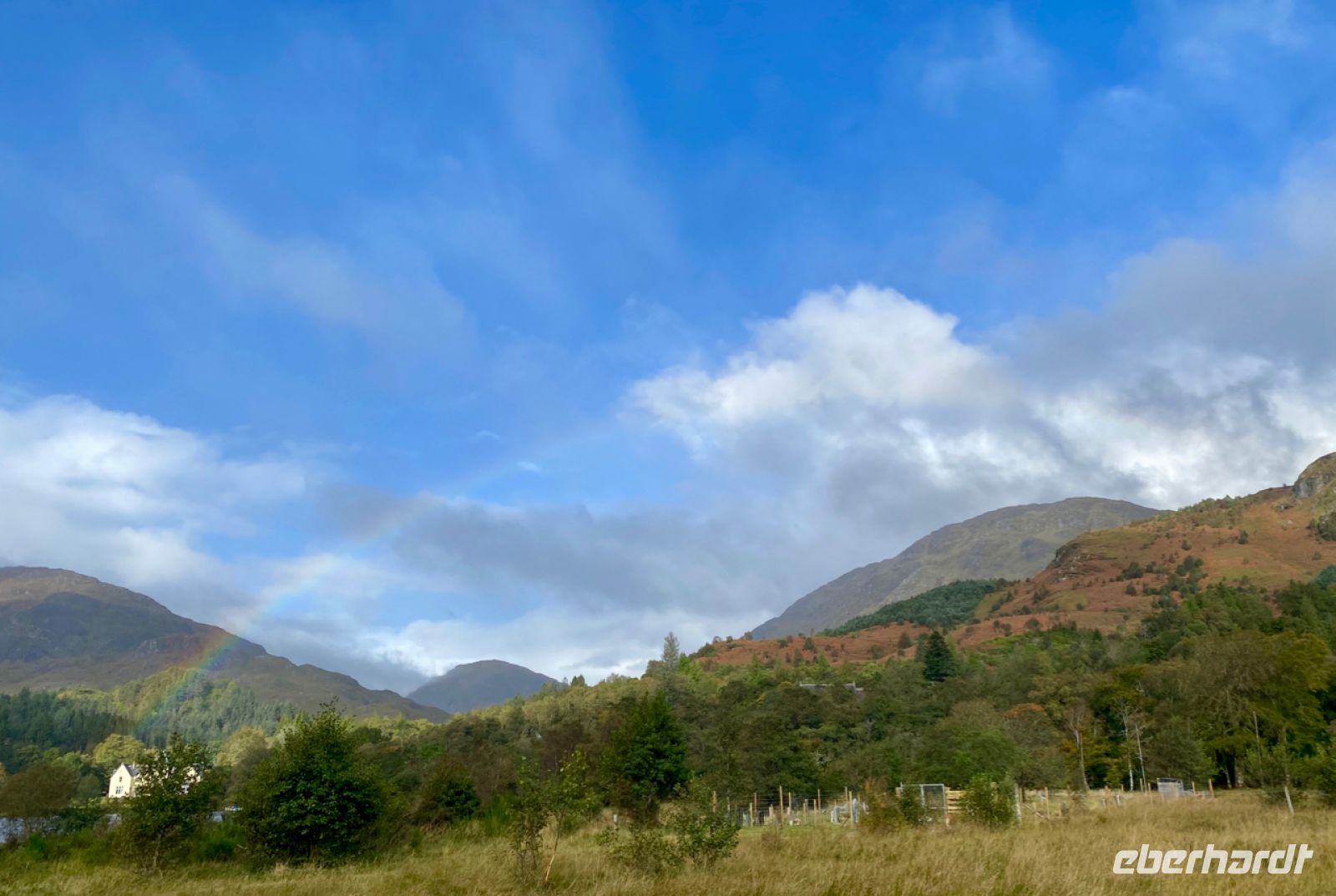 An Loch Linnhe und Loch Eil vorbei führt uns unsere Route an den malerisch gelegenen See Loch Shiel. Hier liegt das kleine Dörfchen Glenfinnan, wo wir von einem Regenbogen begrüßt werden. Einst spielte sich auch hier eines der wichtigsten Ereignisse in Schottlands bewegter Geschichte ab. 1745 kam hier Bonnie Prince Charlie an Land, aus Frankreich kommend, und traf auf tapfere Highlander, die sich um ihn sammelten, um den Thron, den sein Vater verloren hatte, zurückzuerobern, vergeblich allerdings. Ein wunderschönes Denkmal erinnert heute noch daran.