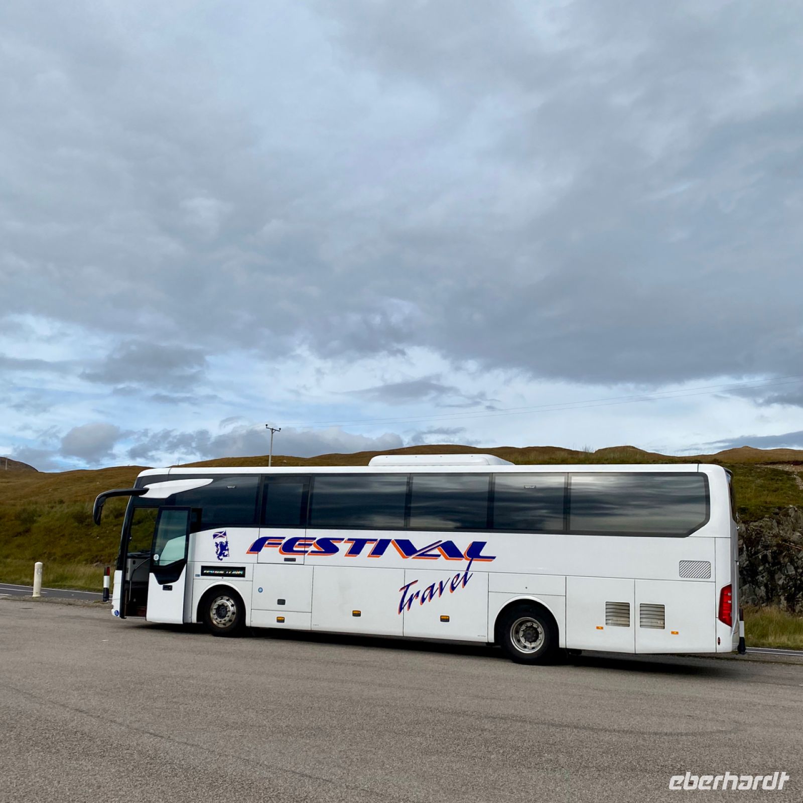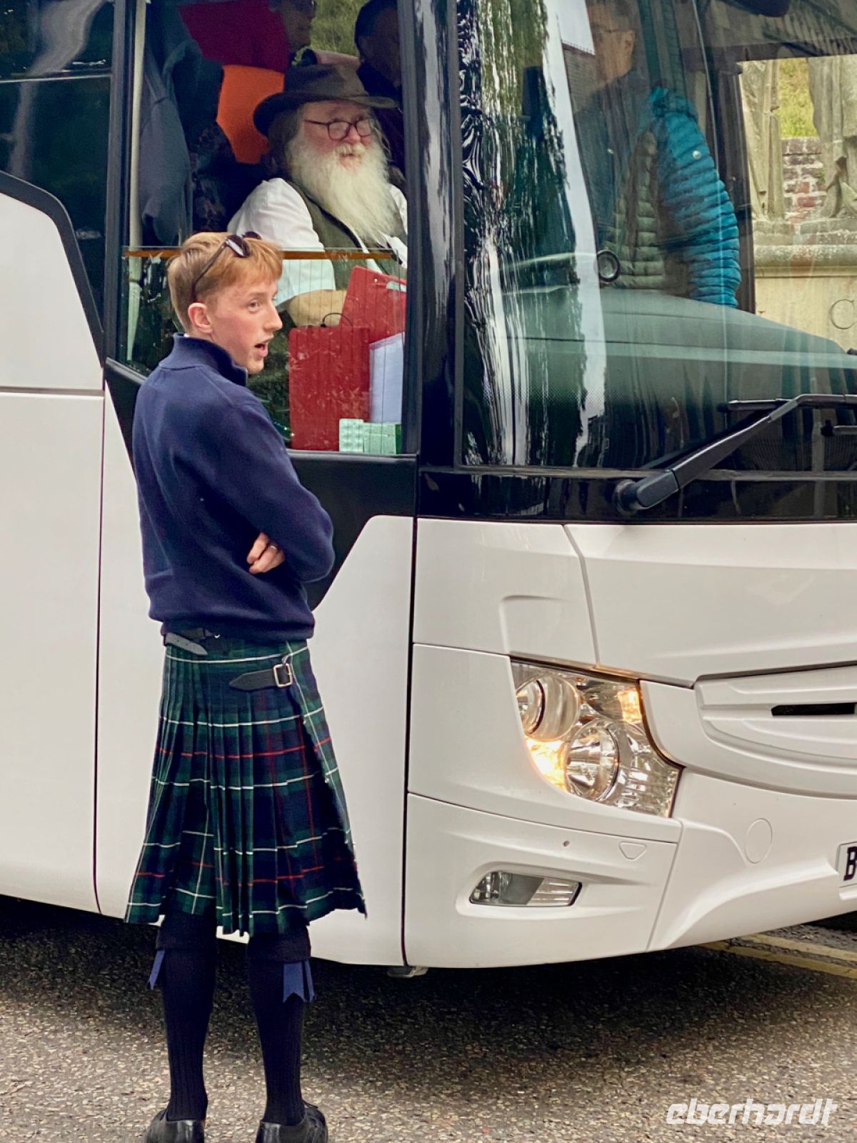 Heute morgens werden wir vom imposantesten Schotten begrüßt, den ein Mensch sich vorstellen kann. In voller schottischer Montur begrüßt uns Bob heute am Bus. Kilt und Weste in Tartan-Muster, Schnallenschuhe und Strümpfe, die schottische Gürteltasche (Sporran) dazu, man muss es erlebt haben, so eindrucksvoll sieht unser Fahrer heute aus.