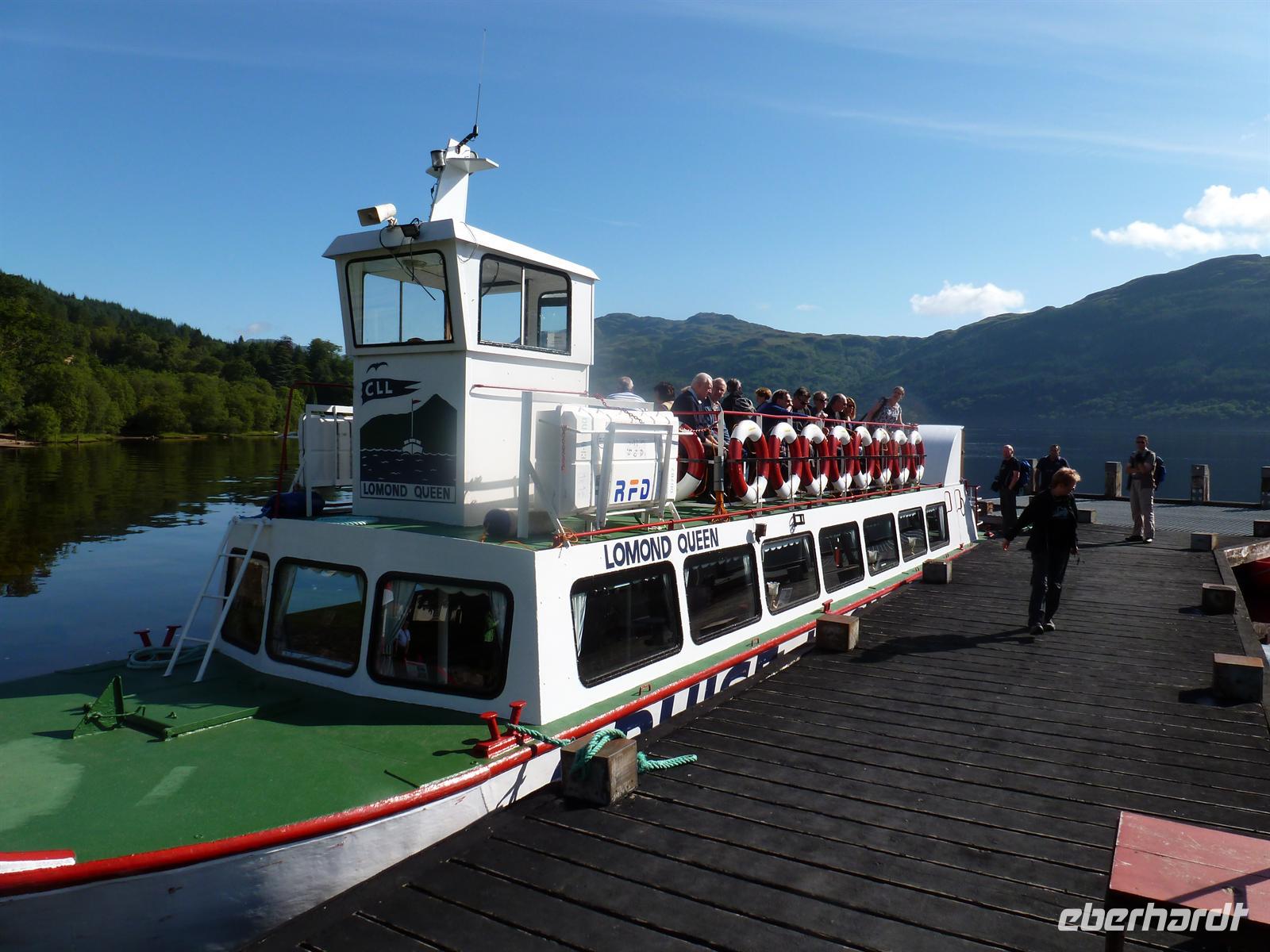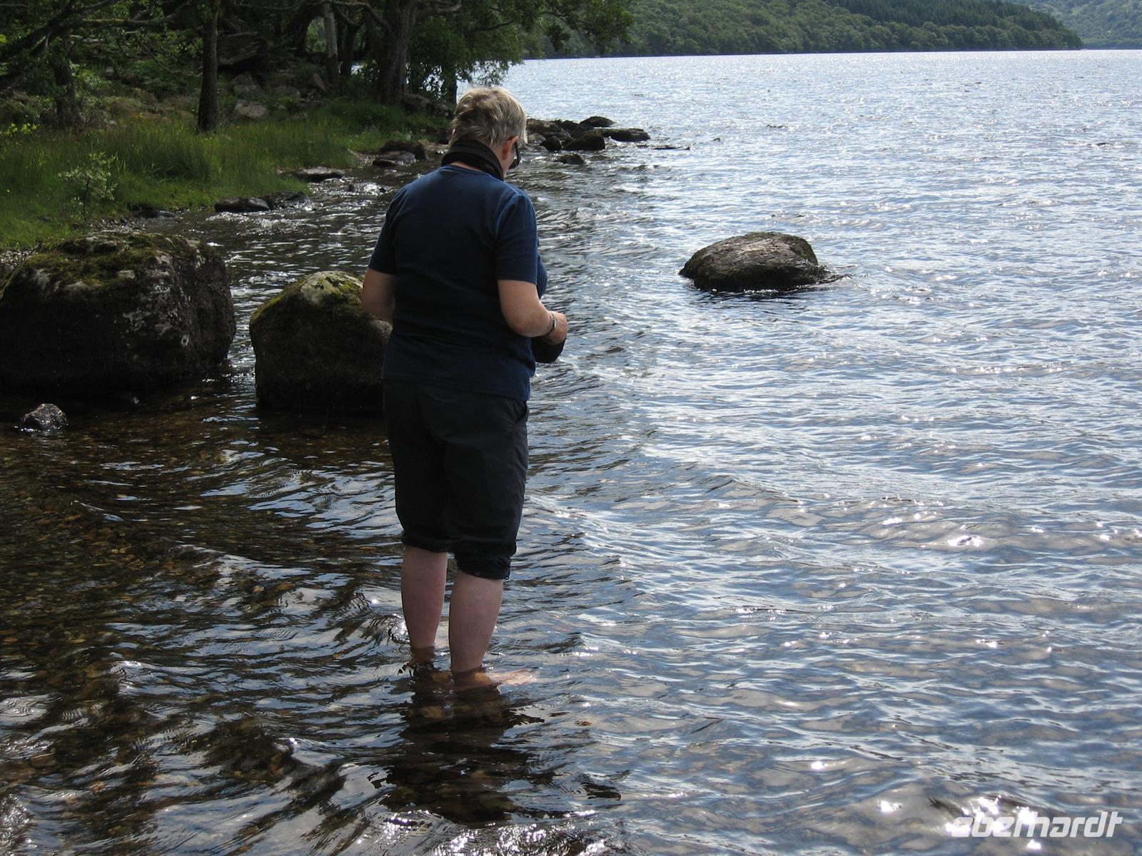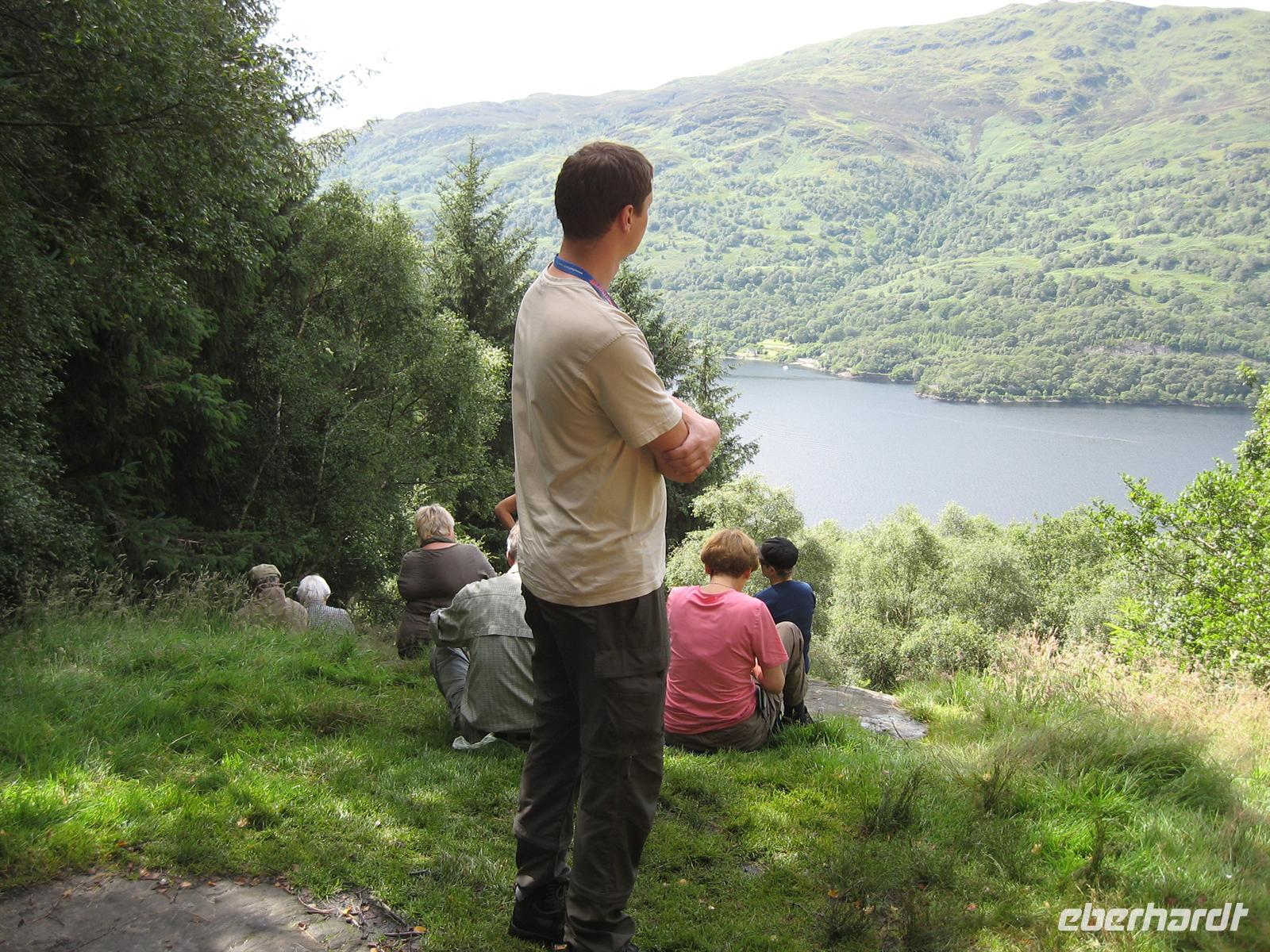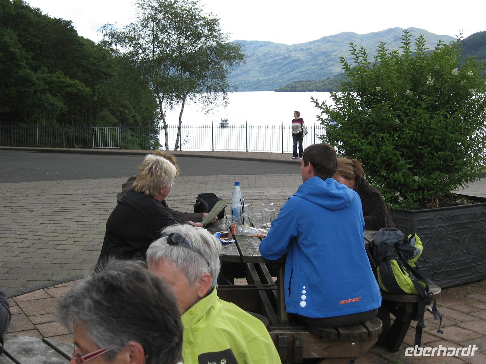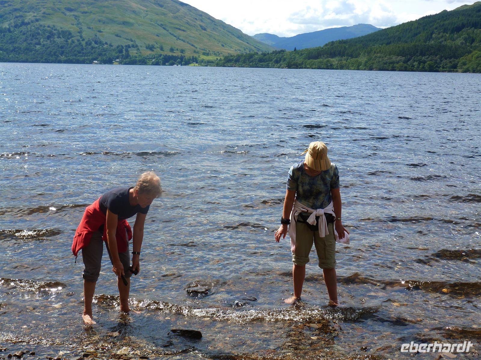 Mit der Fähre fuhren wir von Tarbet über den Loch Lomond, um den sich viele schottische Sagen ragen, nach Rowardennan. Auf der Überfahrt hatten wir die Gelegenheit unsere Blicke über die Ufer und den See schweifen zu lassen. Entlang des West Highland Ways, der sich über 150 km von Glasgow bis nach Fort William zieht, begegneten wir vielen anderen Wanderern und Backpackern. Natürlich hatten wir uns für heute nicht die volle Strecke eingeplant. Gelegentlich pausierten wir um die atemberaubende Natur zu bewundern. Dabei ließ es das Wetter sogar zu, unsere Füße im Loch Lomond zu kühlen. Nach dem wir unser Ziel, das Inversnaid Hotel erreicht hatten, konnten wir noch etwas Zeit bei einem Kaffee oder Bier verbringen, bis uns die Fähre wieder nach Tarbet brachte.