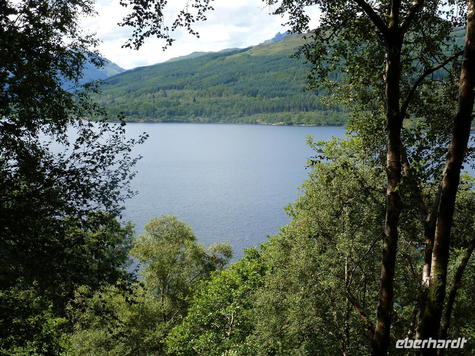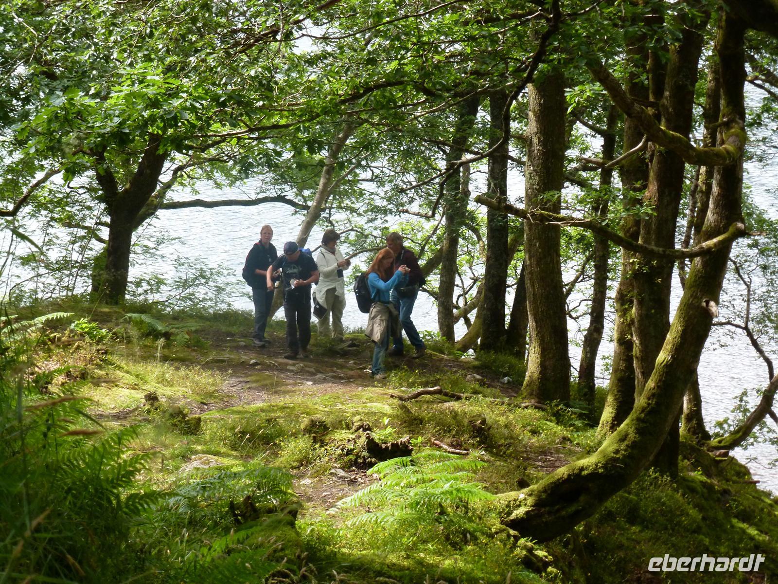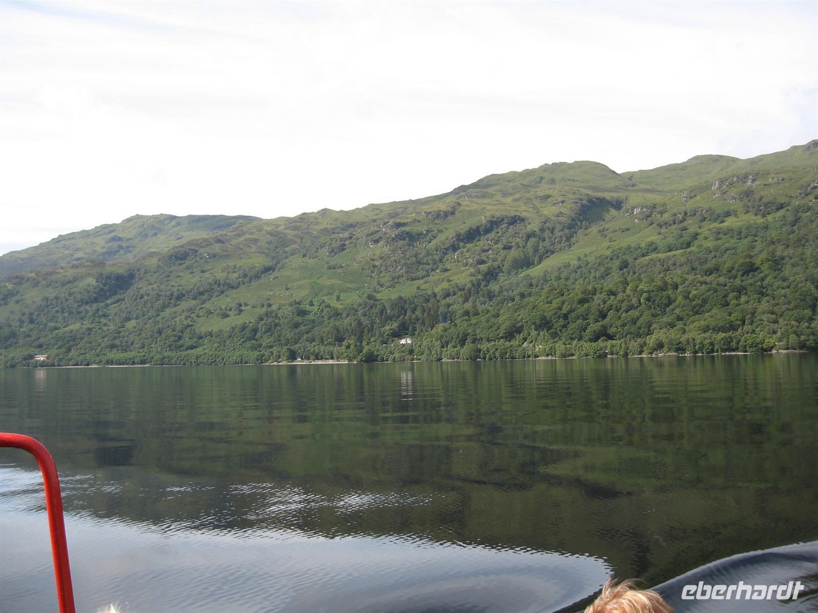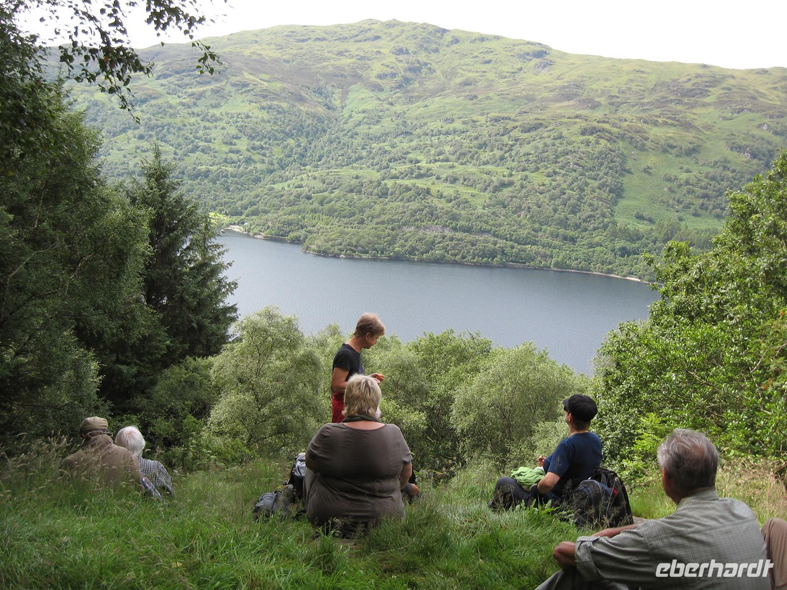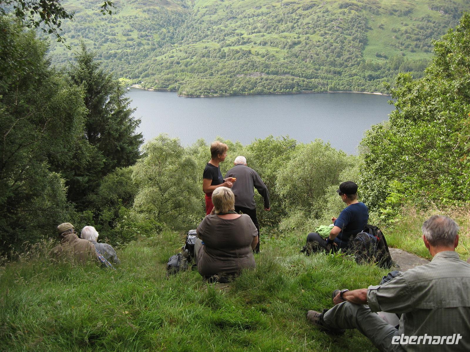 Mit der Fähre fuhren wir von Tarbet über den Loch Lomond, um den sich viele schottische Sagen ragen, nach Rowardennan. Auf der Überfahrt hatten wir die Gelegenheit unsere Blicke über die Ufer und den See schweifen zu lassen. Entlang des West Highland Ways, der sich über 150 km von Glasgow bis nach Fort William zieht, begegneten wir vielen anderen Wanderern und Backpackern. Natürlich hatten wir uns für heute nicht die volle Strecke eingeplant. Gelegentlich pausierten wir um die atemberaubende Natur zu bewundern. Dabei ließ es das Wetter sogar zu, unsere Füße im Loch Lomond zu kühlen. Nach dem wir unser Ziel, das Inversnaid Hotel erreicht hatten, konnten wir noch etwas Zeit bei einem Kaffee oder Bier verbringen, bis uns die Fähre wieder nach Tarbet brachte.