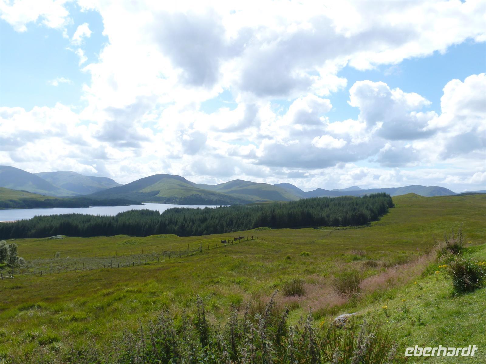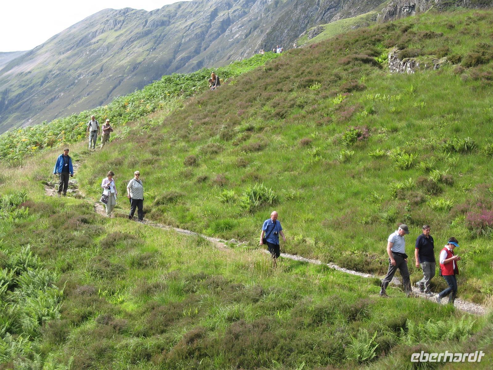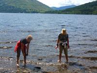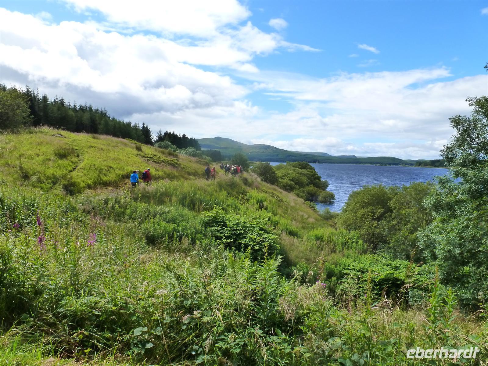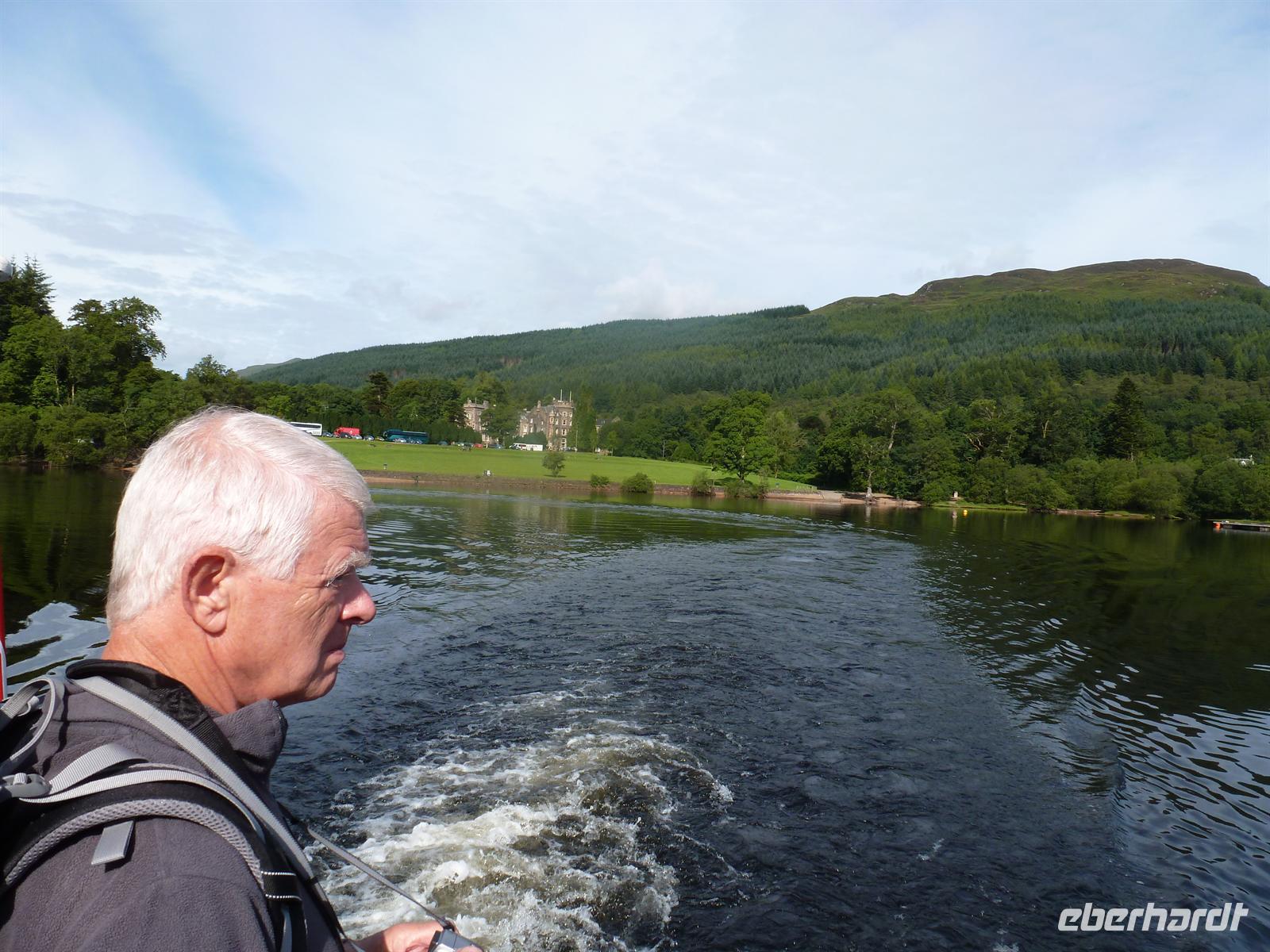 Mit der Fähre fuhren wir von Tarbet über den Loch Lomond, um den sich viele schottische Sagen ragen, nach Rowardennan. Auf der Überfahrt hatten wir die Gelegenheit unsere Blicke über die Ufer und den See schweifen zu lassen. Entlang des West Highland Ways, der sich über 150 km von Glasgow bis nach Fort William zieht, begegneten wir vielen anderen Wanderern und Backpackern. Natürlich hatten wir uns für heute nicht die volle Strecke eingeplant. Gelegentlich pausierten wir um die atemberaubende Natur zu bewundern. Dabei ließ es das Wetter sogar zu, unsere Füße im Loch Lomond zu kühlen. Nach dem wir unser Ziel, das Inversnaid Hotel erreicht hatten, konnten wir noch etwas Zeit bei einem Kaffee oder Bier verbringen, bis uns die Fähre wieder nach Tarbet brachte.