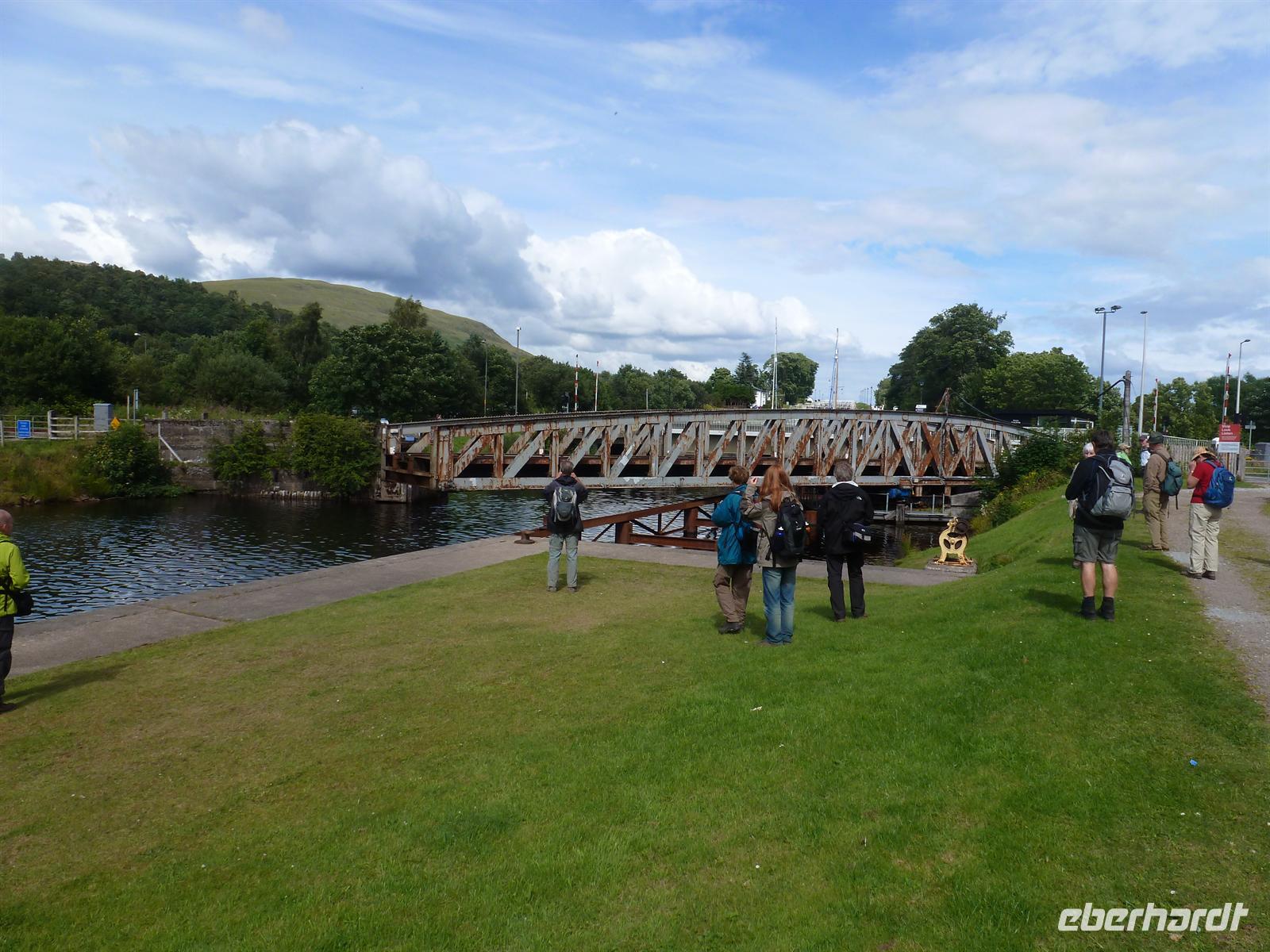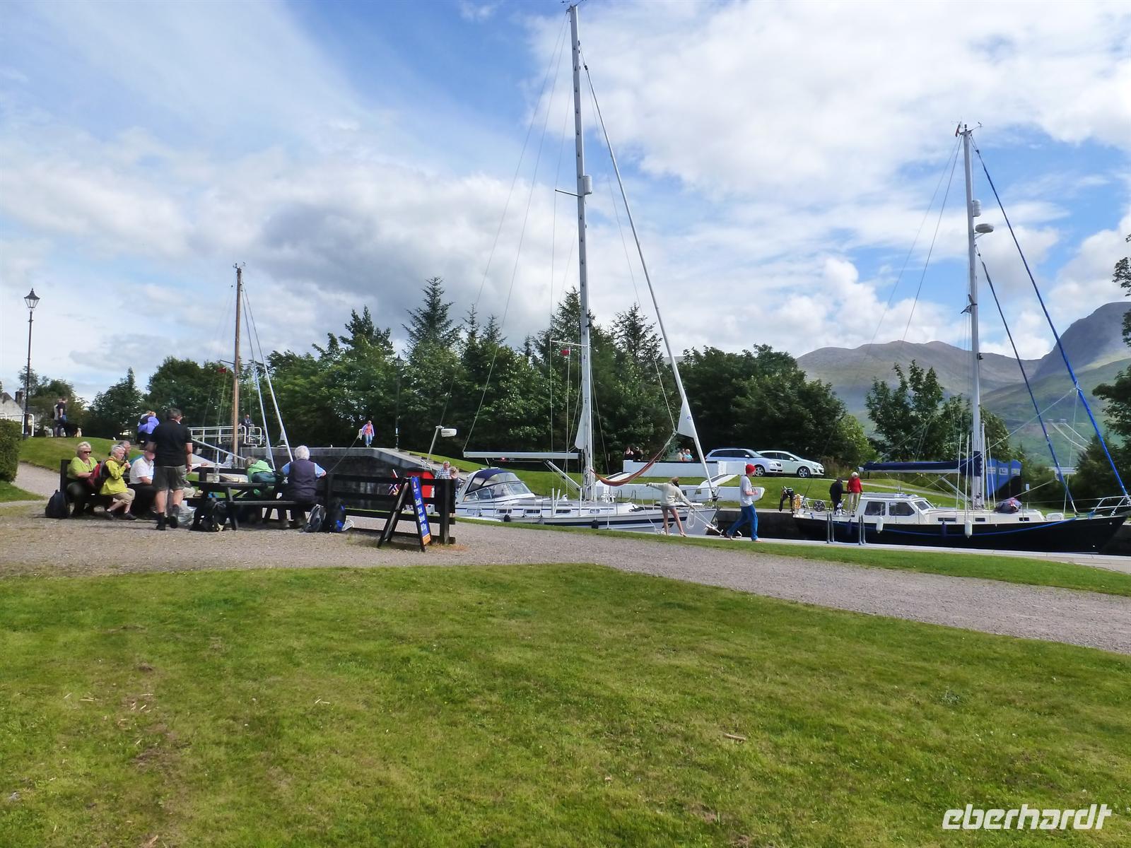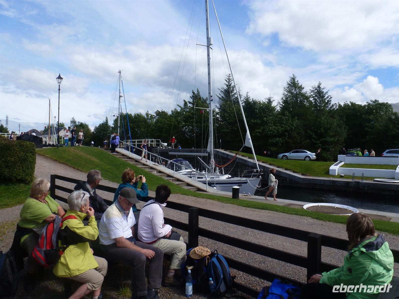 Unser erster Halt galt heute einem Aussichtspunkt, an dem wir ein Gruppenfoto vor dem Ben Nevis schießen konnten. Der höchste Berg Großbritanniens, 1343 m hoch, war noch leicht von einer Wolke verhangen, die sich im Laufe des Tages aber wieder auflöste. Danach begannen wir unsere Wanderung. Der befestigte Weg bot keine nennenswerten Schwierigkeiten, was uns die Landschaft und die vorbeiziehenden Schiffe zu beobachten ermöglichte. Unterwegs erklärte uns Herr Kuchenbecker noch die Vorgehensweise beim Bau des Kanales und zeigte uns ein Aquadukt. An der Schleusentreppe, welche Neptun Staircase genannt wird, bereiteten Herr Kuchenbecker und ich ein kleines Picknick für unsere Gäste vor. Es gab frische Baguettes, Cheddar, Lachs, Tomaten, Kekse und andere Leckereien.