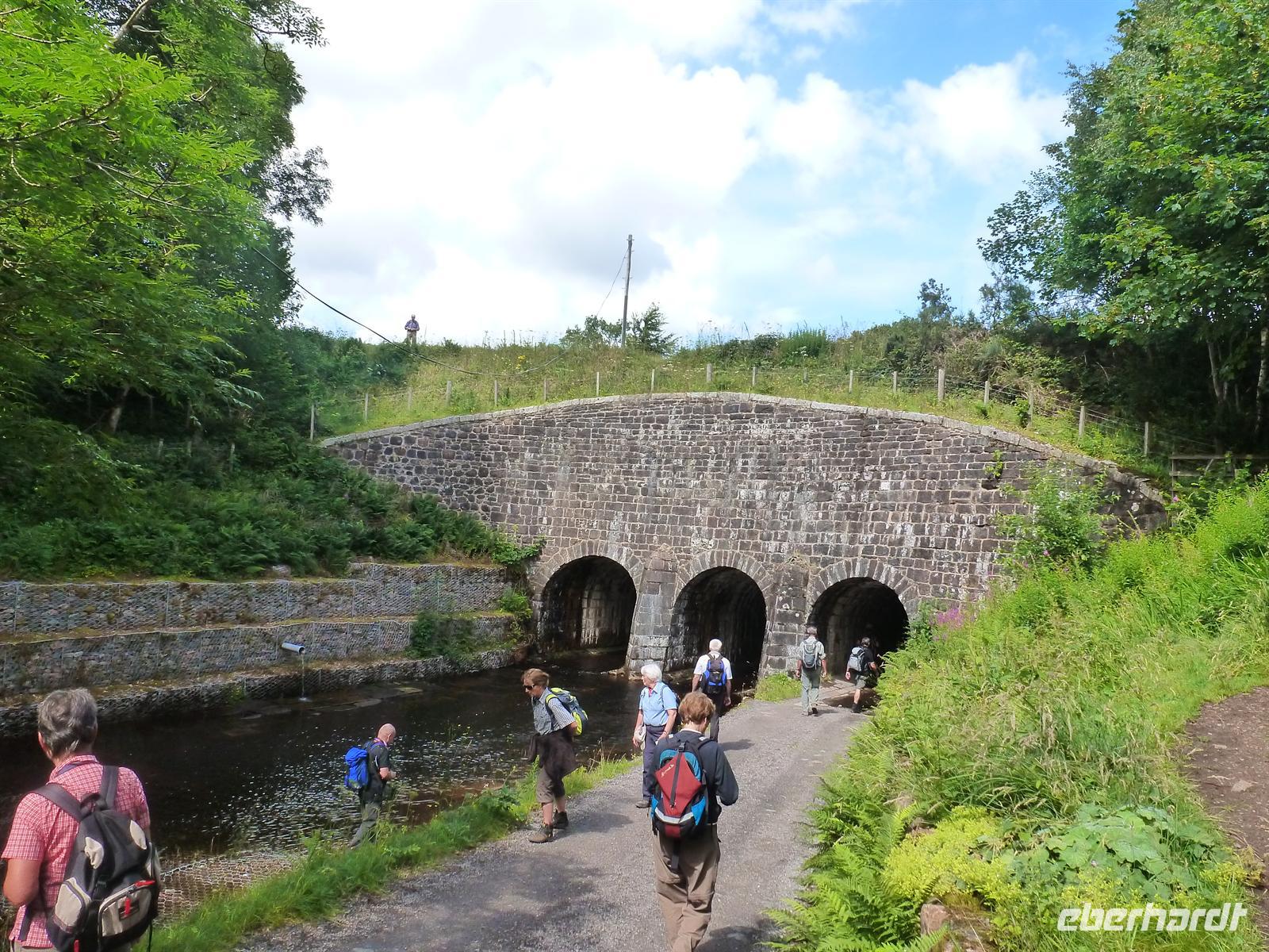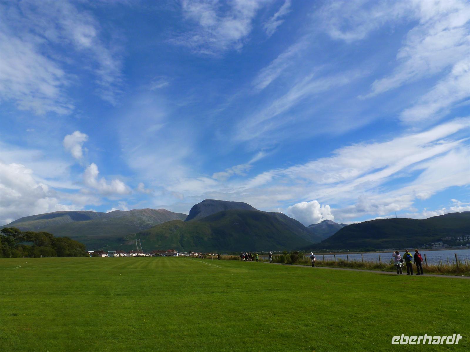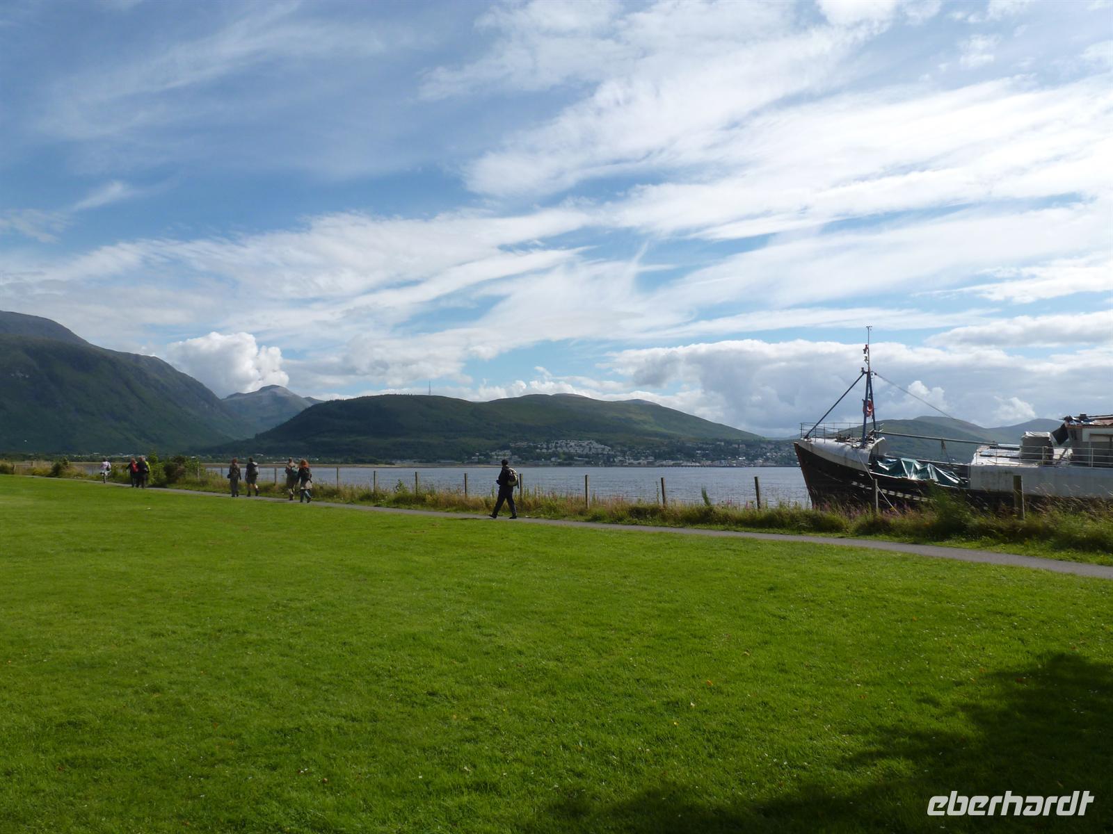 Unser erster Halt galt heute einem Aussichtspunkt, an dem wir ein Gruppenfoto vor dem Ben Nevis schießen konnten. Der höchste Berg Großbritanniens, 1343 m hoch, war noch leicht von einer Wolke verhangen, die sich im Laufe des Tages aber wieder auflöste. Danach begannen wir unsere Wanderung. Der befestigte Weg bot keine nennenswerten Schwierigkeiten, was uns die Landschaft und die vorbeiziehenden Schiffe zu beobachten ermöglichte. Unterwegs erklärte uns Herr Kuchenbecker noch die Vorgehensweise beim Bau des Kanales und zeigte uns ein Aquadukt. An der Schleusentreppe, welche Neptun Staircase genannt wird, bereiteten Herr Kuchenbecker und ich ein kleines Picknick für unsere Gäste vor. Es gab frische Baguettes, Cheddar, Lachs, Tomaten, Kekse und andere Leckereien.