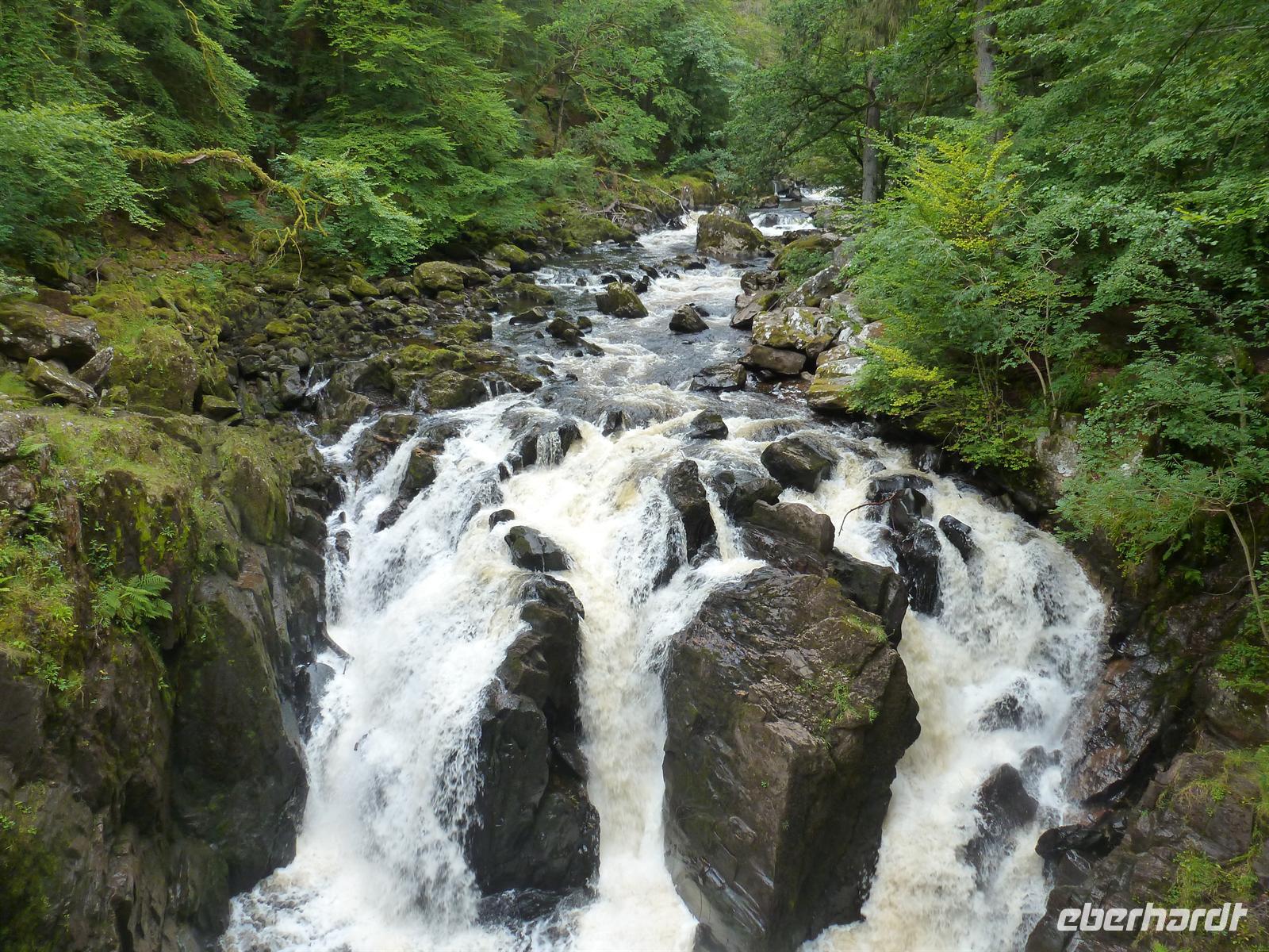Heute verließen wir unser Hotel in Aviemore und fuhren nach Edinburgh. Auf dem Weg dorthin machten wir zunächst halt am Queens View, einem Aussichtspunkt über dem Loch Tummel, welchen schon die eine oder andere Queen bewundert haben soll. Anschließend fuhren wir nach Dunkeld, wo wir eine kleine Wanderung absolvierten. Diese Wanderung ging durch das Waldgebiet Hermitage. Der Weg selbst unterteilte sich in verschiedene Abschnitte: Entlang des Flusses Tay, durch einen Douglasienwald und bis zu Ossian’s Hall. Der schwierigste Teil war ein relativ steiler Aufstieg, aber auch den schaffte jeder ohne größere Probleme. Oben angekommen suchte sich anschließend jeder einen Platz, an dem er sich wohl fühlte und aß etwas. Unterwegs konnten wir außerdem einem spektakulären Naturschauspiel zusehen, als Lachse versuchten einen Wasserfall zu erklimmen. Der kleine Ort Dunkeld selbst war ebenfalls einen Besuch wert. Die zweigeteilte Kathedrale, bei der eine Seite noch genutzt wird und die andere als Ruine angrenzt, faszinierte mit ihren unterschiedlichen Bauweisen. Im Ort selbst nutzten wir die Zeit für einen Kaffee und für die vielen kleinen Geschäfte. Am späten Nachmittag reisten wir weiter nach Edinburgh. Zwischendurch legten wir noch einen kleinen Stopp ein, um die Brücken über den Firth of Forth zu fotografieren. Am frühen Abend checkten wir in der Mercure Hotel auf der Princes Street in Edinburgh ein.