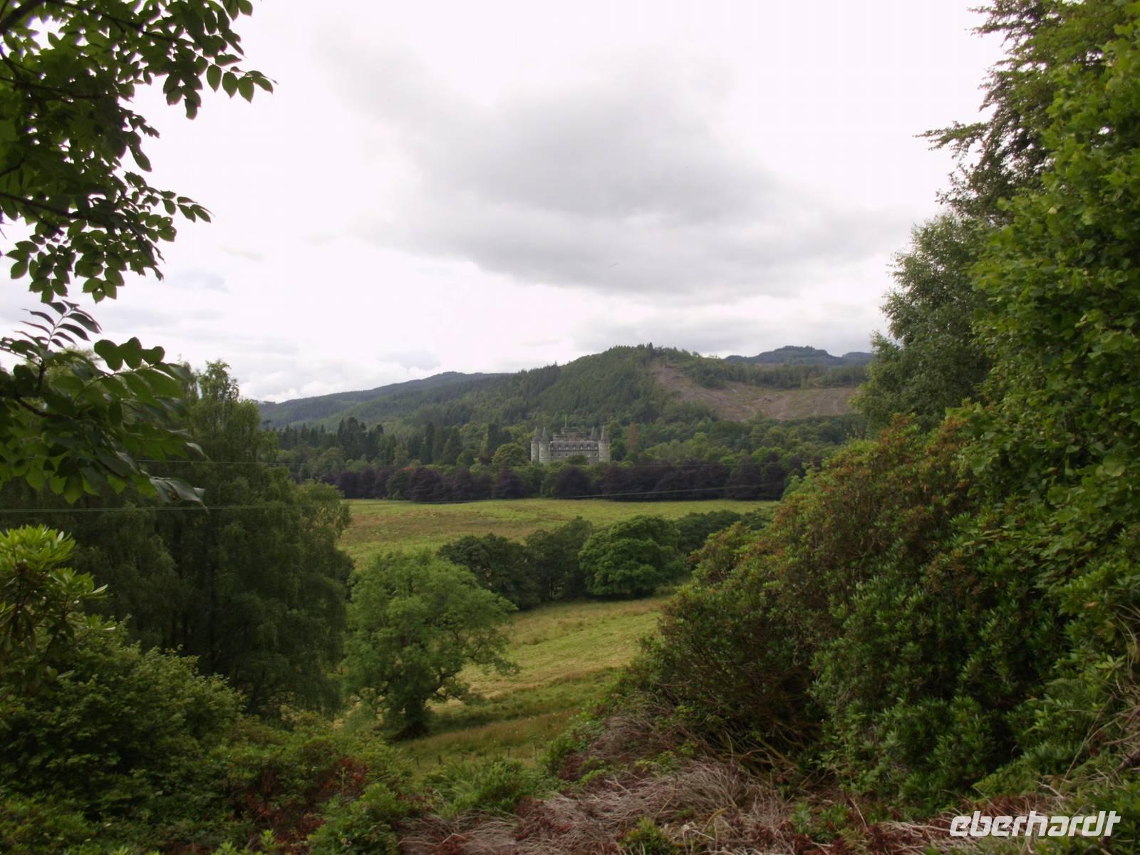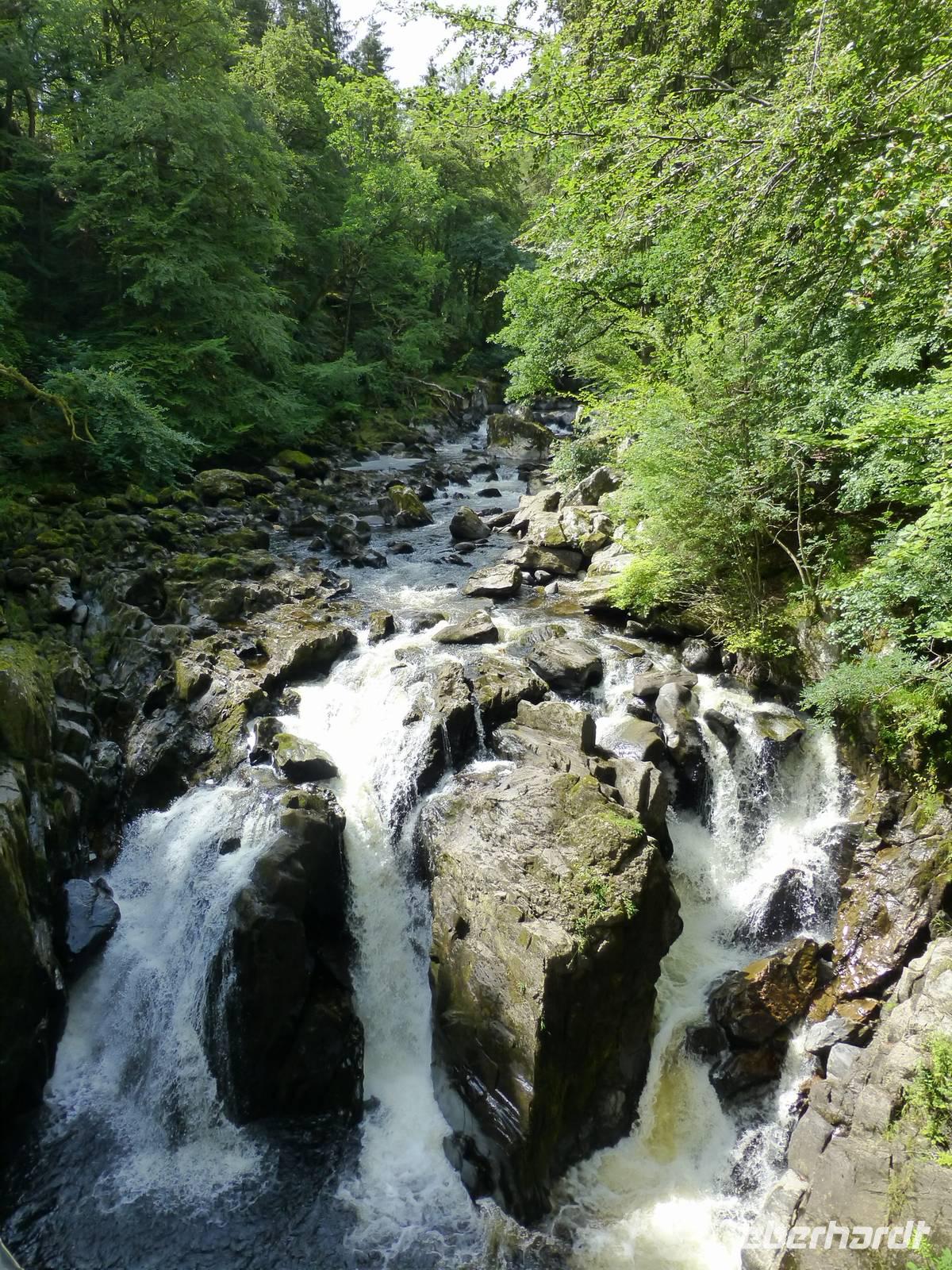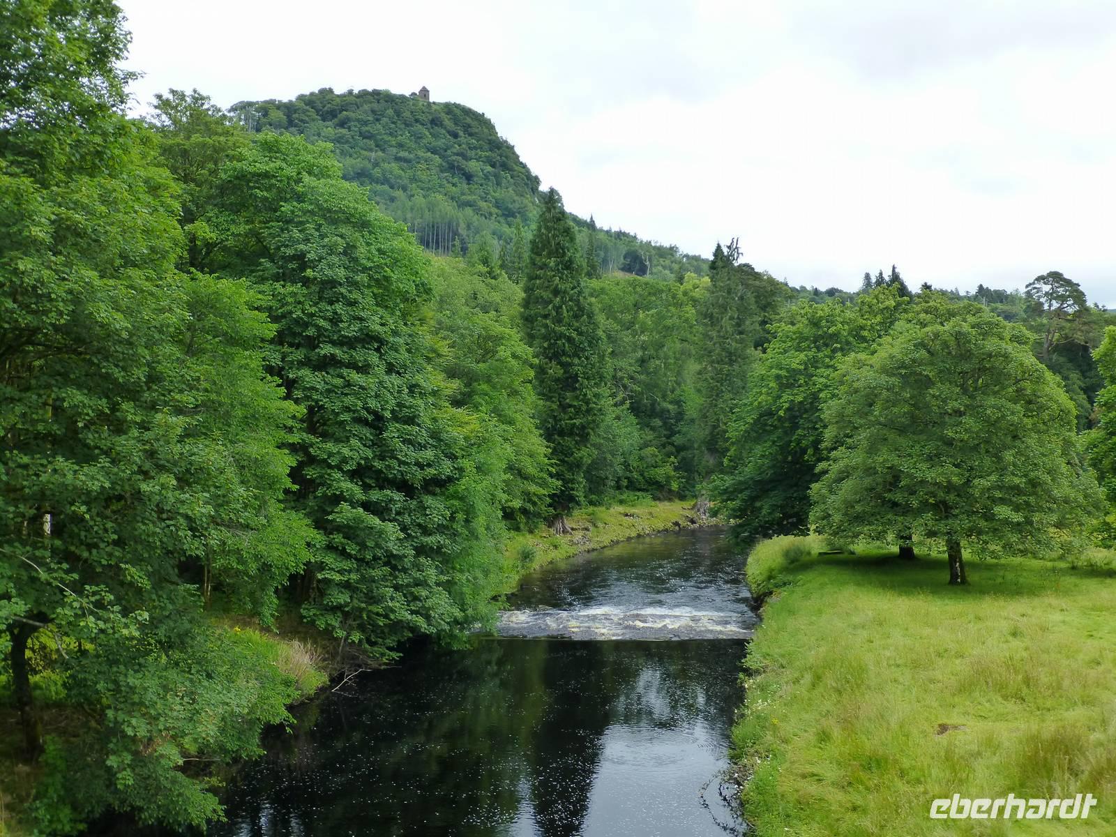 Ganz in der Nähe lag auch das Blair Castle, welches dem Grafen von Atholl gehört, der einzige Brite, der eine Privatarmee unterhalten darf. Es war Queen Victoria, die dem Vorfahren des jetzigen Grafen dieses Recht gewährte, gewissermaßen als Entschädigung für das Leid welches den Schotten von Seiten Englands angediehen wurde.Im Anschluss also an den Besuch des Queen's View ging es durch die Hermitage, einen Wald mit beeindruckenden Douglasien. Diese aus dem amerikanischen Westen stammende Fichtenart erhielt ihren Namen nach dem schottischen Botaniker David Douglas. Direkt über einem Wasserfall - in dem allerdings nicht die versprochenen Lachse sprangen - stand, im neoklassizistischen Stil errichtet, Ossian's Hall.