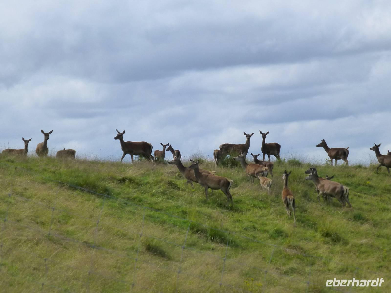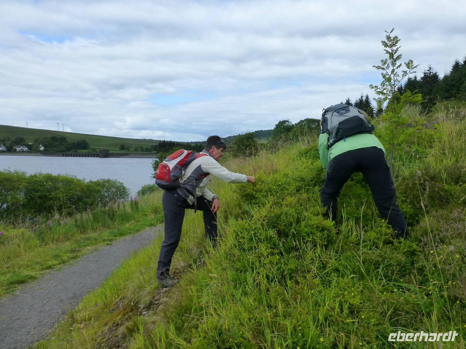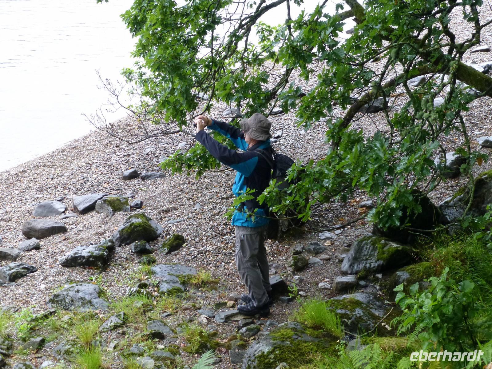 Anschließend führte uns unser Weg durch ein Hirschgehege. Die meisten Kühe flohen vor uns, zwei aber waren neugierig und näherten sich uns, begleitet von ihren Kälbern. Ein einzelner Hirsch war durch sein Geweih zu erkennen, der Rest war durch den Hügel auf dem er dich befand, verborgen. Er scheint im Gras, wiederkäuend unter dem Schatten einer Eiche gelegen zu haben.Auf dem Rückweg machten wir dann wieder am Loch Oggie einen ausgedehnten Halt, den wir dazu benutzten, auf den Geburtstag des Namensspenders, der war nämlich gerade und auch Anlass für die Taufe des Sees, einen Likör aus Whisky, Honig und Kräutern bzw. Wacholder zu trinken. Einige Damen hatten derweil einen Geburtstagsstrauß gepflückt und eine Blumenkrone für das Geburtstagskind geflochten. Leicht whiskylikörselig wurden Geburtstagsständchen für unseren Busfahrer geübt und Wander- und Bergmannslieder intoniert.Man darf wohl sagen, dass Oggie von Gesang, Strauß und Kranz wirklich gerührt war.Technische Daten: Schritte: 29.052 - km: 17,4 - kcal: 871,5