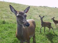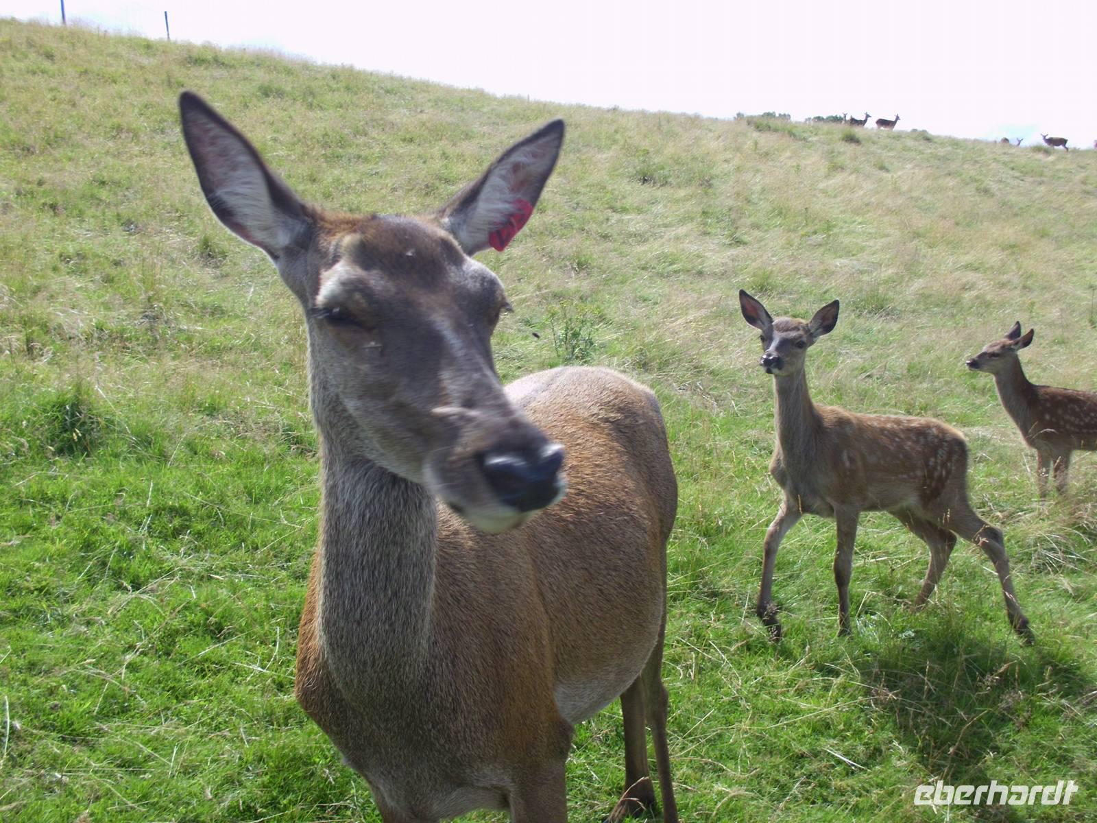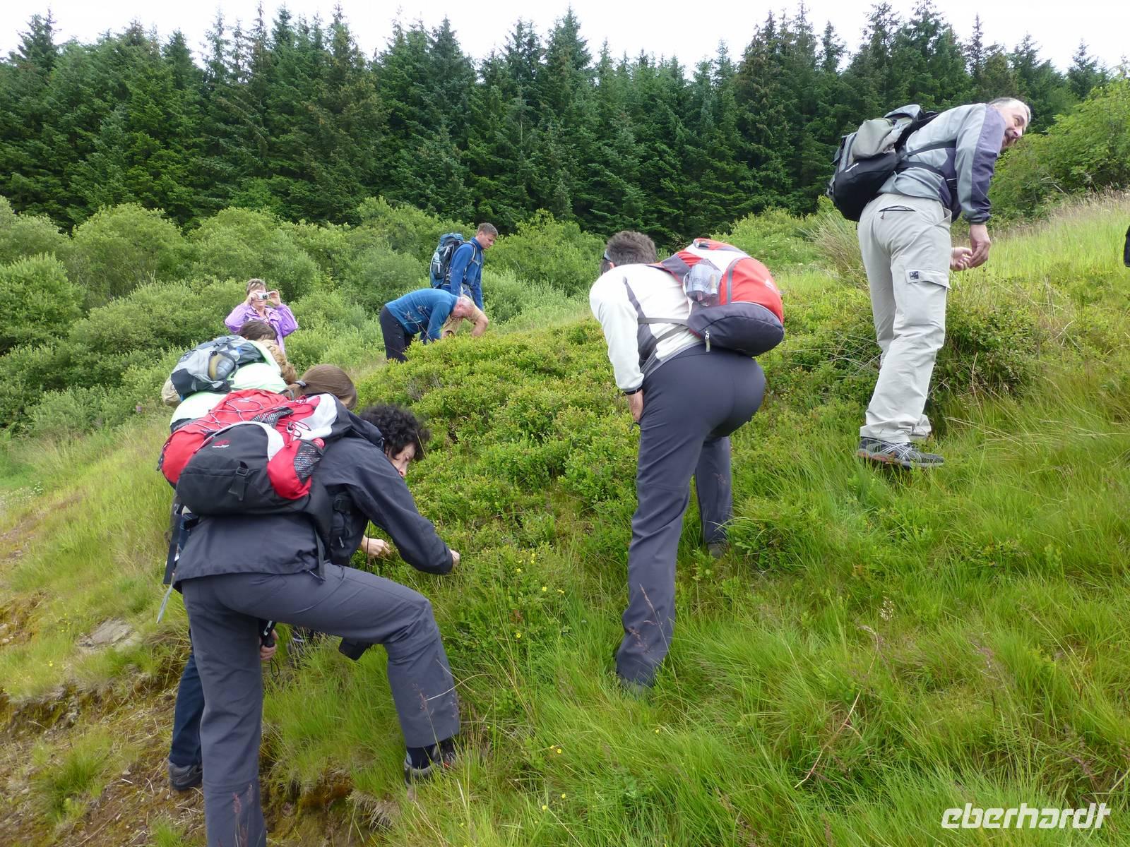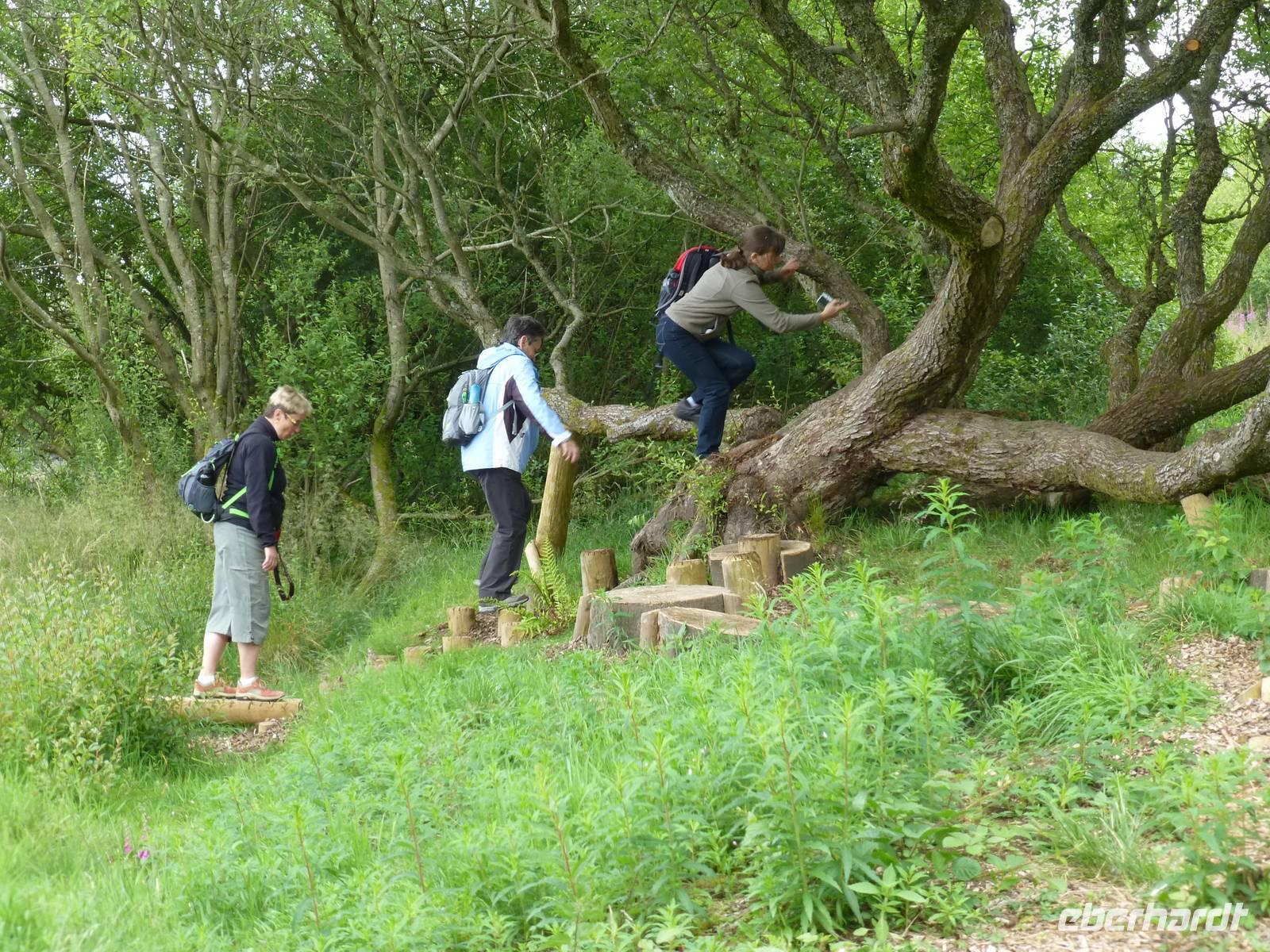 Anschließend führte uns unser Weg durch ein Hirschgehege. Die meisten Kühe flohen vor uns, zwei aber waren neugierig und näherten sich uns, begleitet von ihren Kälbern. Ein einzelner Hirsch war durch sein Geweih zu erkennen, der Rest war durch den Hügel auf dem er dich befand, verborgen. Er scheint im Gras, wiederkäuend unter dem Schatten einer Eiche gelegen zu haben.Auf dem Rückweg machten wir dann wieder am Loch Oggie einen ausgedehnten Halt, den wir dazu benutzten, auf den Geburtstag des Namensspenders, der war nämlich gerade und auch Anlass für die Taufe des Sees, einen Likör aus Whisky, Honig und Kräutern bzw. Wacholder zu trinken. Einige Damen hatten derweil einen Geburtstagsstrauß gepflückt und eine Blumenkrone für das Geburtstagskind geflochten. Leicht whiskylikörselig wurden Geburtstagsständchen für unseren Busfahrer geübt und Wander- und Bergmannslieder intoniert.Man darf wohl sagen, dass Oggie von Gesang, Strauß und Kranz wirklich gerührt war.Technische Daten: Schritte: 29.052 - km: 17,4 - kcal: 871,5