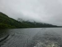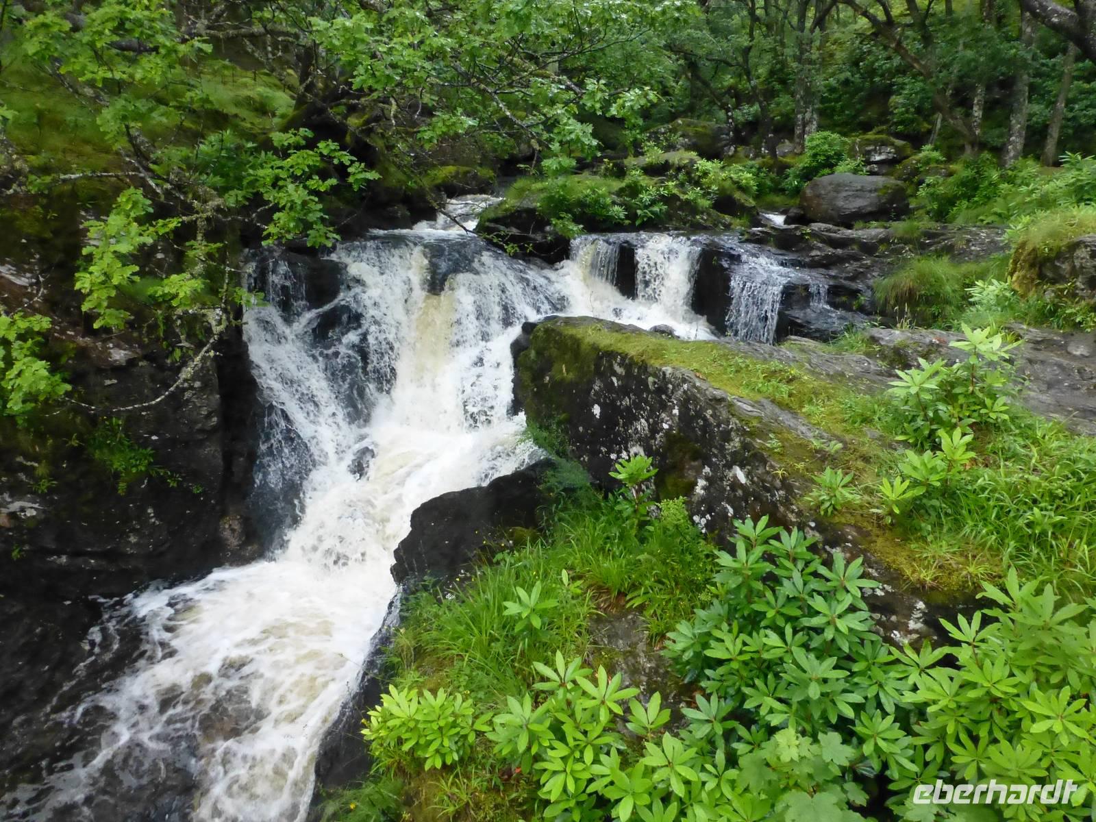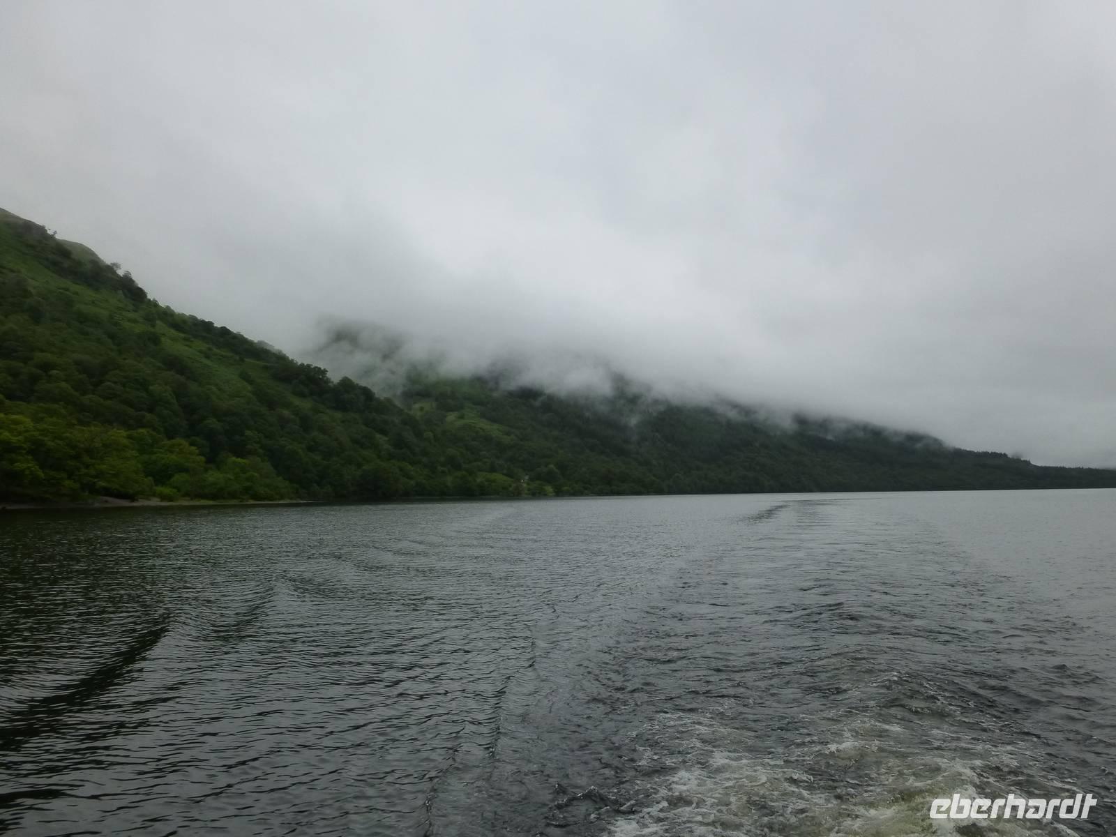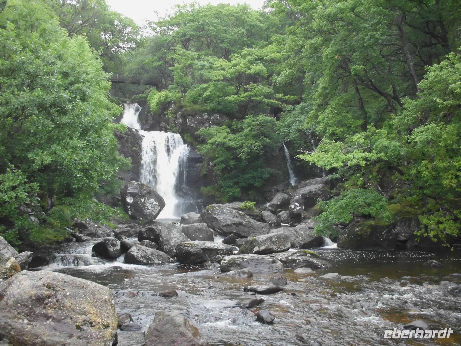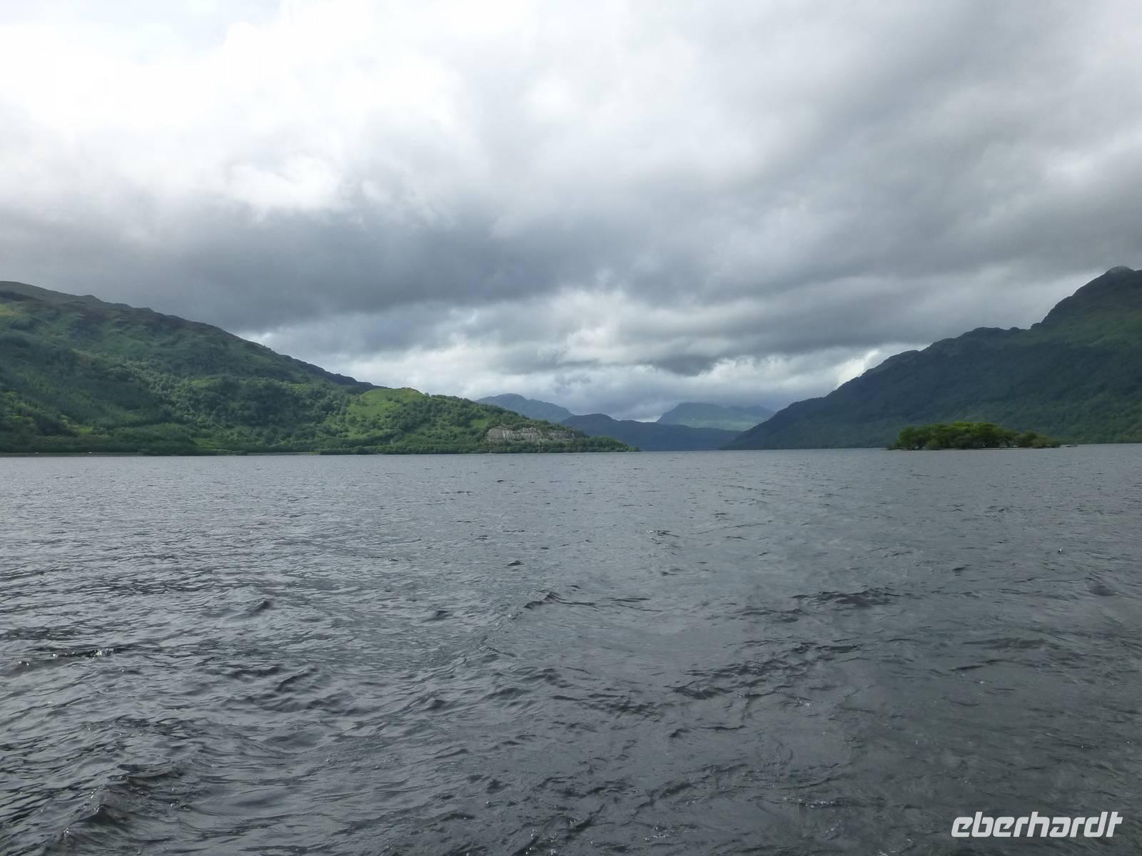 Von Drymen, unserem bisherigen Übernachtungsort aus, nahmen wir die High Road an die bonnie, bonnie banks of Loch Lomond, um von Tarbet, dem Ort der Landenge zwischen dem binnenländischen Loch Lomond und dem Sealoch Loch Long aus über den Lomond überzusetzen und von Inversnaid nach Rowardennan zu marschieren.Die Bootstour war ganz vergnüglich und so landeten wir am Inversnaid Hotel, wo zunächst ein allgemeiner Besuch der „Sweet harmony" anstand. Diejenigen mit weniger Harmoniebedürfniss schauten sich den Inversnaid Wasserfall näher an.Die sich nun anschließende Wanderung führte am wechselvollen und dicht bewachsenen Ostufer des Loch Lomond entlang. Das Lied von den „bonnie banks of Loch Lomond" log nicht. Etwas getrübt wurde die Freude durch den heftigen Regenguss, der uns die letzte halbe Stunde des Weges begleitete. Hatten die vorherigen Drizzels uns nichts anhaben können, so durchnässte dieser Regen uns doch total. Zum Glück stimmte die Vorbereitung und so war bald, abgesehen von vollgelaufenen Wanderschuhen, alles wieder trocken.Auf der Wanderung kamen wir an einigen Grundmauern verlassener Gehöfte vorbei. Ob eines davon das Gehöft Craigrostan war, welches der Sheriff Graham of Killearn niederbrannte, als er Rob Roy, den er verhaften sollte, nicht antraf, ist dem Verfasser dieser Zeilen nicht