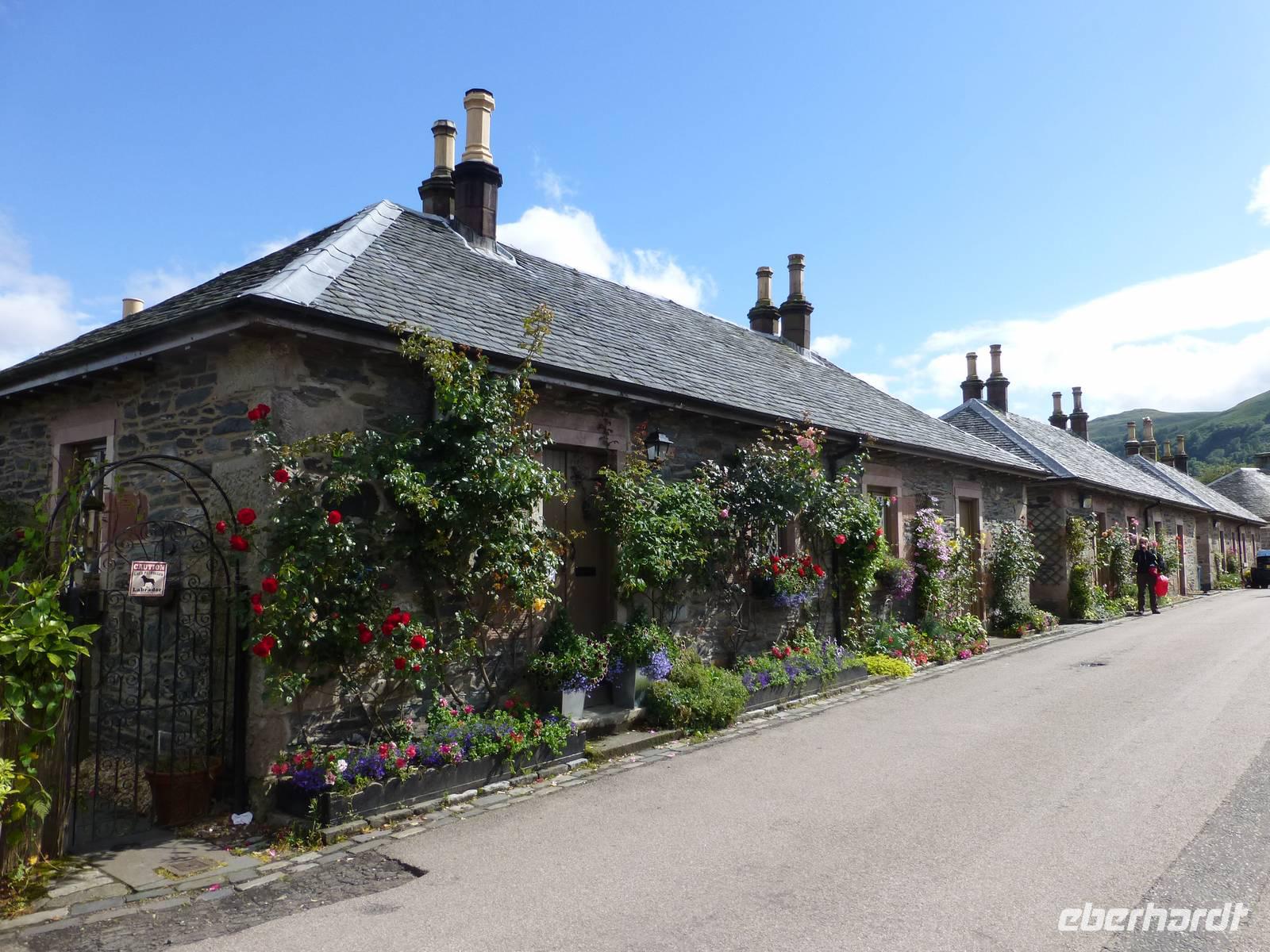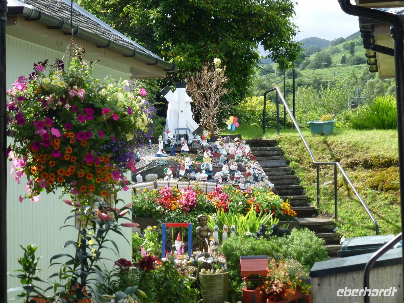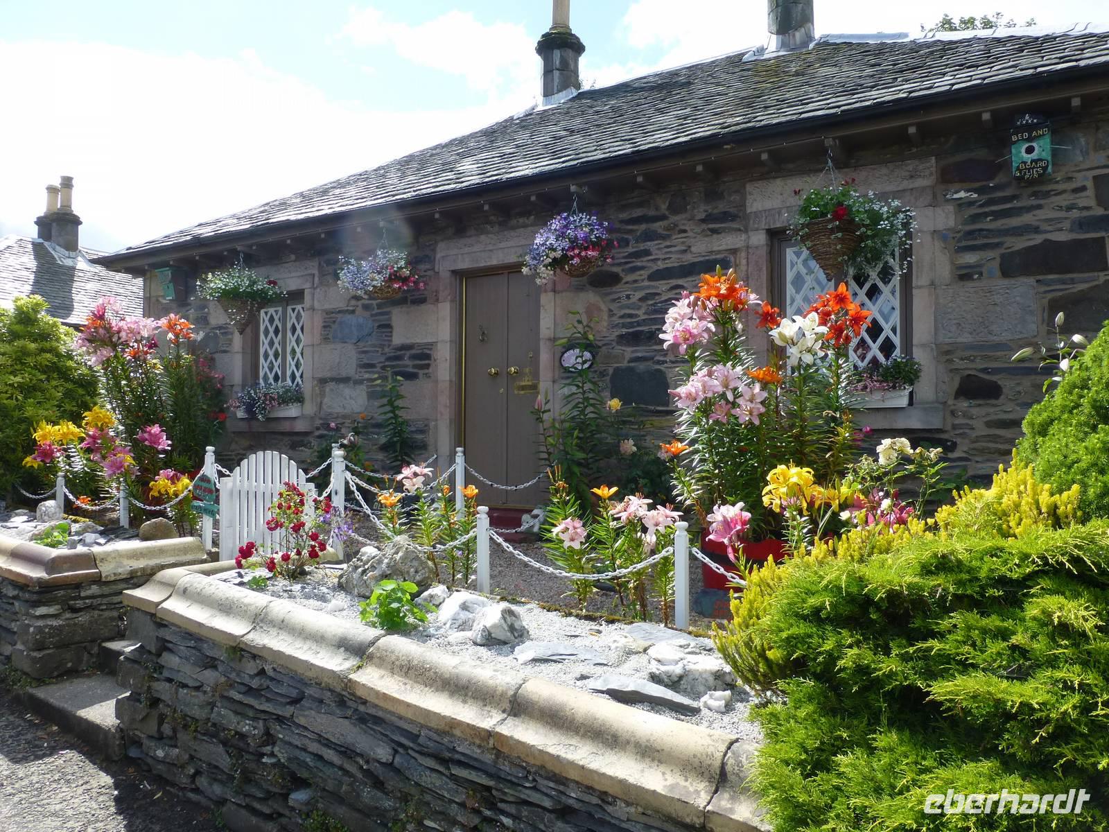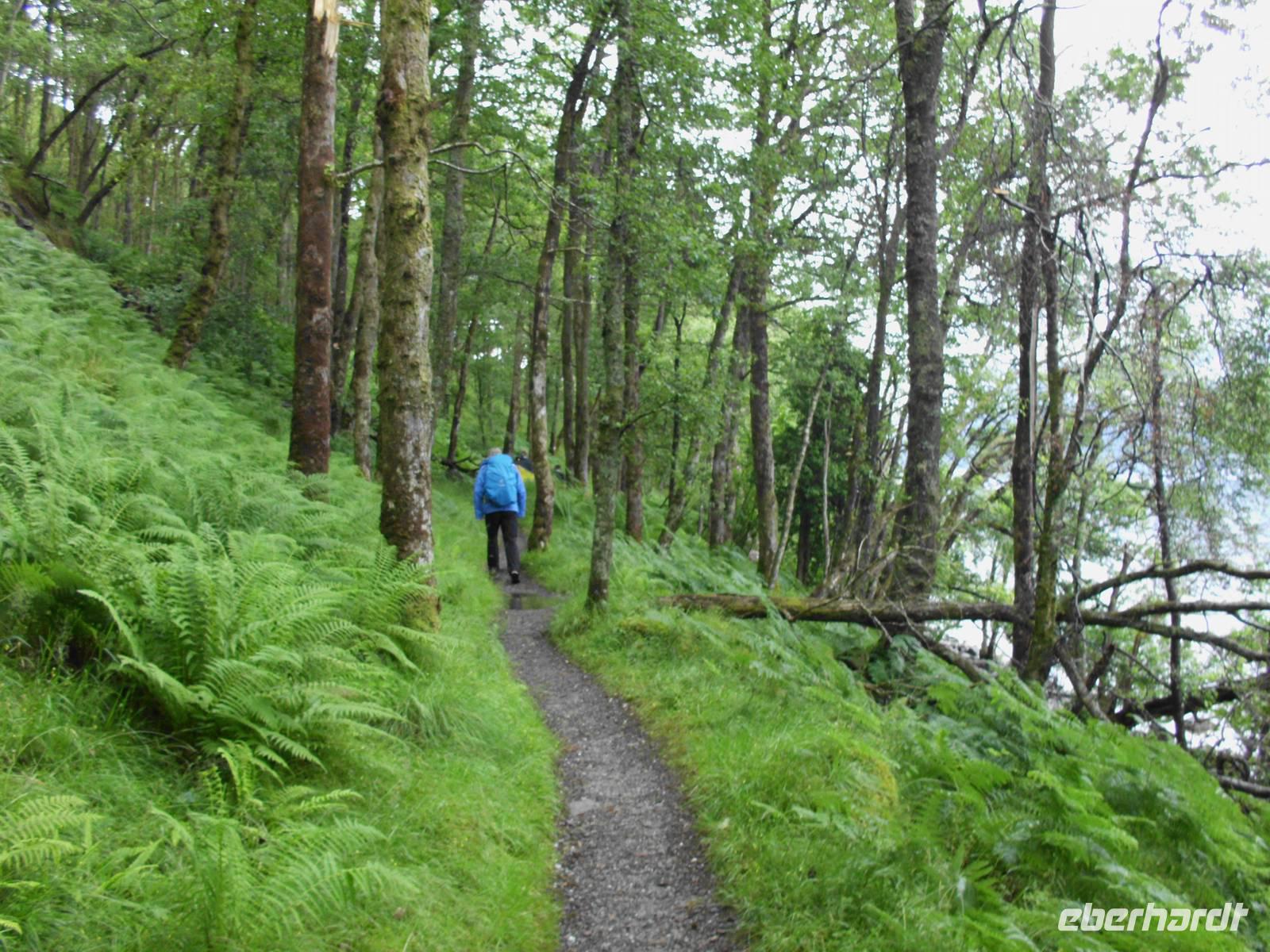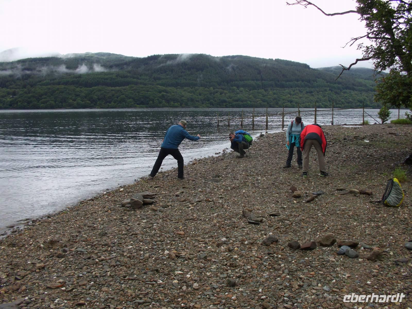 Anders als im bekannten Hollywood-Streifen, in dem ein sehr edler Rob Roy alias Liam Neeson, kam Rob Roy allerdings nicht zu spät, um seiner Frau zur Hilfe zu eilen, sondern der Viehdieb hatte das Haus verlassen, um seiner Verhaftung zu entgehen.Auffällig entlang der Wegstrecke waren die z.T. sehr großen Quartzbrocken, die man allenthalben sehen konnte.An einer Stelle, an welcher der West Highland Trail, auf dessen Teilstück wir ja hier wanderten, über den Strand führte, entpuppten sich sämtliche männlichen Teilnehmer der Reise als große Kinder, die nach flachen Steinen suchten, um die über den ruhigen See springen zu lassen. Man darf das wohl als Zeichen dafür werten, dass alle sich in der Gruppe wohl fühlten, denn sonst hätte sich sicher niemand so geöffnet.Die Ziegen, denen wir begegneten, müssen wohl als Feral Goats angesprochenwerden, verwilderten Hausziegen, welche ein lebendiges Zeugnis der Highland Clearances, der ethnischen Säuberung des Hochlandes zwischen 1692 (Massakervon Glen Coe) und ca. 1830 darstellen.In Rowardennan nahm uns eine Fähre wieder auf, dir uns nicht zurück nach Tarbet führte sondern nach Luss, welches seinen alten gälischen Namen Clachan Dubh (dunkles Dorf) wirklich nicht verdient hat. Uns präsentierte es sich als blumengeschmückt und bunt.Der oben angesprochene Regen hatte aber auch sein Gutes: Offensichtlich hatten wir in dieser einen halben Stunde unser Regen-Soll für die ganze Reise abbekommen, so dass es in den kommenden Tagen so gut wie gar nicht regnete und wie regelmäßigen Sonnenschein hatten (selbst Sonnenbrände wurden vermeldet).Technische Daten: