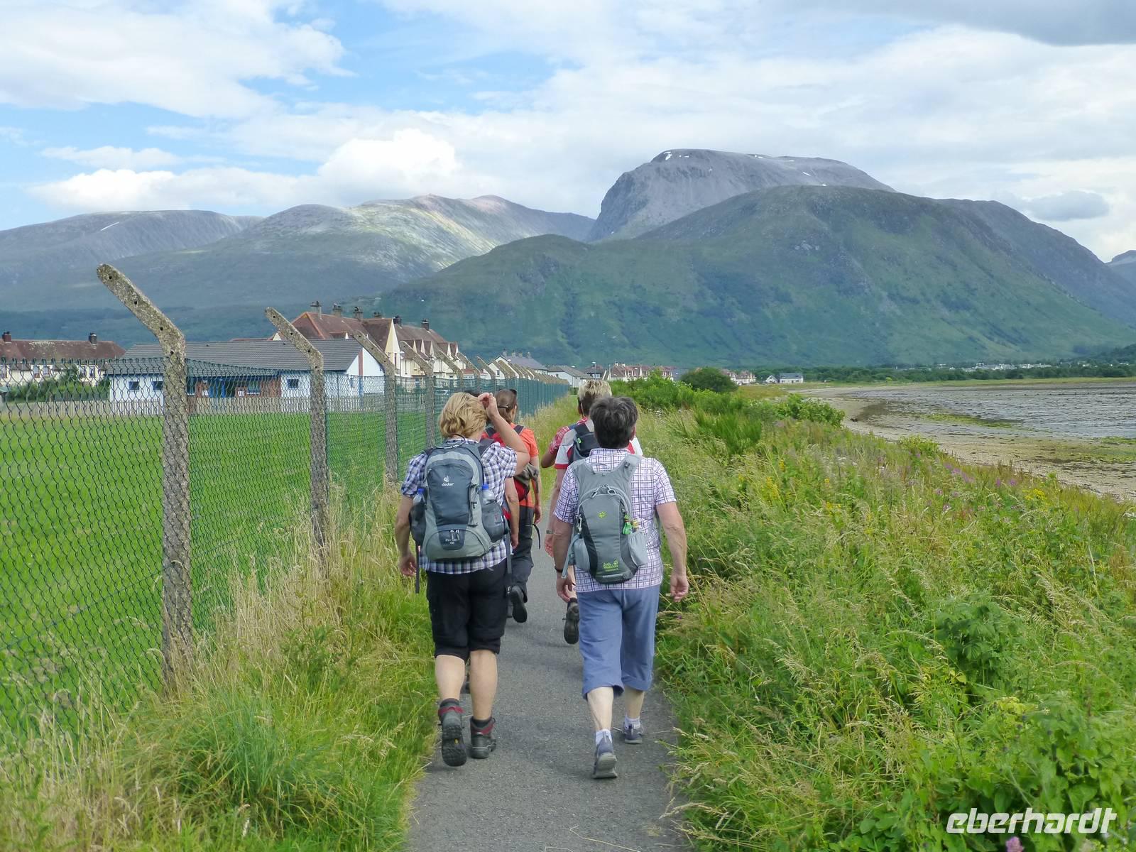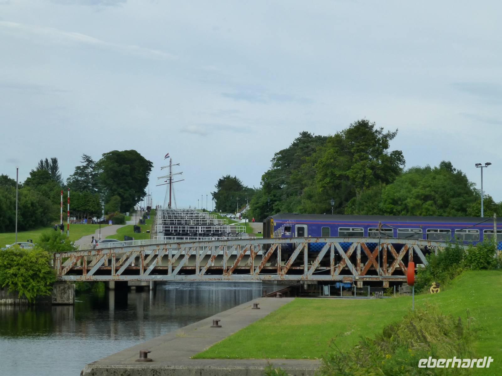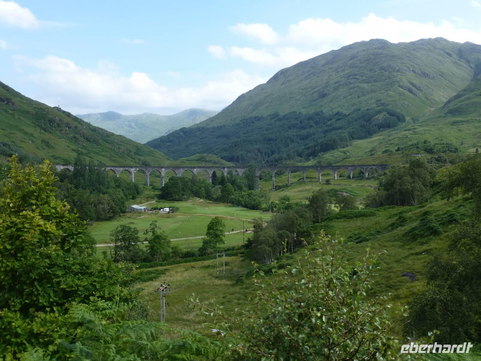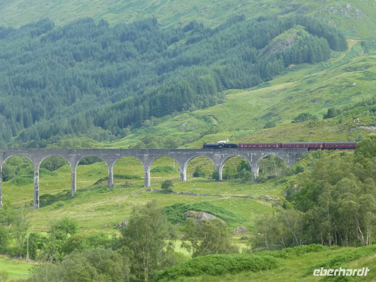 Der Tag begann zauberhaft mit dem Jakobite- bzw. Hogwarts-Express und dem Besuch des Glenfinnian-Monuments, wo Bonnie Prince Charly, aus Frankreich gekommen, sein Erbe zurückzuerobern, seine Standarte aufstellte, um die Clans zu den Waffen zu rufen. Von dort ging es, über Spea Bridge, am Denkmal für die Commandos vorbei, nach Gairlochy, um von dort aus das Teilstück des Caledonian Canal nach Fort William, respektive Banavie zurückzuwandern.Obwohl die Streckenführung recht angenehm war - es handelte sich um eine ebene Strecke mit leichten Abstiegen an den passierten Schleusen - waren die meisten von uns am Ende des Tages doch recht geschafft, aber glücklich.Neidisch waren wir allenfalls auf den Brückenwärter der Moy-Brücke, die lediglich dann geschlossen werden muss, wenn der Bauer des einzigen Bauernhofes, den diese Brücke versorgt, den Kanal mal überqueren möchte. Den Rest des Tages kann sich der Brückenwärter um seine Hunde kümmern, die beide noch sehr verspielt waren.