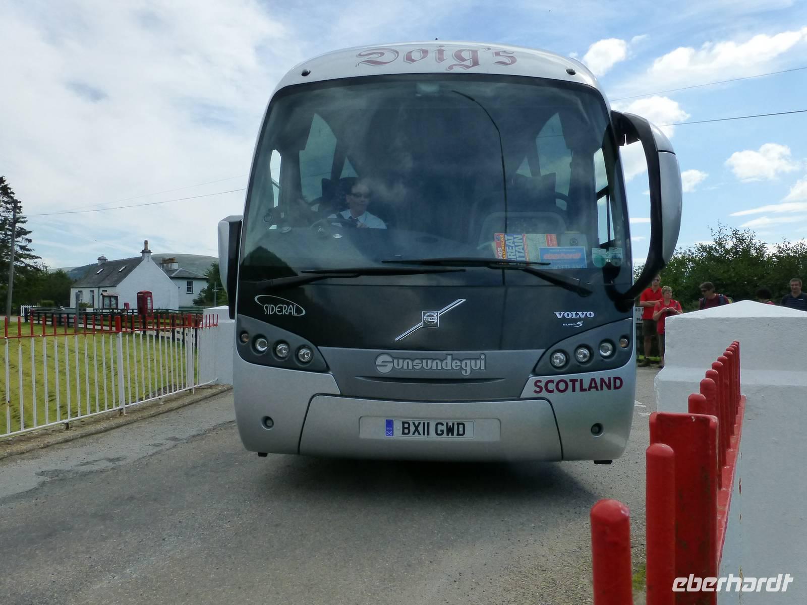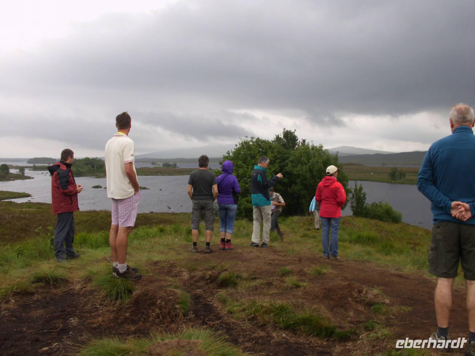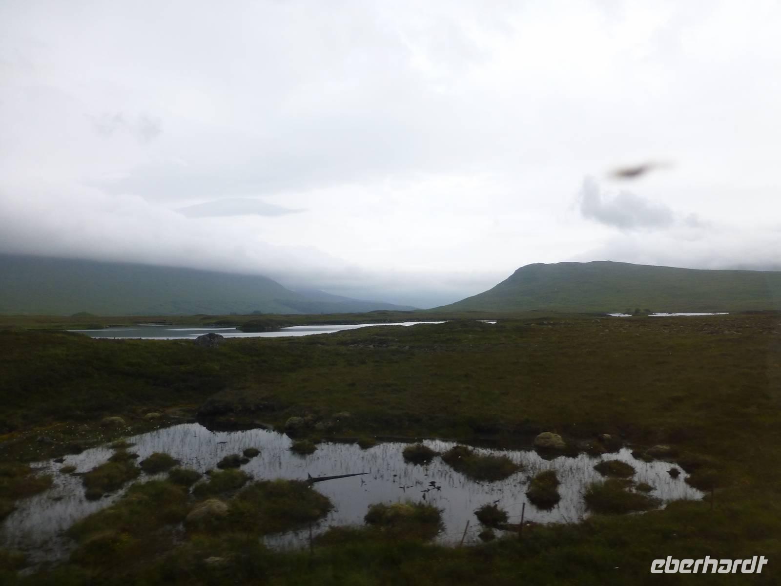 Das Rannoch Moor ist eine einsame Hochebene mit Rundlingen, gletschergeformten, rundgeschliffenen Felsen. In diesem Hoch- und Deckenmoor wohnen kaum Menschen, manch ein Haus hier ist NUR über den Bahnhof oder zu Fuß zu erreichen, Autos sind unerwünscht in dieser Einsamkeit. Midges brüten hier im Sphagum, dem Torfmoos und werden allenfalls von ihren tierischen oder pflanzlichen Fressfeinden (etwa Morgentau) in ihrem Tun gestört. Nach der Zugfahrt, die in Tyndrum, einer Metropole der Highlands, die sogar zwei Bahnhöfe statt nur einem benötigt*, endete, ging die Fahrt mit unserem Busfahrer Oggie, einen Bögen schlagend, wieder zurück.