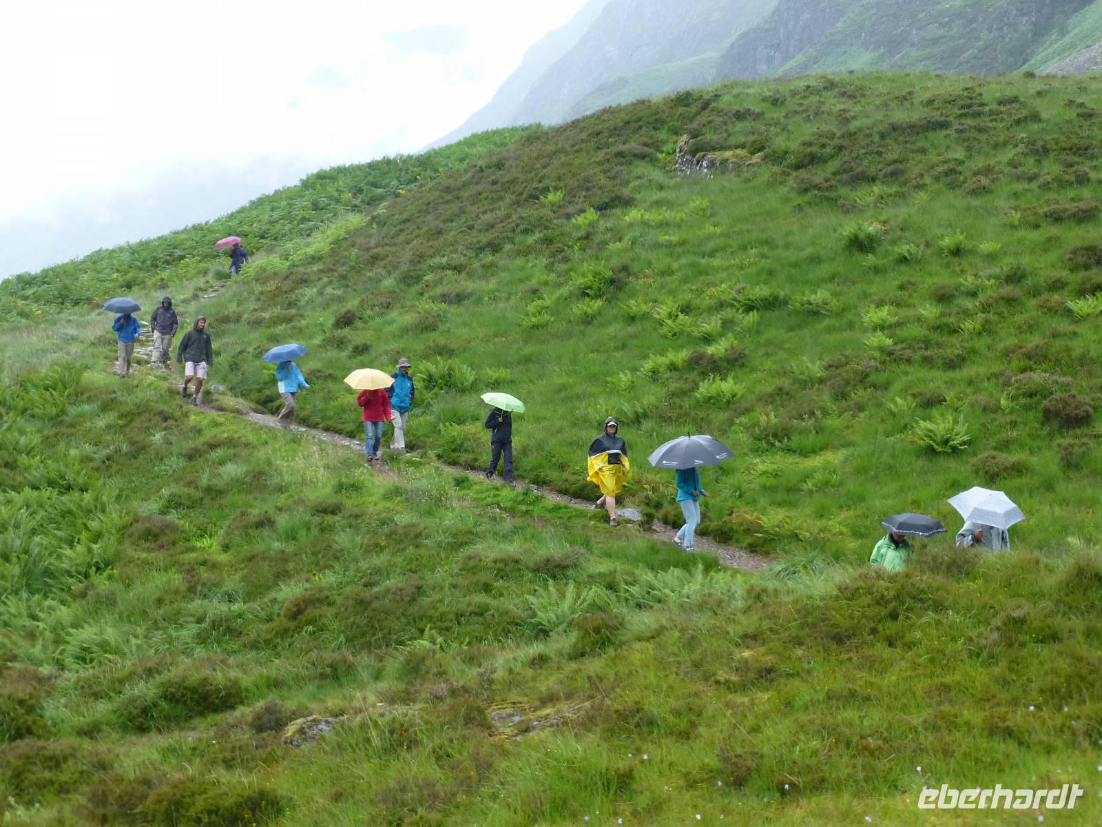 Nach Maßstäben der Highlands von der Opferzahlen her kaum weiter bemerkenswert. Jedoch hatte sich Captain Donald Campbell mit seinen Leuten bereits zwei Wochen bei den McDonalds aufgehalten und deren Gastfreundschaft genossen. Der Befehl des eigentlich wohlgelittenen William, den man schnell aus der Schusslinie zog, und der brutale Bruch der Gastfreundschaft machte den eigentlichen Skandal aus.Ein kurzer Regenspaziergang führte uns eine kurze Strecke durch das Tal.*Tatsächlich liegt das mit den zwei Bahnhöfen daran, dass Tyndrum an zwei Bahnlinien liegt, so gibt es den Bahnhof Tyndrum Upper und Tyndrum Lower. Will man von dem einen zu dem anderen Bahnhof fahren, muss man 16 km weit fahren, läuft man dagegen, sind es, Serpentinen einschließlich, 1,2 km.Technische Daten: