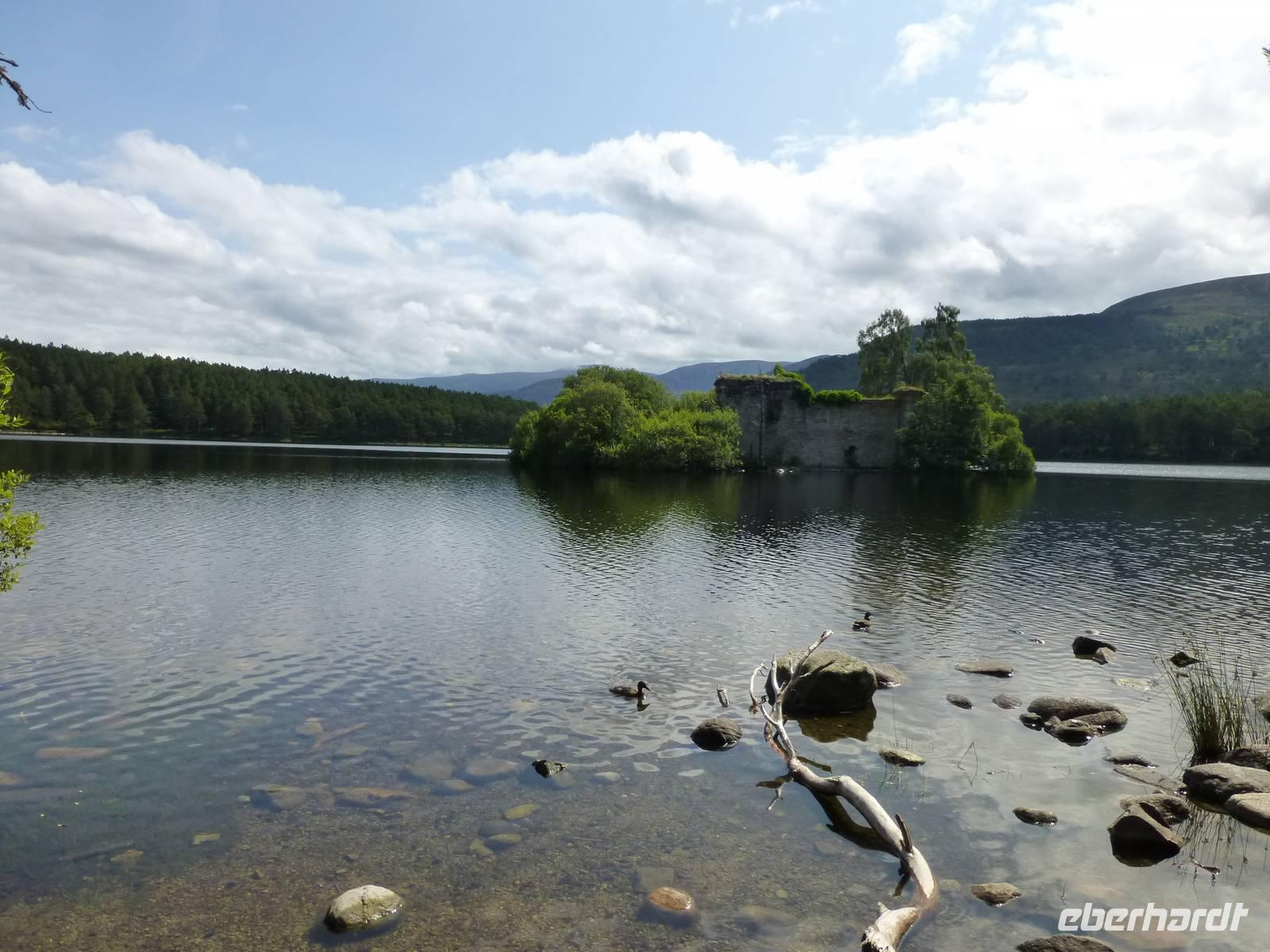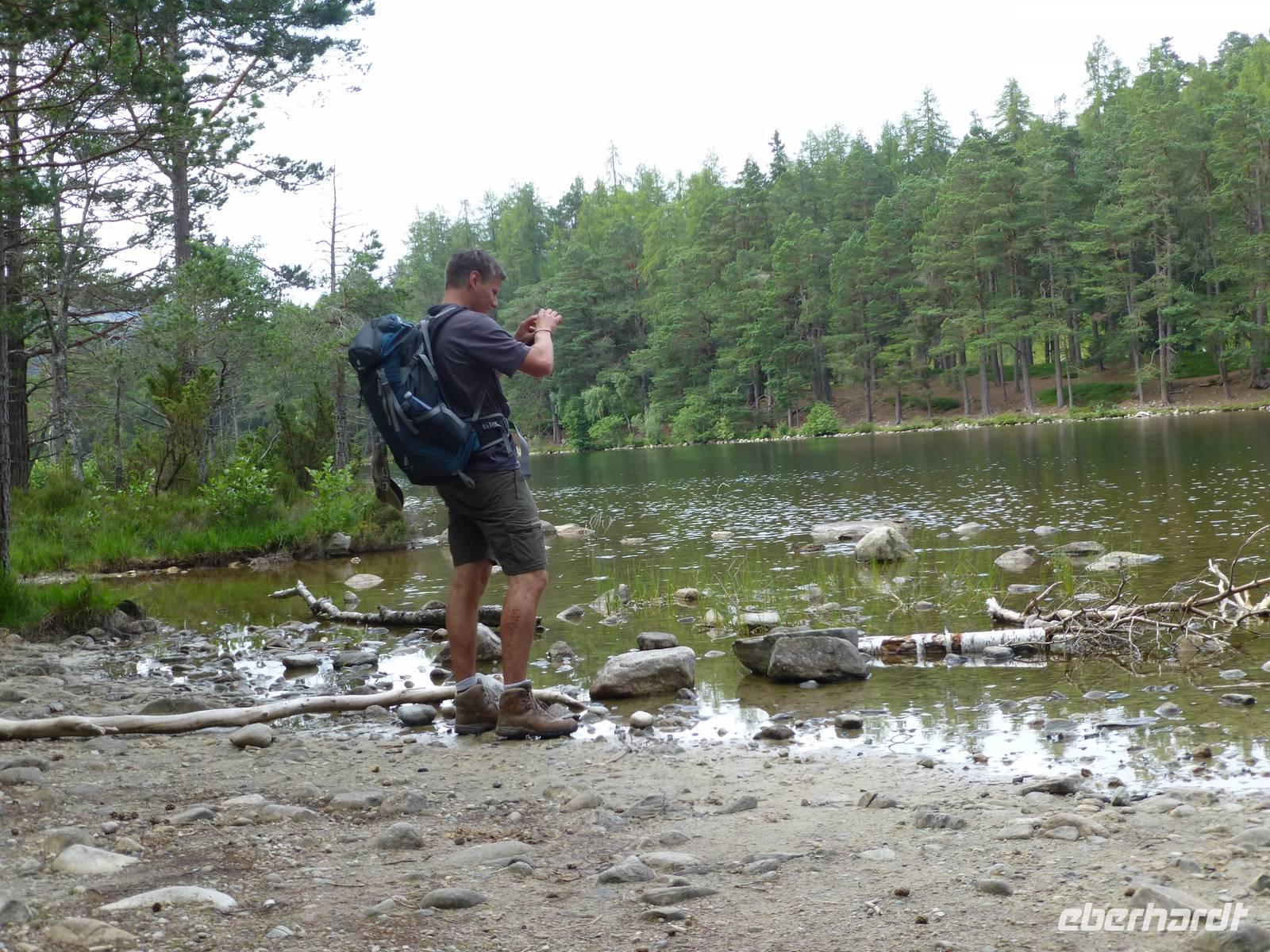 Den Loch Oggie wird man unter diesem Namen in keiner offiziellen Wanderkarte finden, ja bis zur Veröffentlichung dieser Zeilen werden nicht einmal die NSU, der MI5 oder der MI6 Wind von seiner Existenz bekommen haben, denn nur dem verschworenen Kreis der Mitwanderer ist der See bis dato unter diesem Namen bekannt. Der Loch Oggie liegt im Rothiemurchus Forest, einem Teil des Caledonian Forest, also einem Überrest der ursprünglichen Bewaldung Schottlands, deren Erhalt Queen Victoria bei einem ihrer Schottlandbesuche befahl. In einem zweiten See, dem Loch an Eilein, liegt zudem die Burg des Wolf of Badenoch, Alexander Stewart, dem zweiten Sohn des ersten Stuart-Königs (und somit Urenkels von Robert the Bruce), die sich damals noch Stewart schrieben. Naja, einen kleinen Schönheitsfehler hat die Sache dann doch: Die Burg ist eigentlich zu jung...