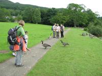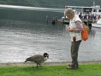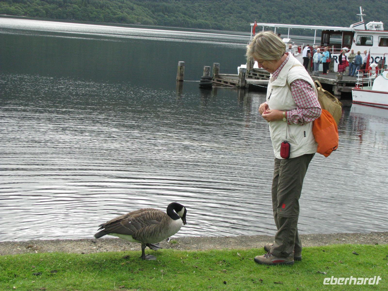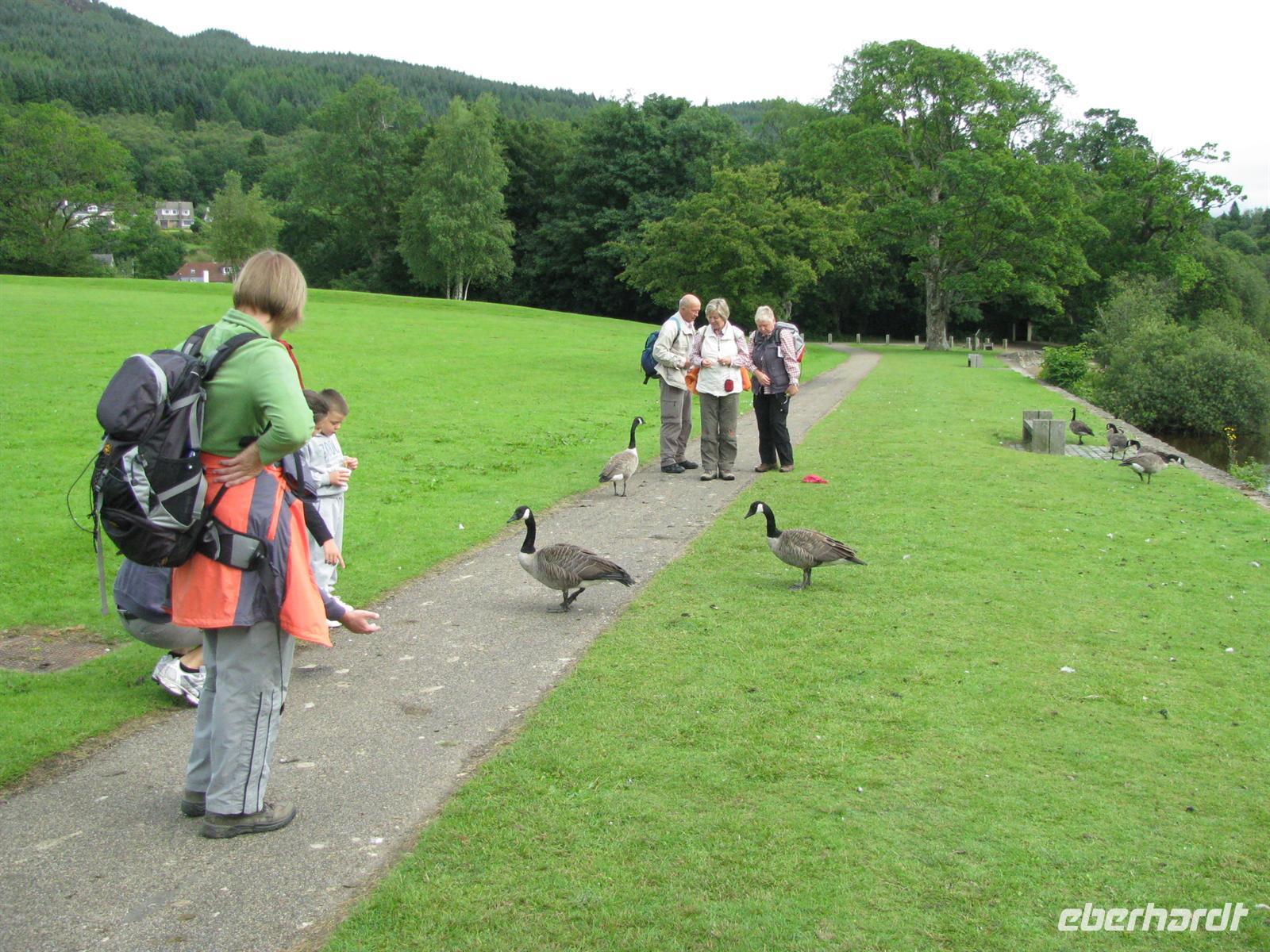 Mittagspause machten wir an einem Aussichtspunkt auf bemoosten Steinen. Gemütlich verzehrten wir Sandwiches, Obst und Kekse. Unterwegs erzählte ich die Geschichte von Rob Roy, dessen Geschichte eng mit dem Loch Lomond verbunden ist. Der ursprünglich einfache Wanderweg wurde gegen Ende zu immer beschwerlicher, über Wurzlen, Wasserläufe und Steine. Und doch meisterten alle Gäste die Strecke vor der geplanten Zeit. Es war also noch ausreichend Luft bis zur Abfahrt der letzten Fähre. Im Inversnaid Hotel kehrten wir ein und belohnten uns mit Bier, Kaffee oder Tee. Mit der Fähre fuhren wir zurück nach Tarbet und wurden dort von Duncan bereits erwartet.