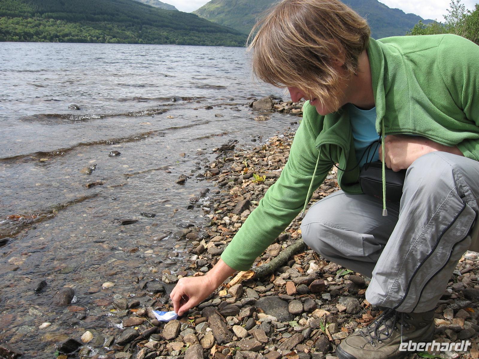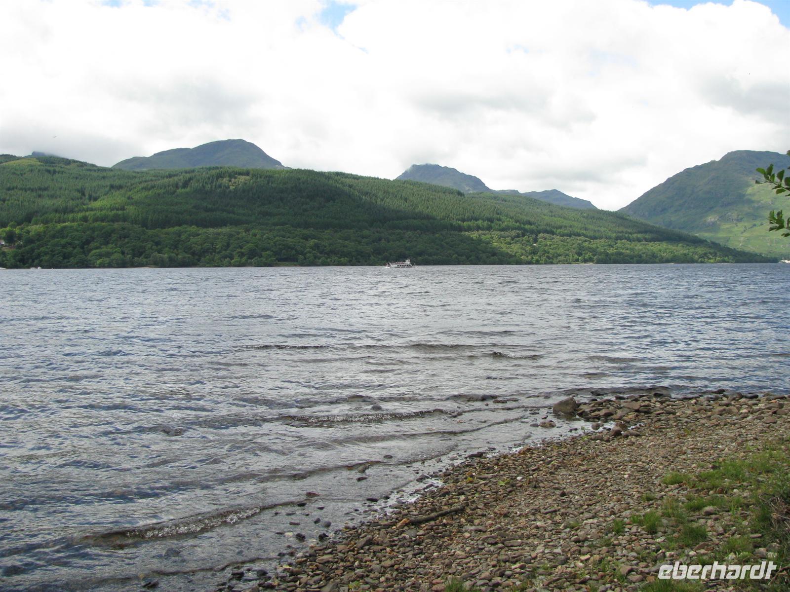 Heute stand der wohl berühmteste Wanderweg Schottlands auf dem Programm: Der West Highland Way. Duncan holte uns vom Hotel ab und fuhr uns nach Tarbet, am Westufer des Loch Lomond. Wir gingen an Bord einer Fähre und fuhren auf die andere Seite des Sees, nach Rowardennan. Auf dem Weg trafen wir viele Backpacker, die ihre Zelte aufgeschlagen hatten und nicht nur wie wir zwölf Kilometer wandern würden. Doch wir waren recht zufrieden mit unserem Plan, nicht zuletzt, weil am Ziel eine Belohnung für die Anstrengung wartete. Unsere Wanderung führte durch Nadelwälder, einige Pilze am Wegesrand und immer wieder herrliche Ausblicke auf den romantischen Loch Lomond. Zum Glück spielte das Wetter gut mit, denn nur am gegenüberliegenden Ufer sahen wir dunkle Regenwolken. Unterwegs kamen wir an ein Tor, das als Barriere für Tiere gilt. Ralf stellte dieses Tor aber als „Kissing Gate“ vor und alle Paare, die passierten, mussten sich küssen. Oder besser gesagt: Durften sich küssen.