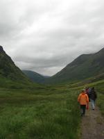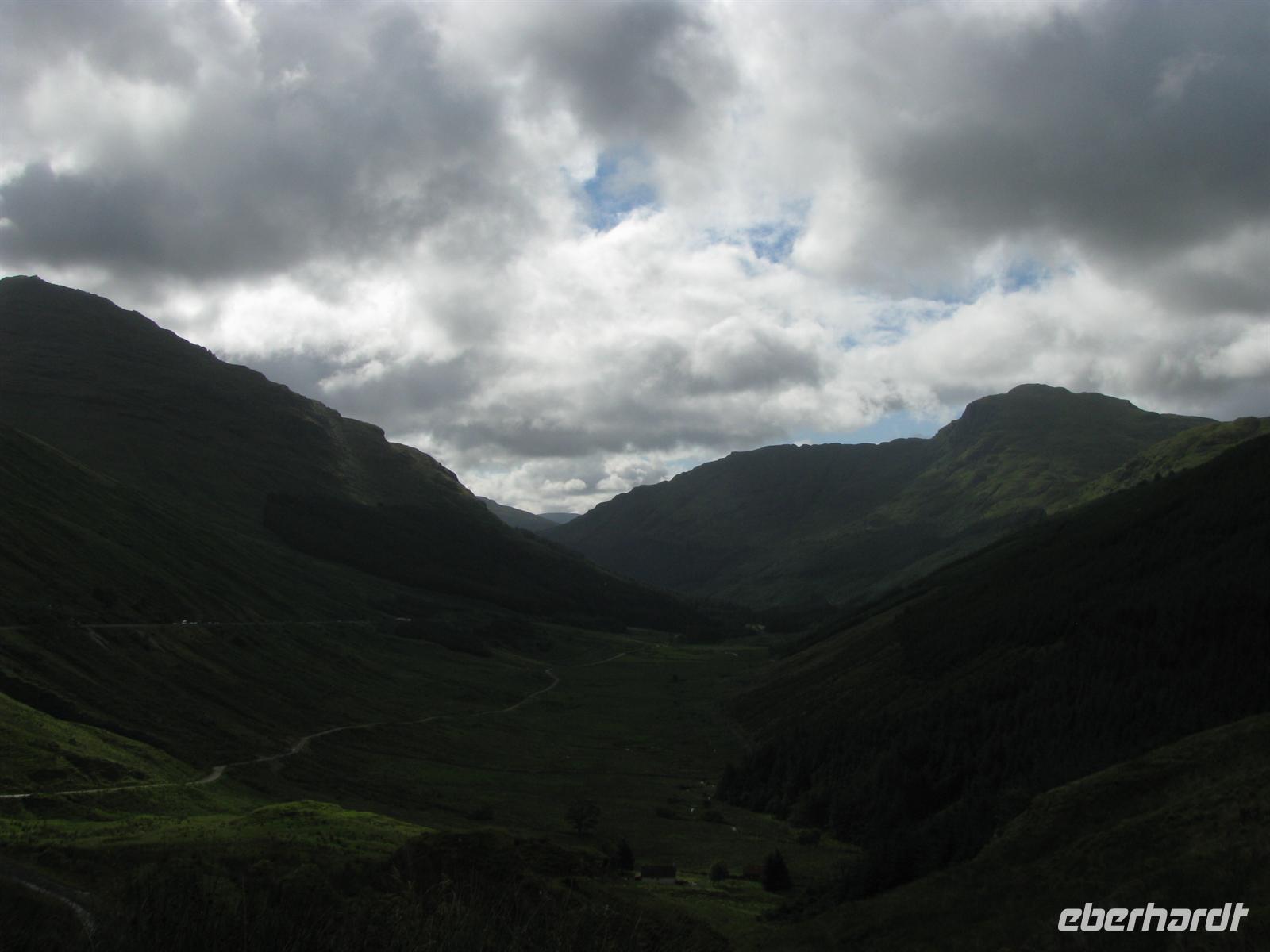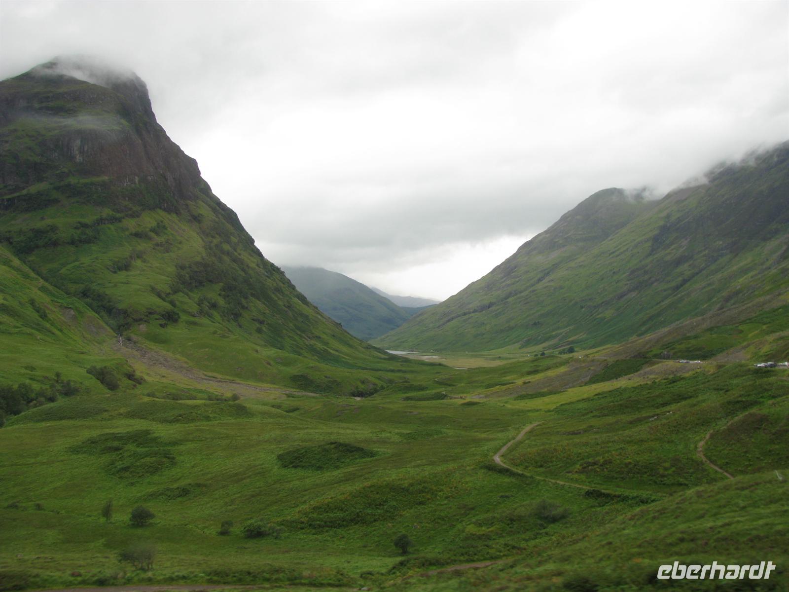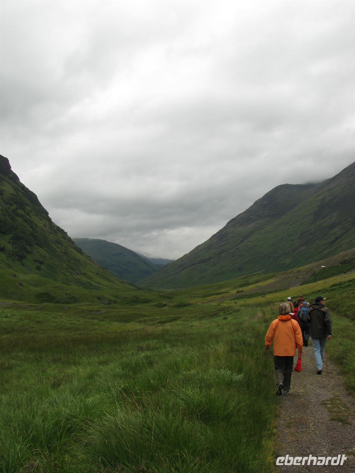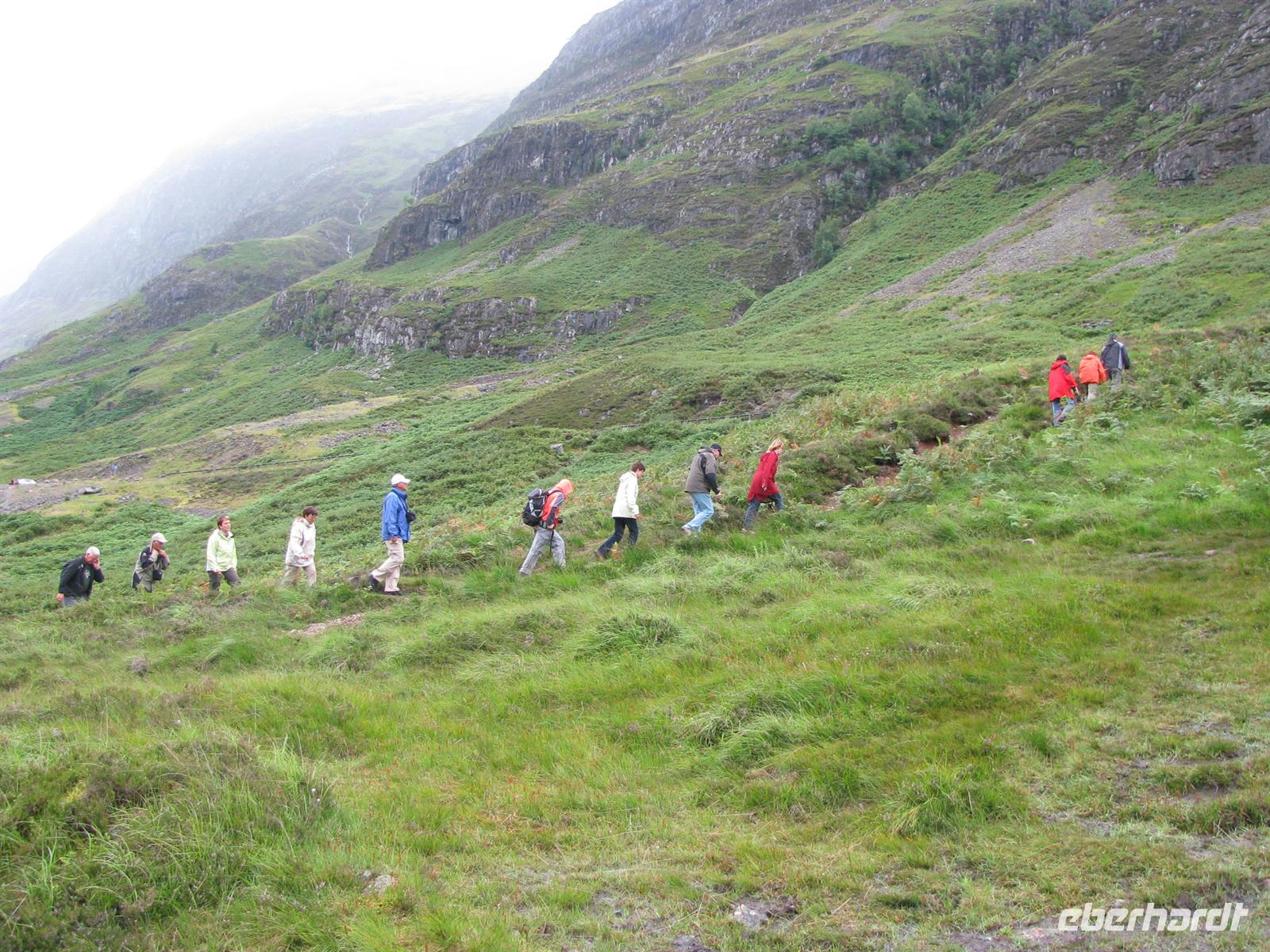 Nach dem Frühstück trafen wir uns erst kurz vor Mittag in der Lobby. Gemeinsam spazierten wir zum Bahnhof. Mit dem Zug fuhren wir durch wunderschöne Landschaften: Wir durchquerten das Rannoch Moor, Großbritanniens größtes zusammenhängendes Moorgebiet und kamen nach ca. anderthalb Stunden Fahrt in Tyndrum Upper an. Wir spazierten zur Raststätte, wo uns unser heutiger Busfahrer Jimmy bereits erwartete. Dort war für uns bereits eine kleine Whisky-Verkostung vorbereitet: Einer, der gar nicht schlecht war und einer, der wie „alter Latsch“ schmeckte. In guter Stimmung stiegen wir in den Bus ein und fuhren ein Stück entlang der Eisenbahnlinie zurück. Auf einem Parkplatz hielten wir für einen Fotostopp und trafen auf einen Dudelsackspieler. Dieser erzählte uns nach ein paar Spenden sehr bereitwillig von seiner Karriere als Dudelsackspieler. Wir fuhren weiter zum Glen Coe, dem „Tal der Tränen“. Was heute ein Magnet für Touristen und Wanderer ist, war früher einmal der Schauplatz eines schrecklichen Massakers. Im Glen Coe wanderten wir ein Teilstück durch das Tal. Wir hatten Glück mit dem Wetter, denn es nieselte nur sehr wenig. Am Ende dieser kleinen Wanderung erreichten wir wieder ein „Kissing Gate“, doch diesmal hatte niemand gesondertes Interesse an einem weiteren Kuss. Also spazierten wir wieder zurück.