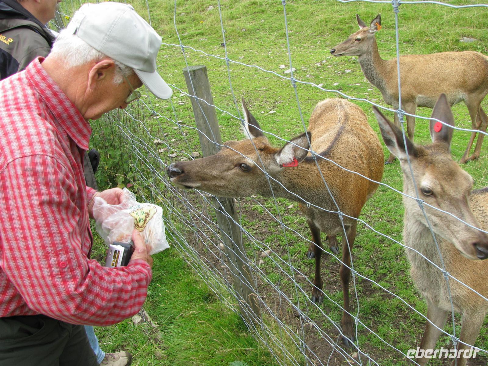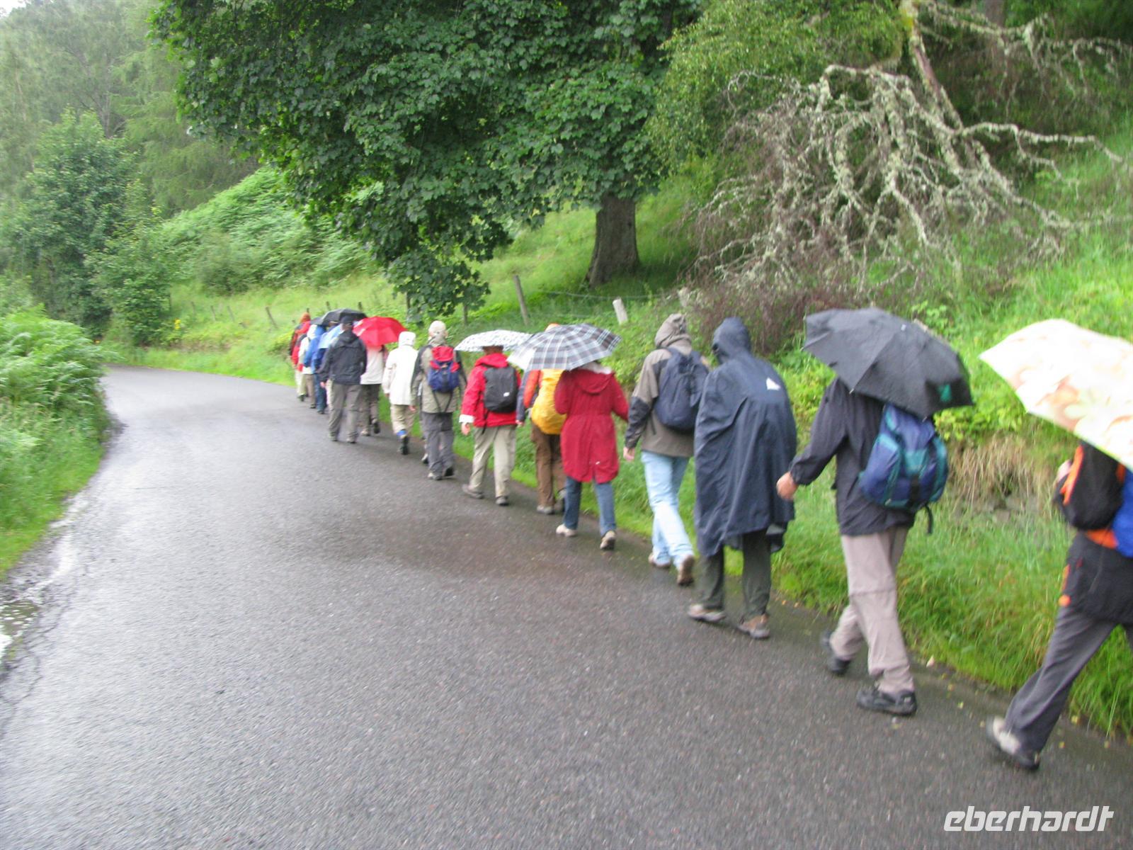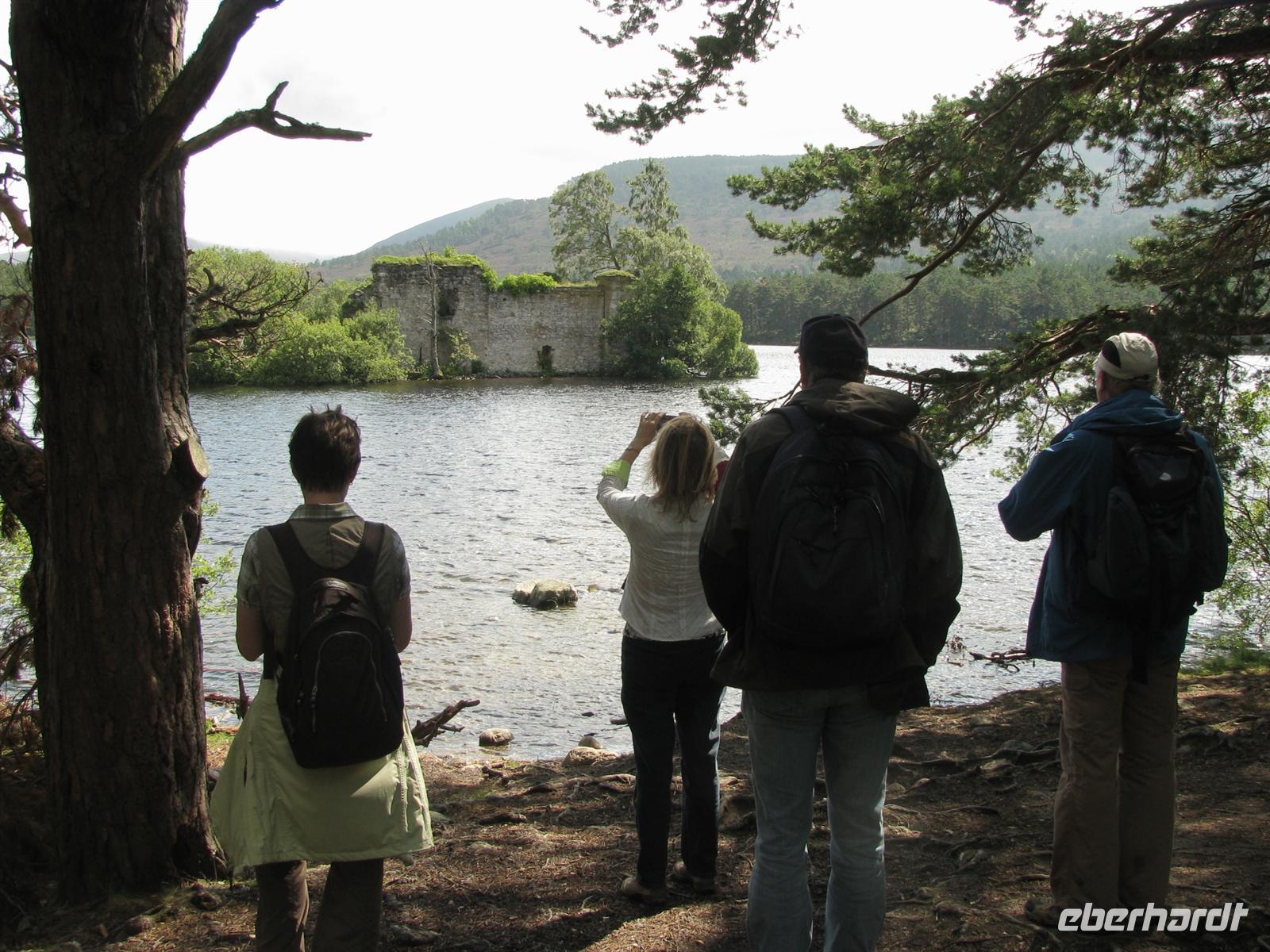 Der Tag versprach zunächst gar kein gutes Wetter: Auf dem Weg zum Frühstück nieselte es bereits. Nach dem Frühstück gingen wir zum nahegelegenen Supermarkt, um uns mit Verpflegung für die Mittagspause auszustatten. Auf dem Rückweg zum Hotel nahmen wir die Abkürzung über den Zaun und die berühmte blaue Kiste. Um zehn trafen wir uns zur Abfahrt. Der Rothiemurchus Forrest, unser Wandergebiet, war nicht weit entfernt, sodass wir es uns gar nicht erst im Bus bequem zu machen brauchten. Wir wanderten durch Wald und Heidelandschaft bis zum Loch An Eilein. Wir umwanderten den See und in der Zwischenzeit klärte der Himmel auf und die Sonne meinte es sehr gut mit uns. Nachdem wir den See umrundet hatten, ließen wir uns zur Mittagspause nieder. Eine Überraschung hatten wir noch in petto: Eine Flache Whisky und 33 Plastikbecher zauberten wir hervor und stießen auf die schöne Reise an. Weiter ging es durch Weideland, wobei sich Hindernisse in unseren Weg stellten: Wir kletterten über einen Weidezaun und bei einer weiteren Zauntür hebelten die Männer diese aus. Wir wanderten vorbei an einem Wildgehege, wo uns die Hirsche neugierig entgegenliefen. Ab diesem Punkt fing es erst leicht an zu nieseln und regnete sich nach kurzer Zeit ziemlich ein. Mit Kapuzen, Schirmen und Regencapes liefen wir durch die Landschaft, nur noch auf geradem Wege zum Bus. Dort angekommen und triefend vor Nässe waren wir dennoch froh, endlich richtiges schottisches Wetter erlebt zu haben!