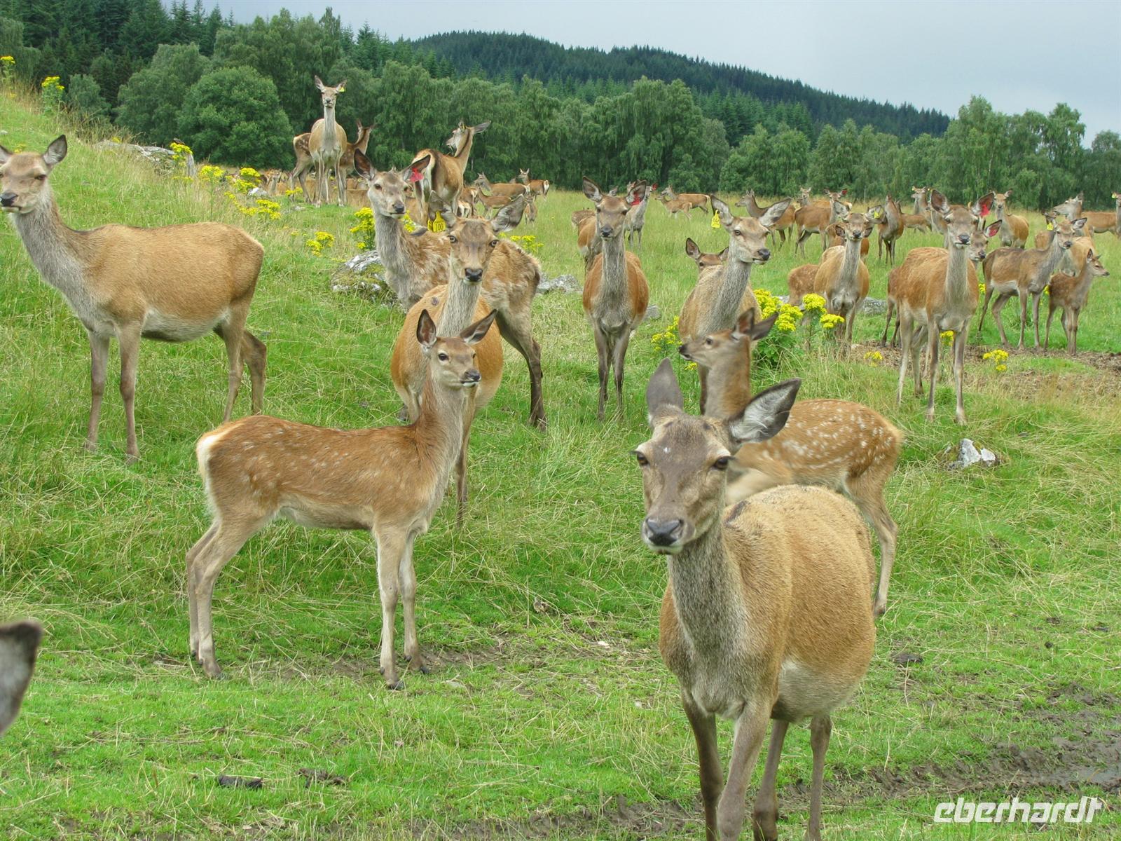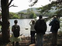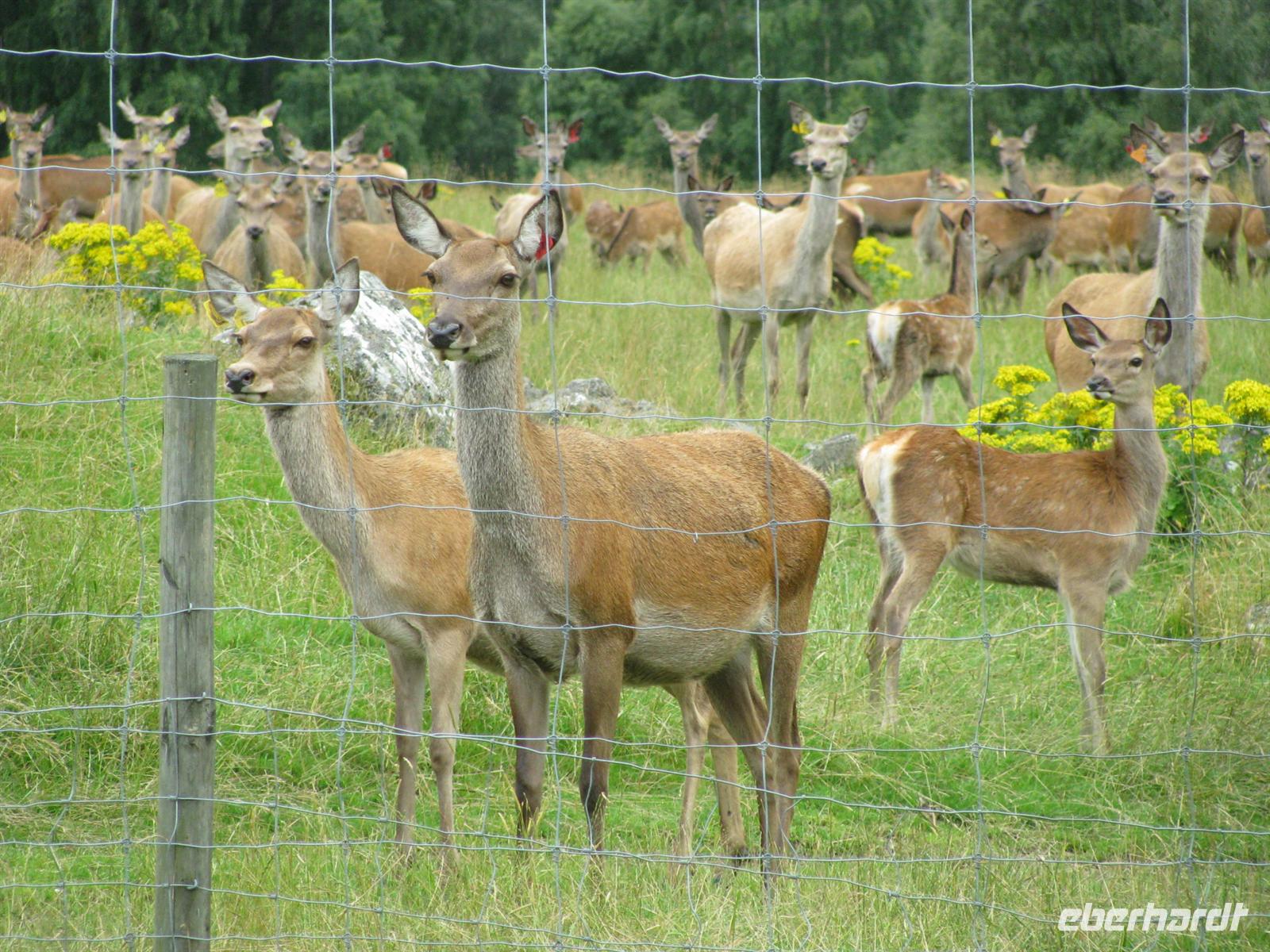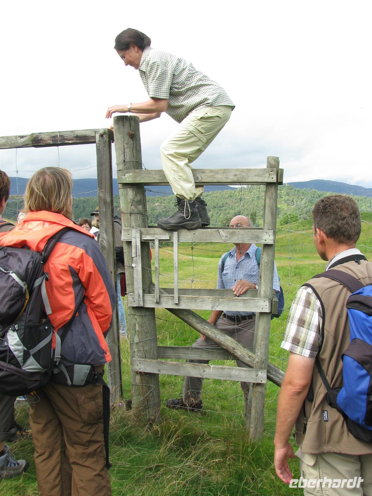 Der Tag versprach zunächst gar kein gutes Wetter: Auf dem Weg zum Frühstück nieselte es bereits. Nach dem Frühstück gingen wir zum nahegelegenen Supermarkt, um uns mit Verpflegung für die Mittagspause auszustatten. Auf dem Rückweg zum Hotel nahmen wir die Abkürzung über den Zaun und die berühmte blaue Kiste. Um zehn trafen wir uns zur Abfahrt. Der Rothiemurchus Forrest, unser Wandergebiet, war nicht weit entfernt, sodass wir es uns gar nicht erst im Bus bequem zu machen brauchten. Wir wanderten durch Wald und Heidelandschaft bis zum Loch An Eilein. Wir umwanderten den See und in der Zwischenzeit klärte der Himmel auf und die Sonne meinte es sehr gut mit uns. Nachdem wir den See umrundet hatten, ließen wir uns zur Mittagspause nieder. Eine Überraschung hatten wir noch in petto: Eine Flache Whisky und 33 Plastikbecher zauberten wir hervor und stießen auf die schöne Reise an. Weiter ging es durch Weideland, wobei sich Hindernisse in unseren Weg stellten: Wir kletterten über einen Weidezaun und bei einer weiteren Zauntür hebelten die Männer diese aus. Wir wanderten vorbei an einem Wildgehege, wo uns die Hirsche neugierig entgegenliefen. Ab diesem Punkt fing es erst leicht an zu nieseln und regnete sich nach kurzer Zeit ziemlich ein. Mit Kapuzen, Schirmen und Regencapes liefen wir durch die Landschaft, nur noch auf geradem Wege zum Bus. Dort angekommen und triefend vor Nässe waren wir dennoch froh, endlich richtiges schottisches Wetter erlebt zu haben!