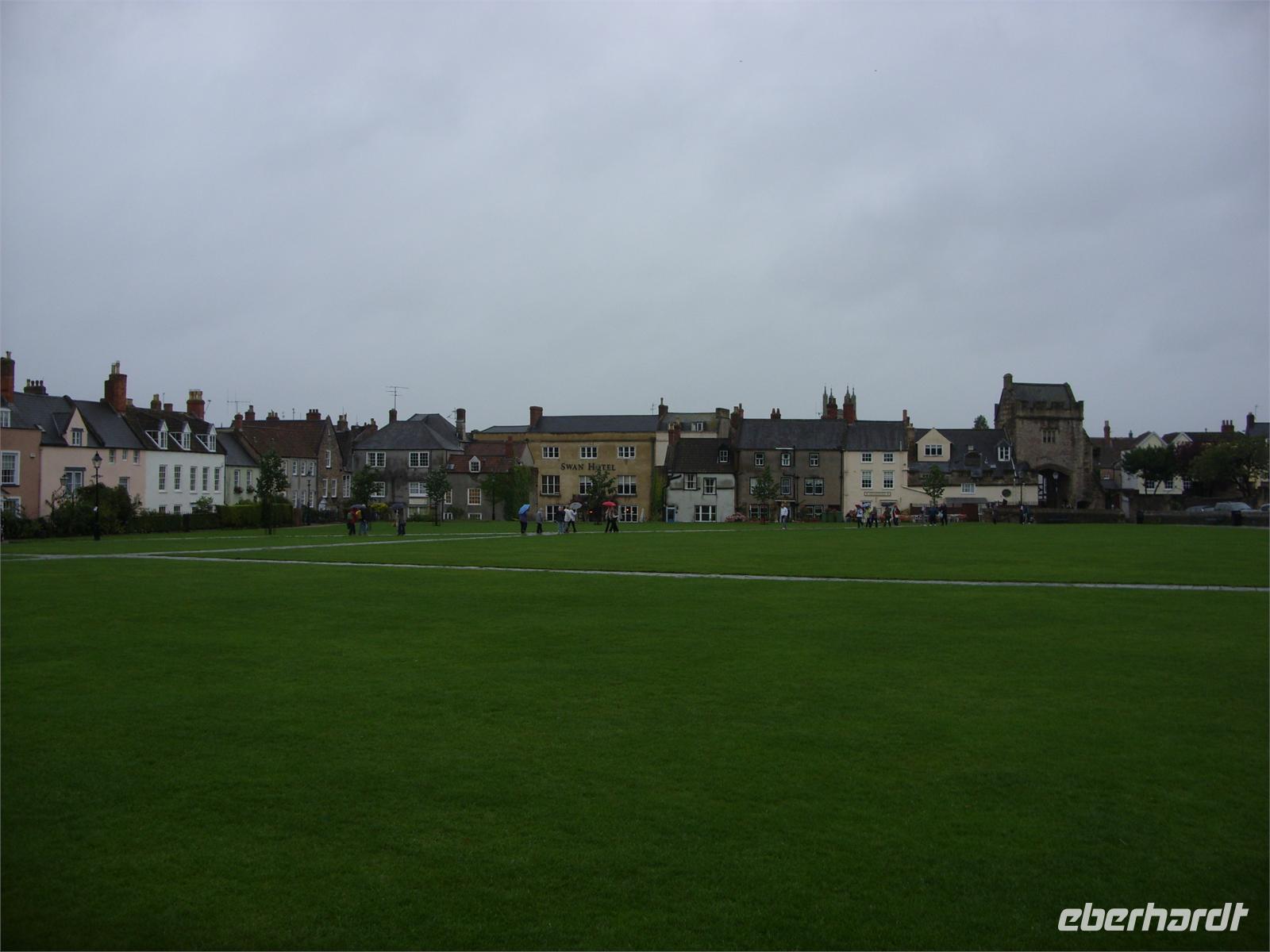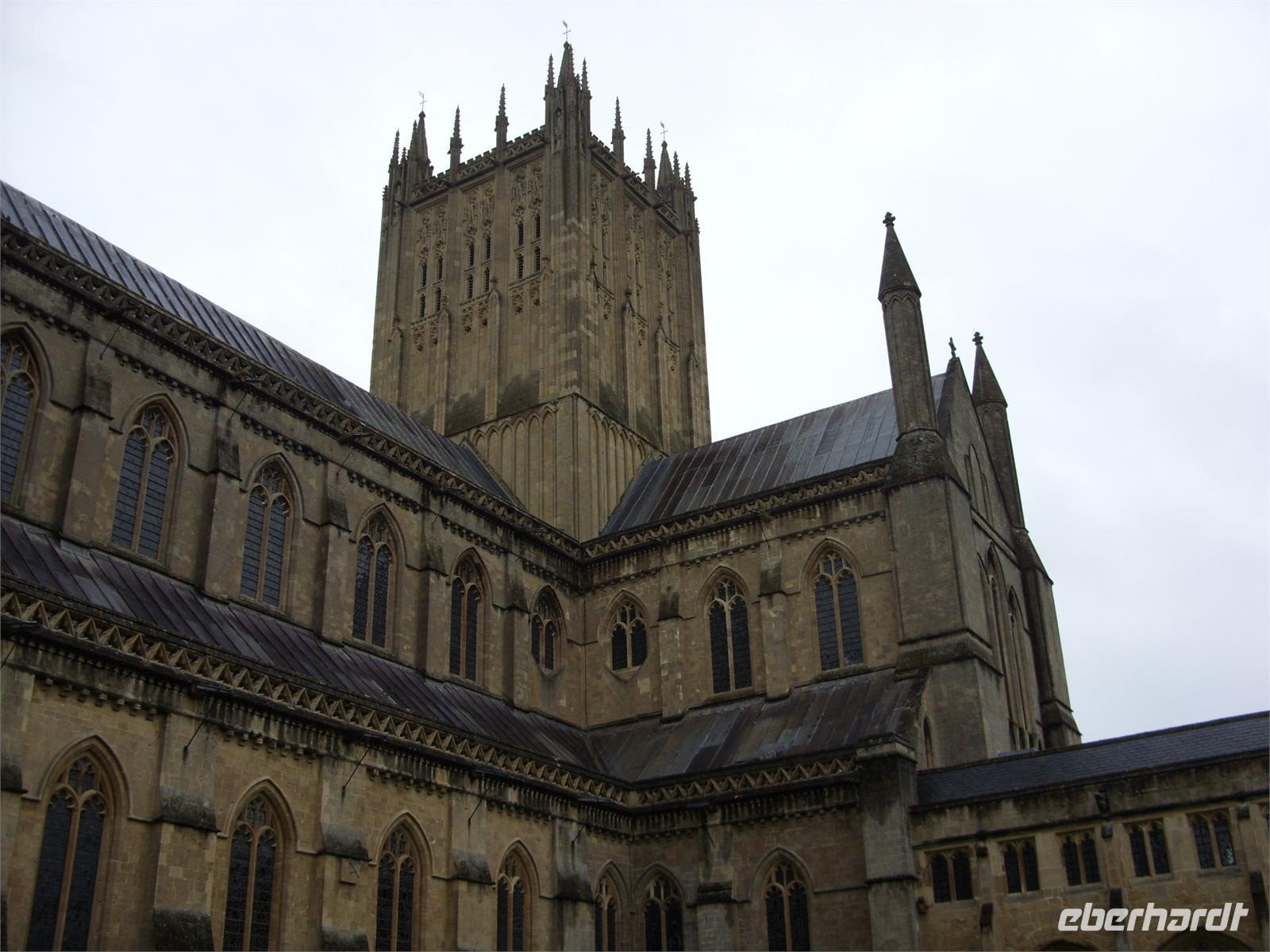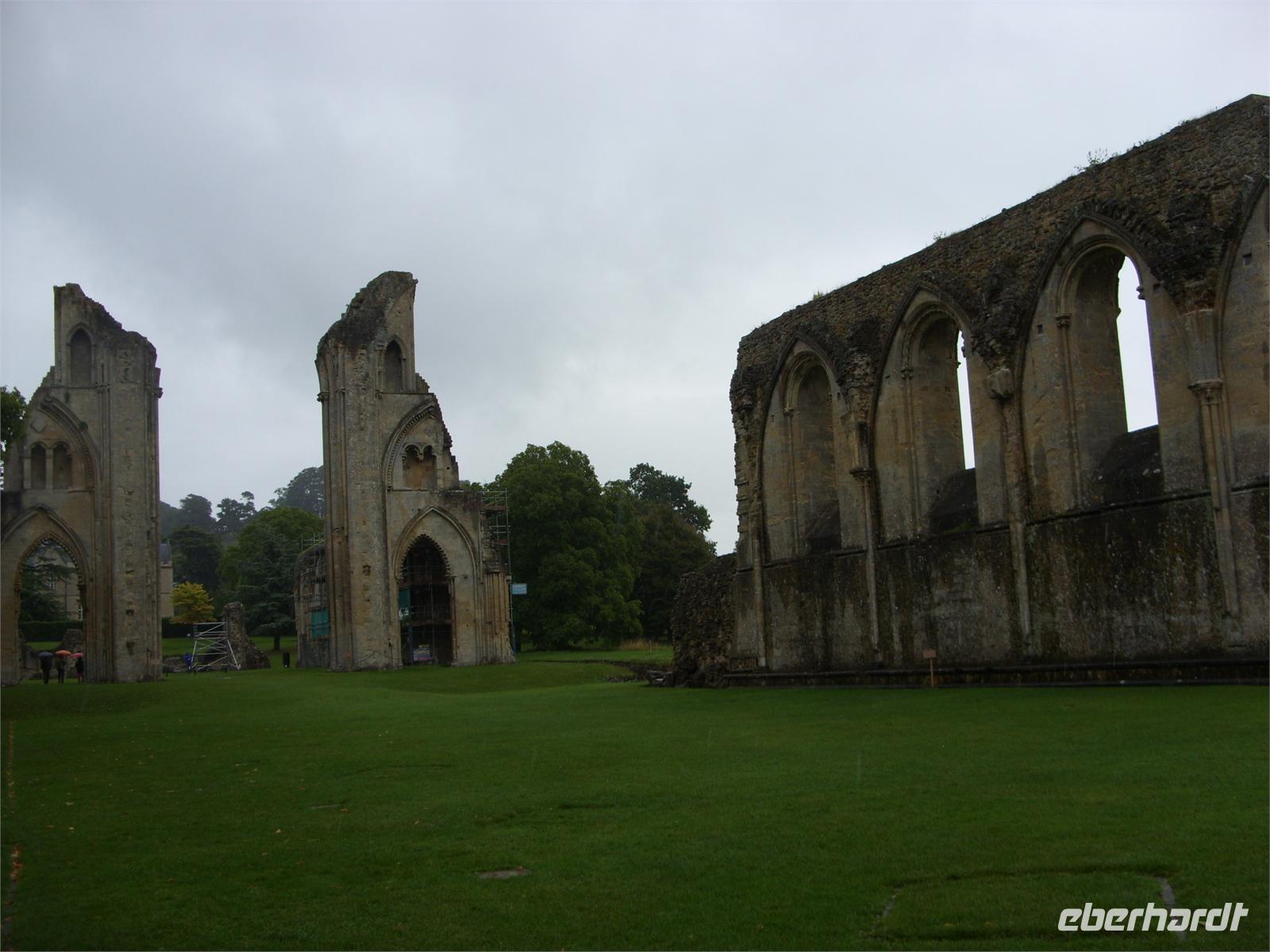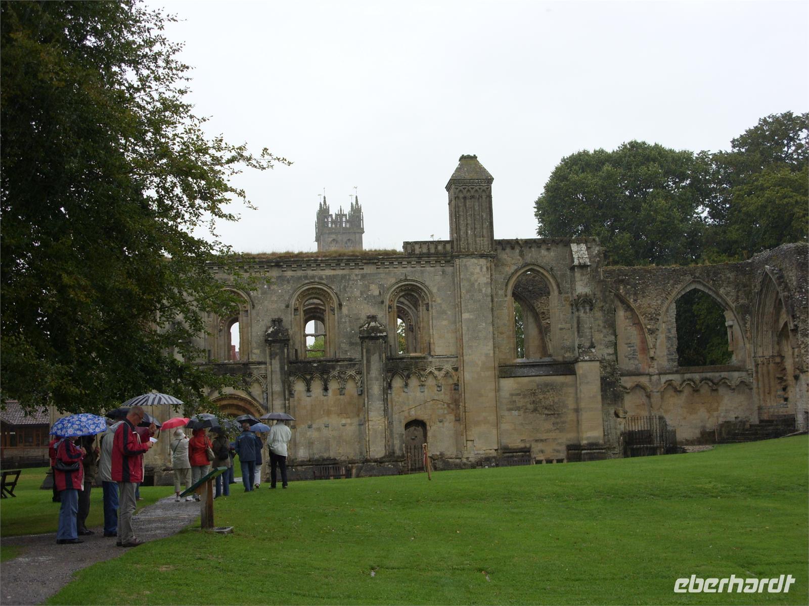 Obwohl am 9. Reisetag der Himmel kein Erbarmen mit uns hatte und wir im strömenden Regen die beiden letzten Kathedralen in Augenschein nahmen, blieben diese uns jedoch stark in Erinnerung. Zunächst besichtigten wir die Ruinen der berühmtem Glastonbury Abbey, der einstigen Grabstätte von König Arthur. Hier amüsierten wir uns auch köstlich bei der Darbietung eines verkleideten Mönches, der uns das Leben vor 700 Jahren in dieser Abtei näher brachte. Anschließend fuhren wir die wenigen Kilometer nach Wells, der kleinsten Kathedralenstadt Englands. Die Kathedrale von Wells, eine der frühesten erbauten Kathedralen des Landes, ist heutzutage vor allem berühmt für seine sogenannten Scherenbögen (gekreuzte Spitzbögen in der Vierung) und seinem Kapitelhaus, dessen Rippengewölbe wie eine riesige Palme aussieht.