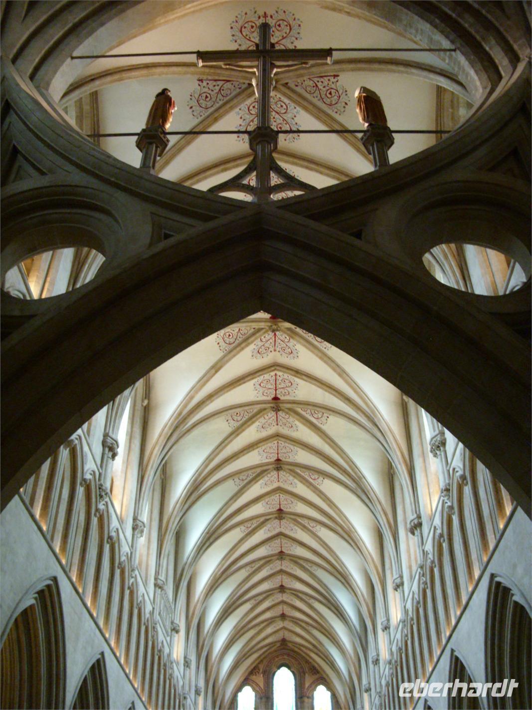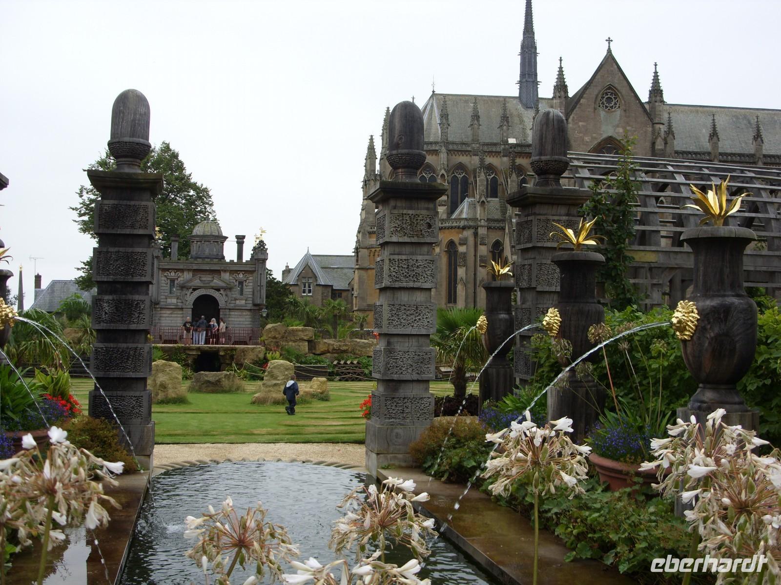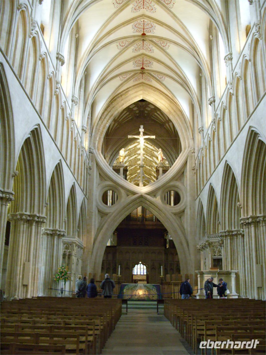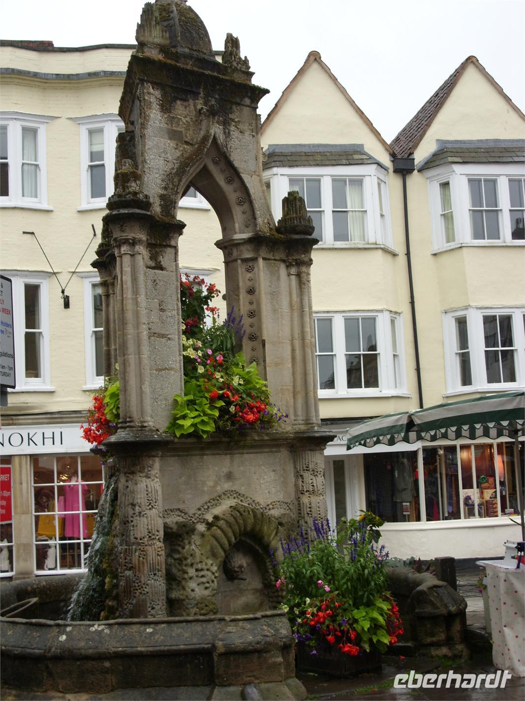 Obwohl am 9. Reisetag der Himmel kein Erbarmen mit uns hatte und wir im strömenden Regen die beiden letzten Kathedralen in Augenschein nahmen, blieben diese uns jedoch stark in Erinnerung. Zunächst besichtigten wir die Ruinen der berühmtem Glastonbury Abbey, der einstigen Grabstätte von König Arthur. Hier amüsierten wir uns auch köstlich bei der Darbietung eines verkleideten Mönches, der uns das Leben vor 700 Jahren in dieser Abtei näher brachte. Anschließend fuhren wir die wenigen Kilometer nach Wells, der kleinsten Kathedralenstadt Englands. Die Kathedrale von Wells, eine der frühesten erbauten Kathedralen des Landes, ist heutzutage vor allem berühmt für seine sogenannten Scherenbögen (gekreuzte Spitzbögen in der Vierung) und seinem Kapitelhaus, dessen Rippengewölbe wie eine riesige Palme aussieht.