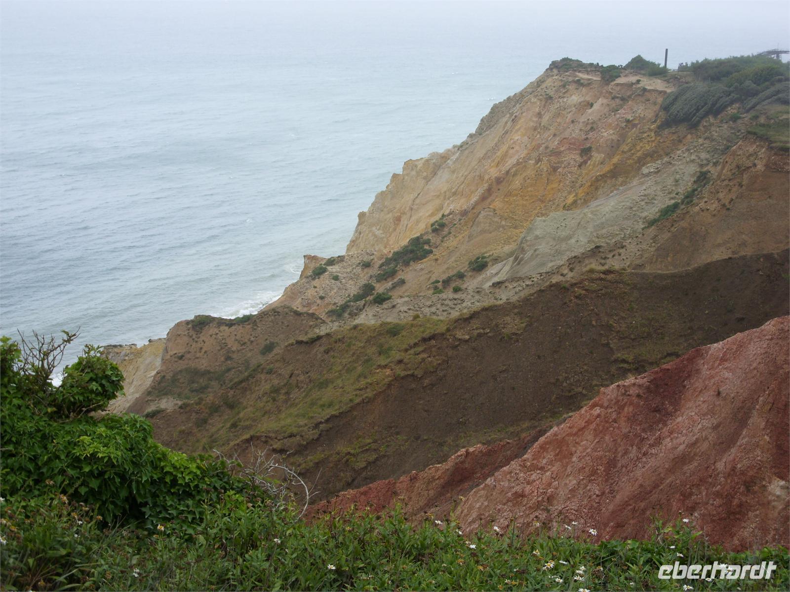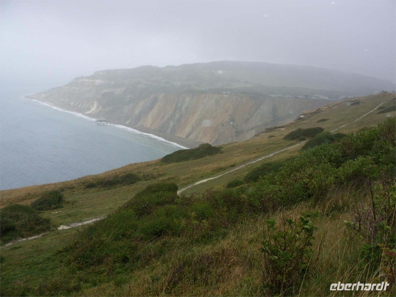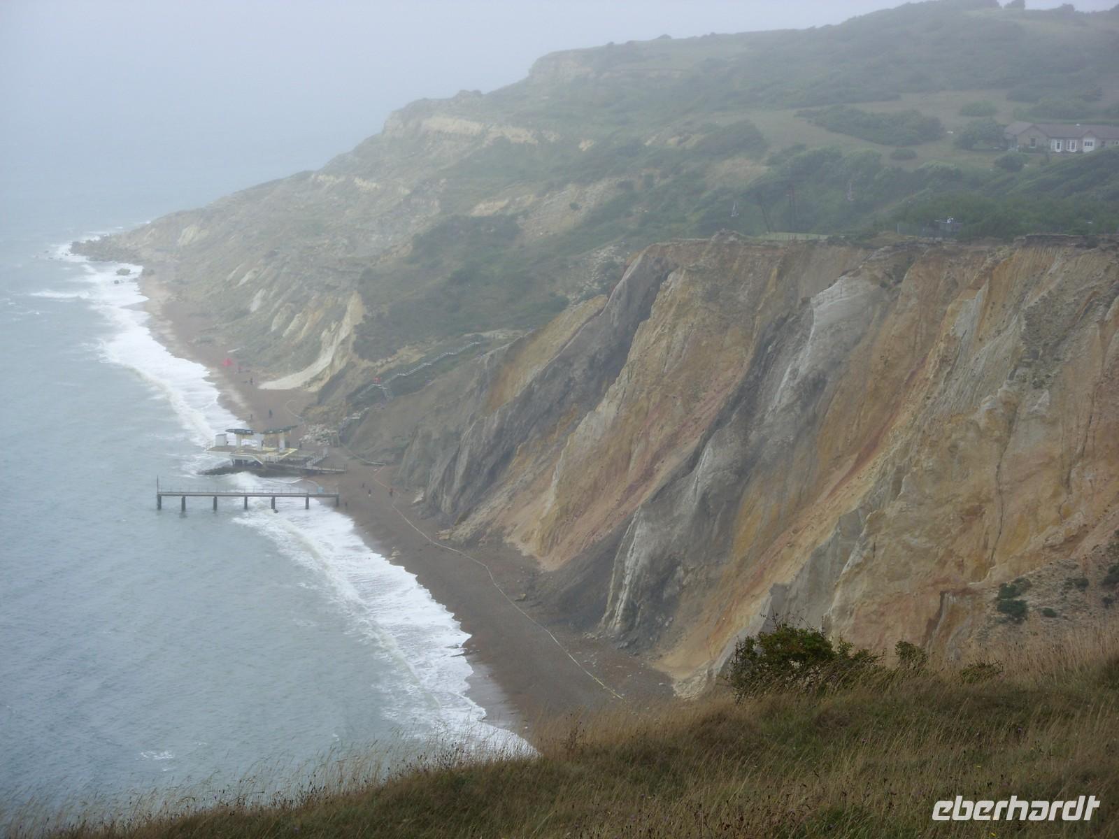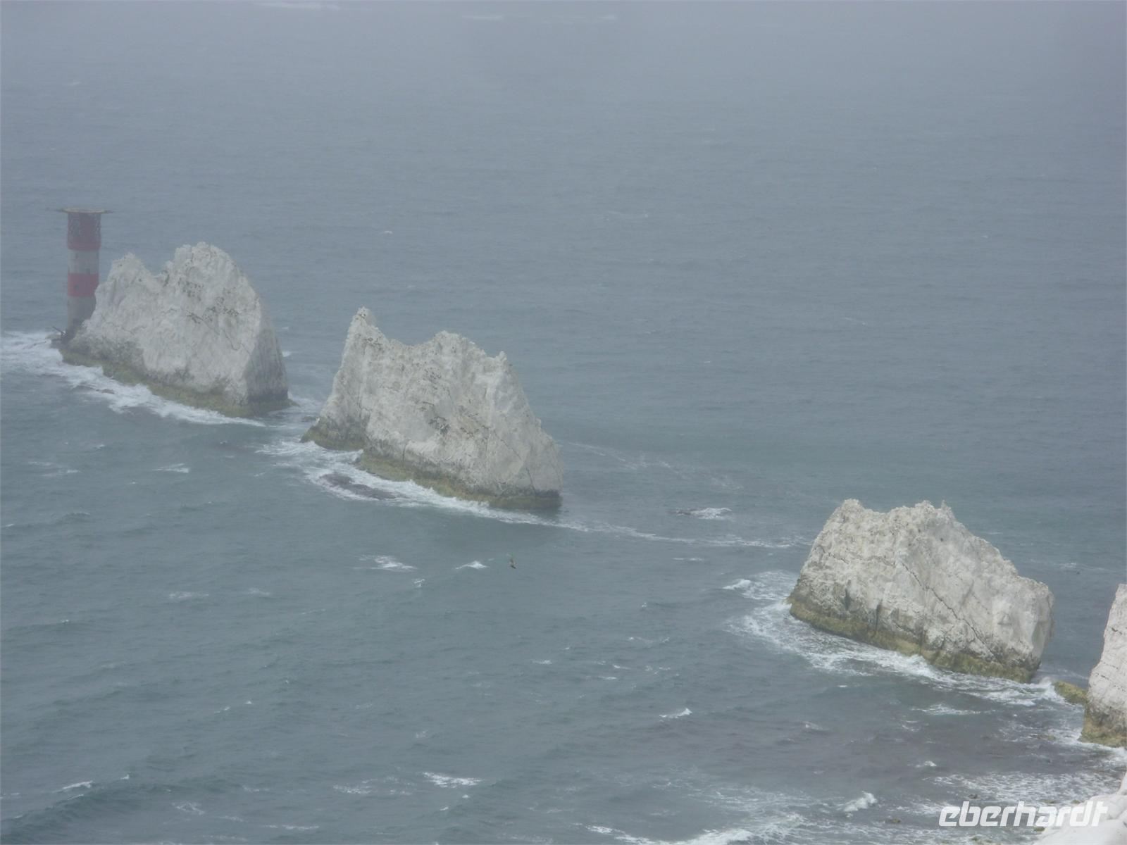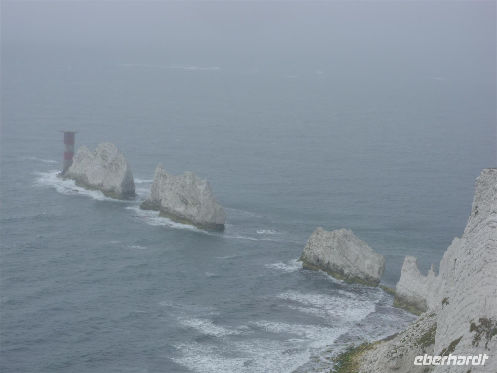 Eine ebensolche imposante Felsformation sahen wir zwei Tage später auf der Isle of Wight. Bei stürmischen und nassen Wetter (Ja, es kann auch mal von hinten regnen!) spazierten wir zu den sogenannten Nadelspitzen. "The Needles" liegen vor der Westküste der Insel und trotzen seit Jahrhunderten Wind & Wetter, was im Laufe der Zeit zu zahlreichen Abrüchen an den Felsen führte. Doch der Nebel meinte es gut mit uns und so konnten wir wenigstens einen kurzen Blick auf die bunte Küstenlandschaft erhaschen.