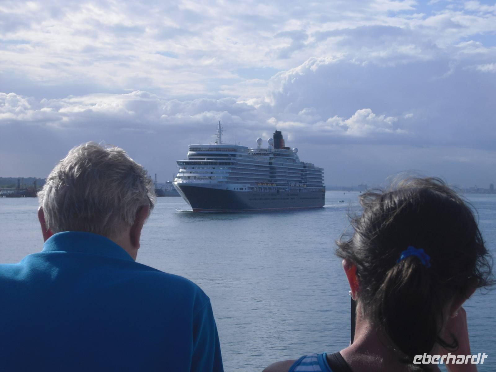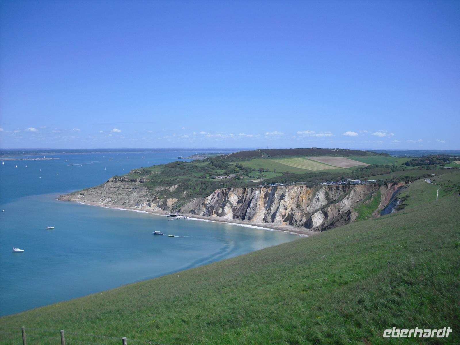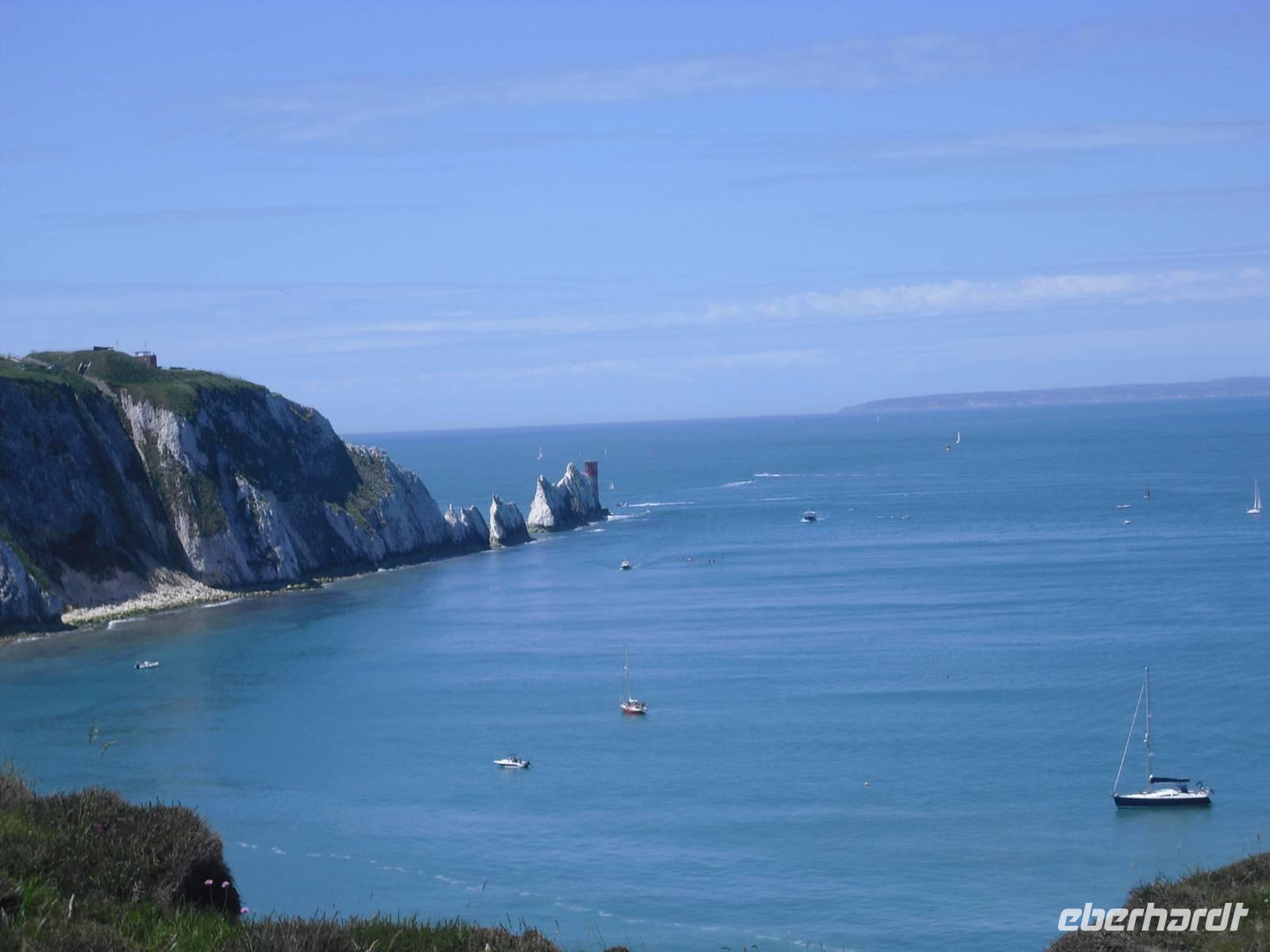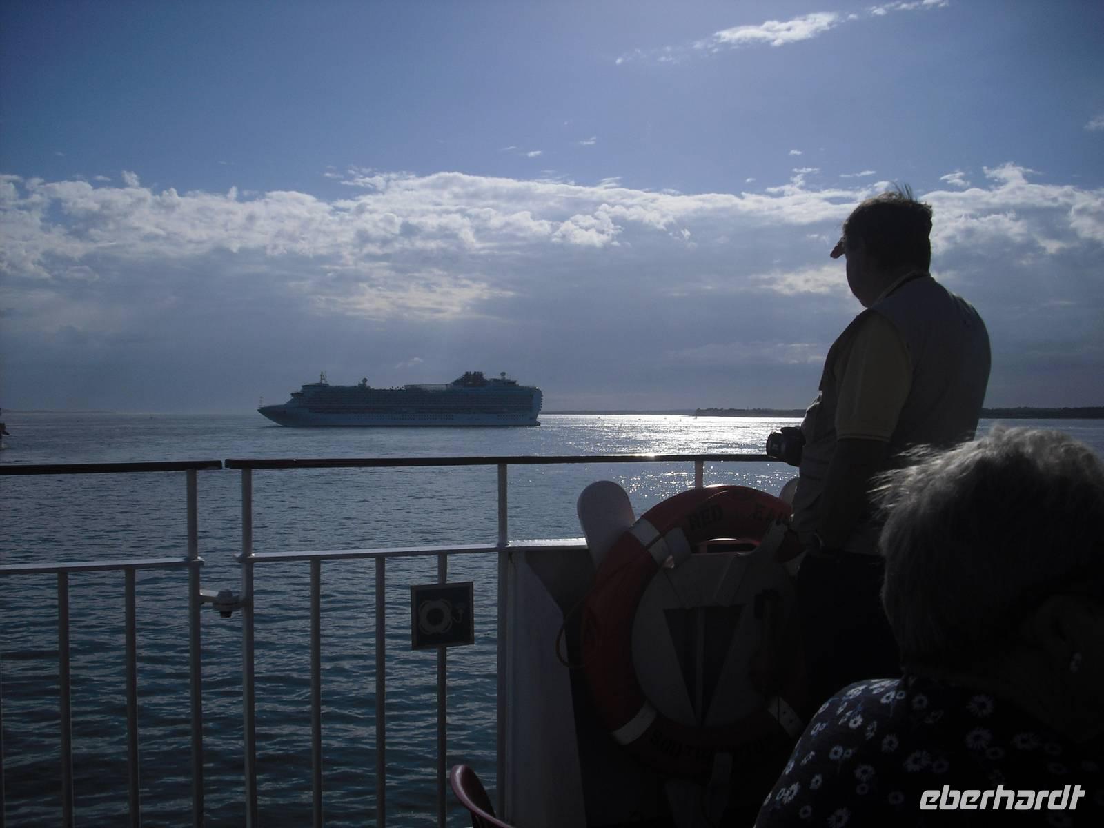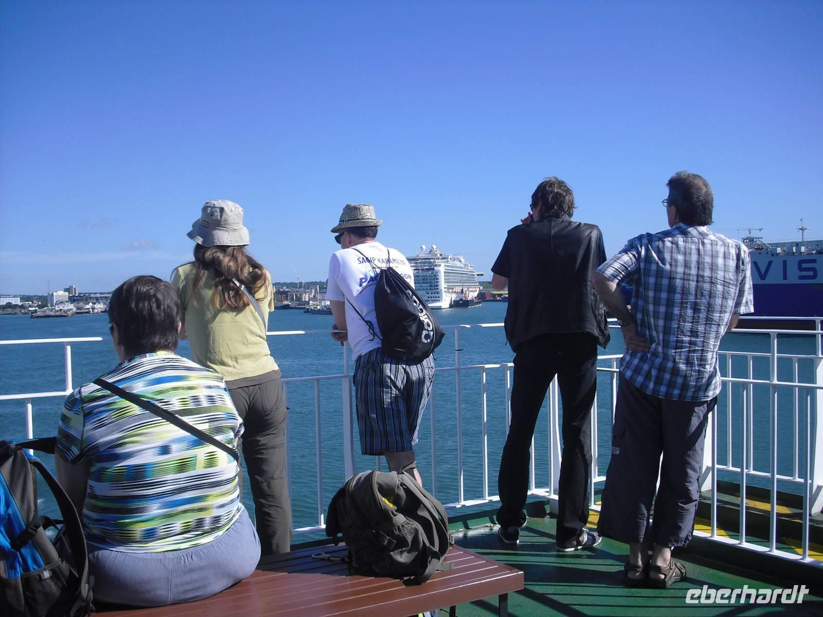 Frühstück und Start ohne Gepäck zum Fähranleger in Southampton. Pünktlich legte die erste Fähre ab, um uns nach East Cowes auf der Isle of Wight zu bringen. Zunächst besichtigten wir nach einer kleinen Wanderung die Naturfreunden bekannten Needles und das bei ganz hervorragendem Wetter mit einer Supersicht. Auf der südlichen Küstenstraße entlangfahrend gelangten wir nach Godshill. Hier unternahmen wir einen Ortsspaziergang vorbei an der alten Schmiede, dem ältesten Pub und hinauf zum "Gotteshügel". Jeder konnte nun eine TEA TIME einlegen. Anschließend ging es nach Shanklin und die meisten besuchten die Shanklin Chine. Diese Klamm bot sich majestätisch ruhig, erfrischend und erholsam an. Über Ryde und noch mit einem Fotostopp fuhren wir zurück nach East Cowes zum Fähranleger. Pünktlich legten wir nach Southampton ab und beobachteten noch das Auslaufen des Kreuzfahrtschiffes "Queen Elisabeth II." .Ein besonderes Spektakel war die Kommunikation beider Kapitäne mit dem Schiffshorn.