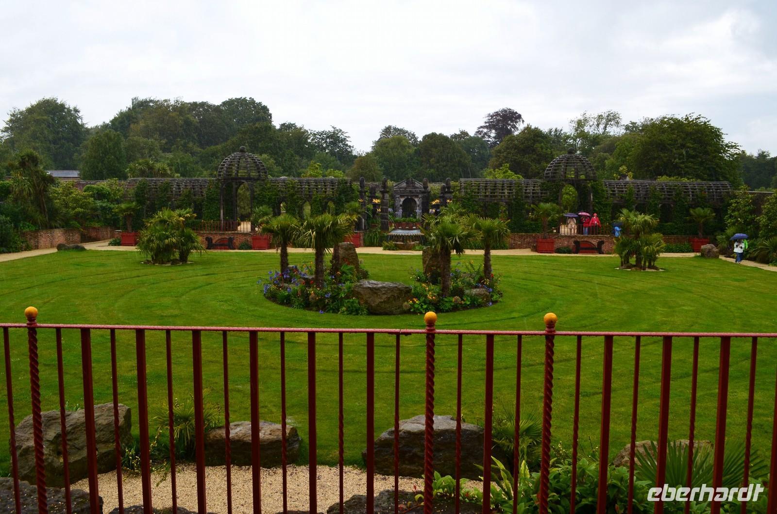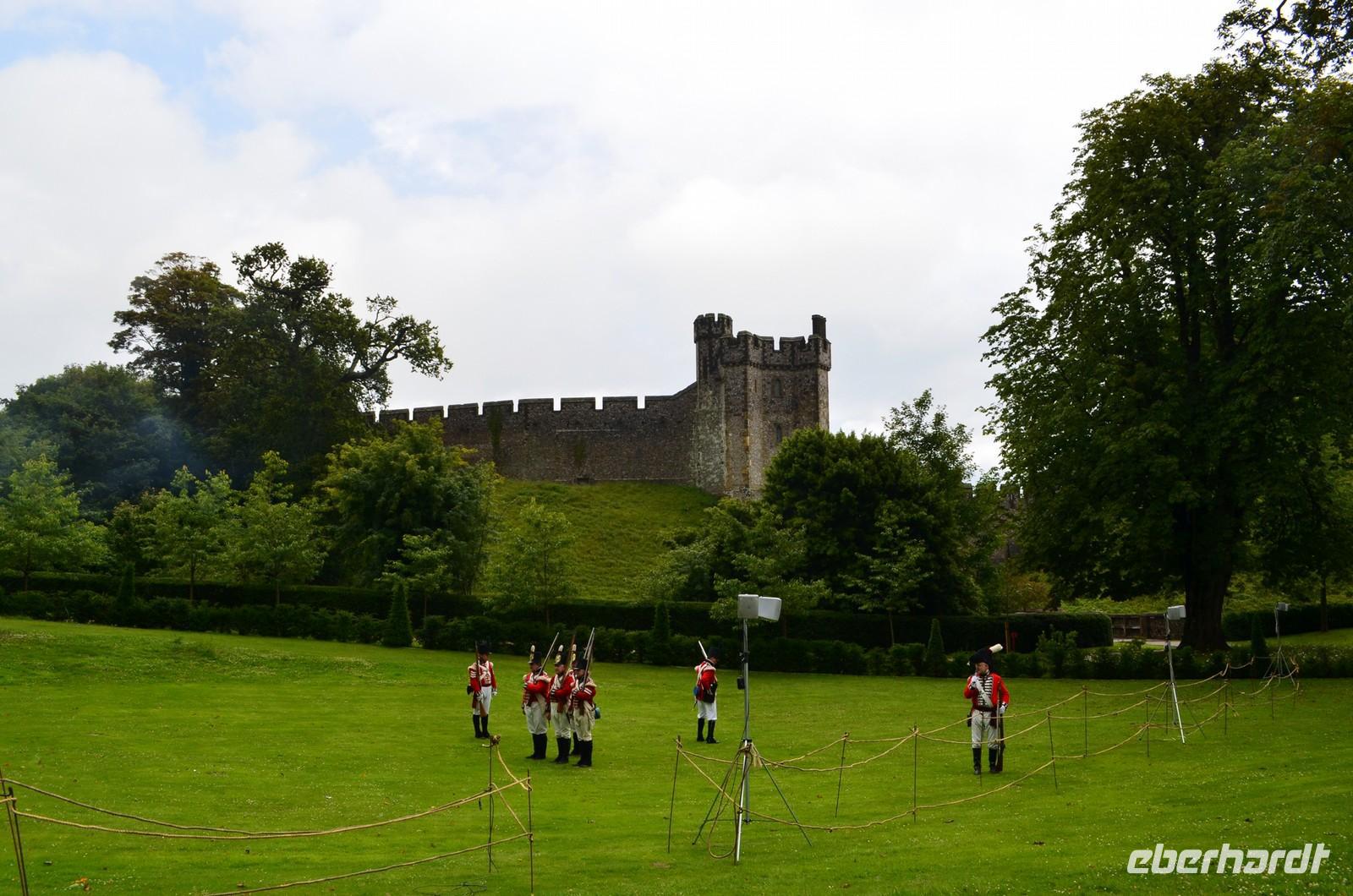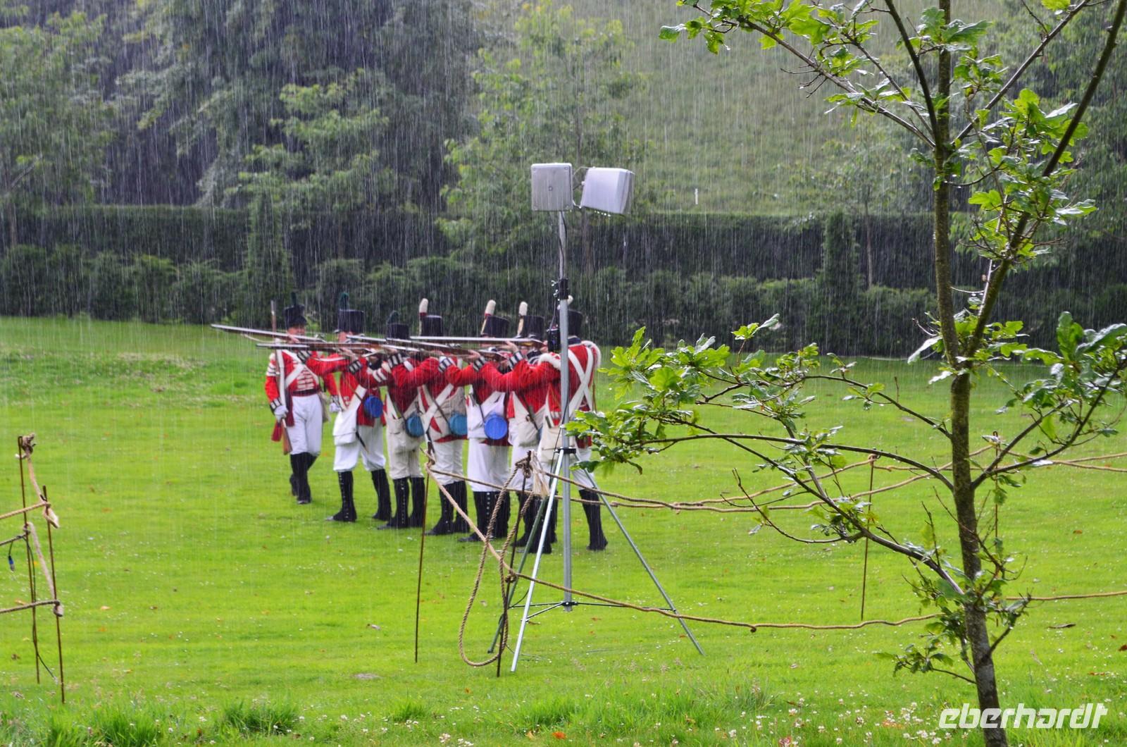 Danach beginnt unser gemeinsamer Besuch des Schlosses mit seinem schönen Garten und Park. Wir haben Glück und im Park ist gerade ein Sonderprogramm mit historischen Soldaten und Schmugglern. Leider gießt es teilweise so aus Kannen, dass sogar die exerzierenden „Rotröcke“ aufgeben. Die Besichtigung des Schlosses mit seinen Gemälden ist aber eine sehr attraktive Entschädigung.