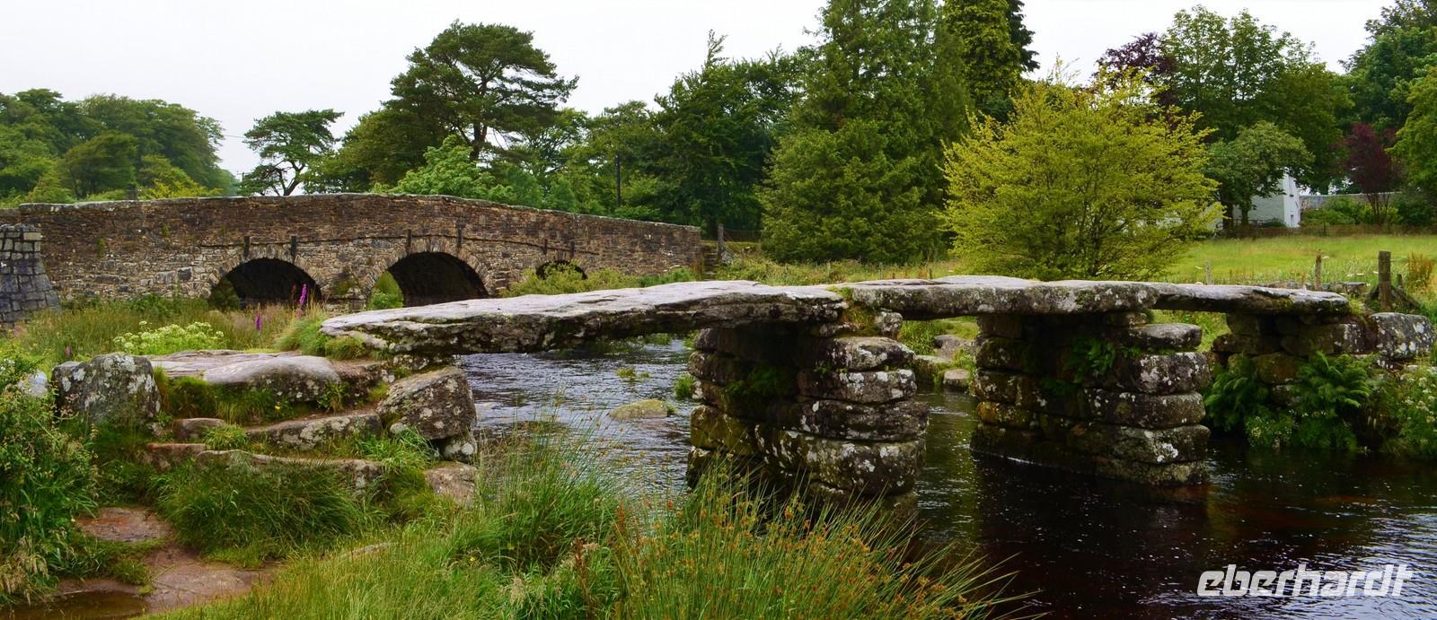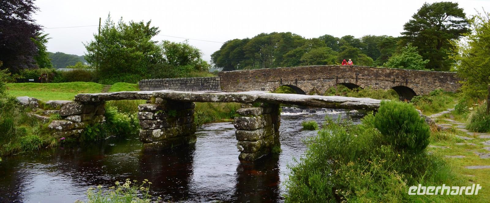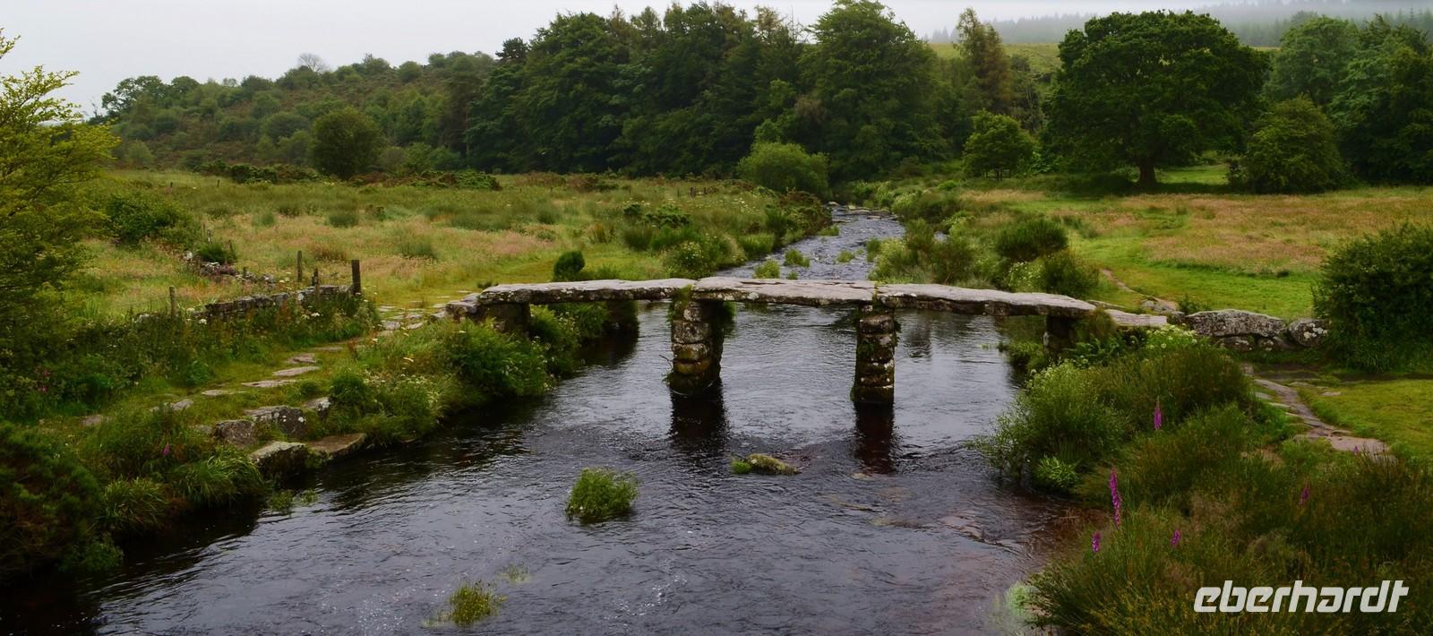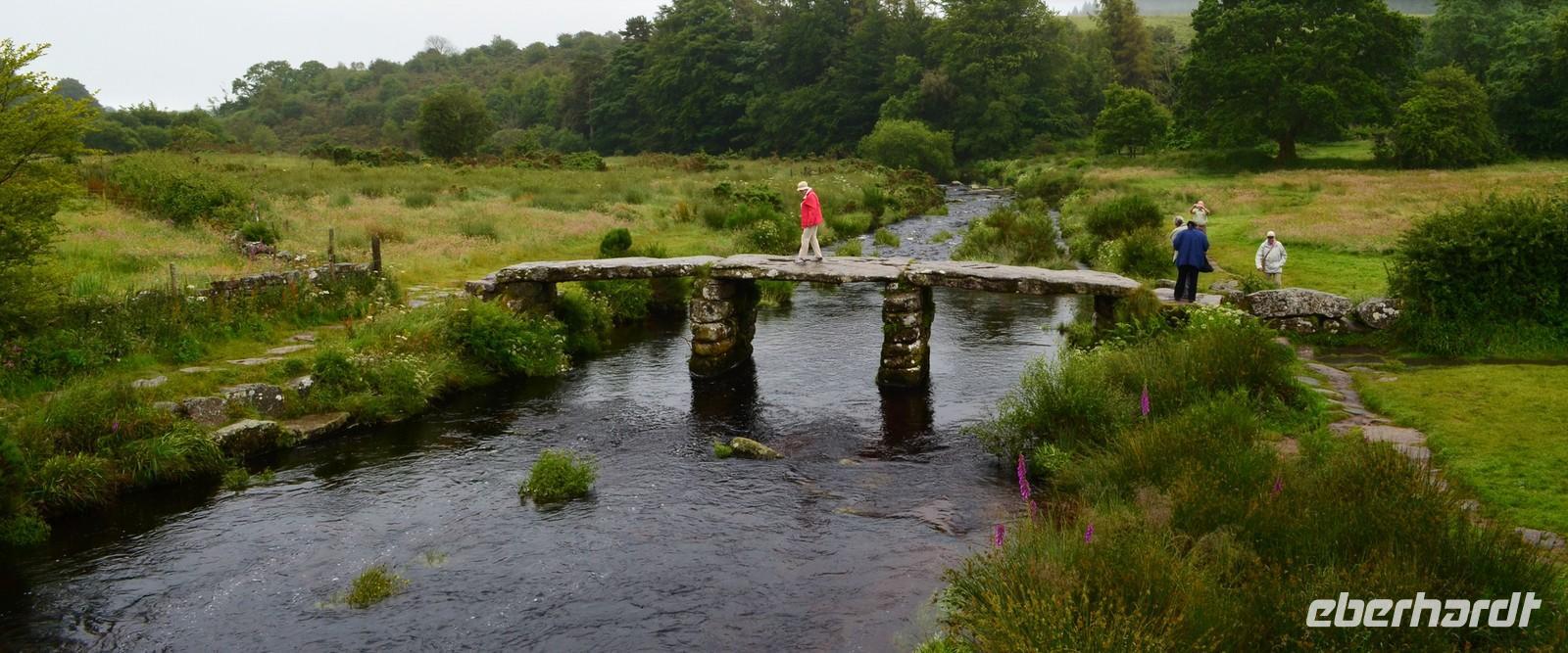 Vorher geht es jedoch durch das sagenumwobene Dartmoor. Erst ist es klar und schön, aber ab Mortenhampstead kommt der Nebel. Wir machen Fotostopp an der Postbridge, besichtigen die Brücken. Fahren dann bei Nebel und Regen am Gefängnis von Princetown vorbei, doch die Hügel vor Tavistock mit ihren typischen Rocks sind durch das Wetter nicht zu erkennen.
