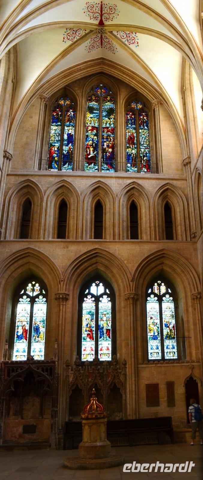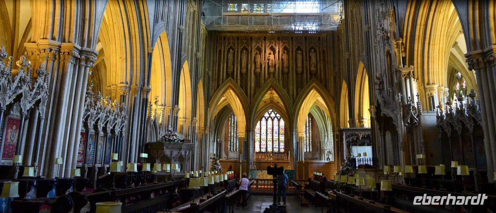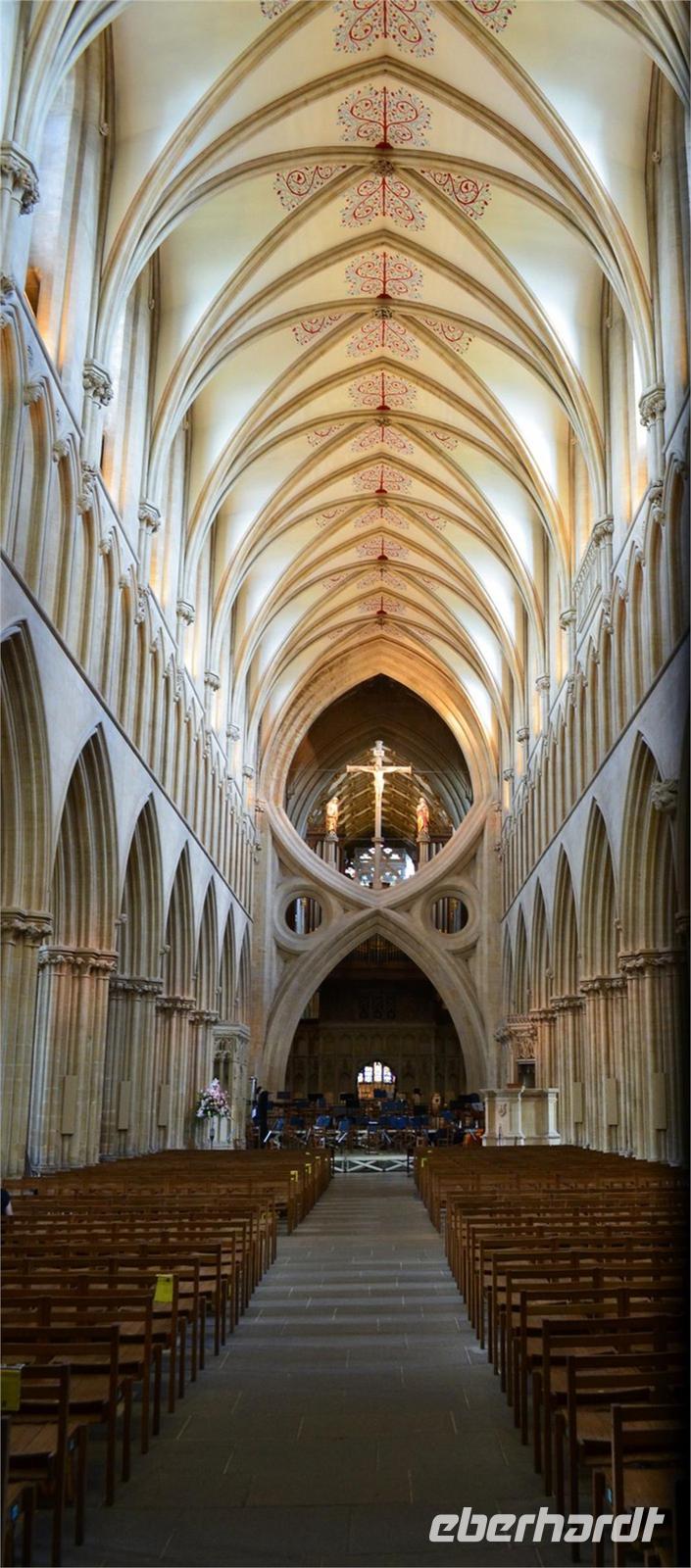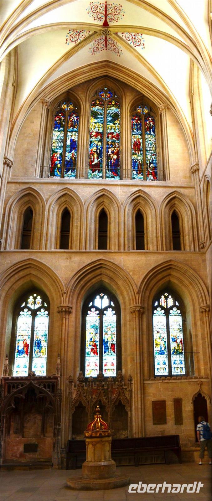 Dann die Weiterfahrt nach Wells, dem nächsten schönen Ort an diesem Nachmittag. Das hübsche Stadtzentrum und die sehenswerte Cathedral sind unsere Ziele. Wir erstellen die Gruppenfotos vor der dritten der berühmtesten Kirchen-Westfassaden Englands, dann ist individuelle Besichtigung des Kircheninneren - mit den kämpfenden Rittern an der historischen Uhr, dem imposanten Stützwerk des Vierungsturmes usw.