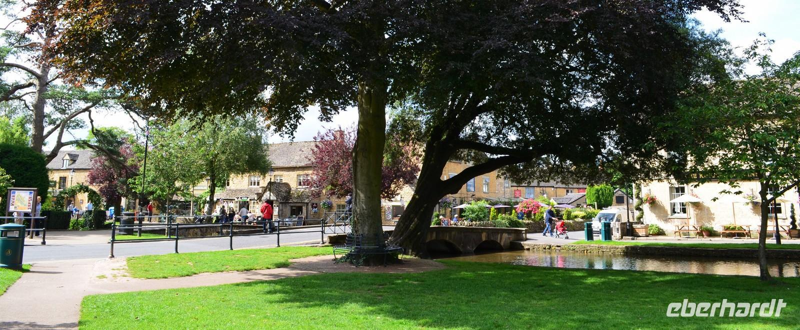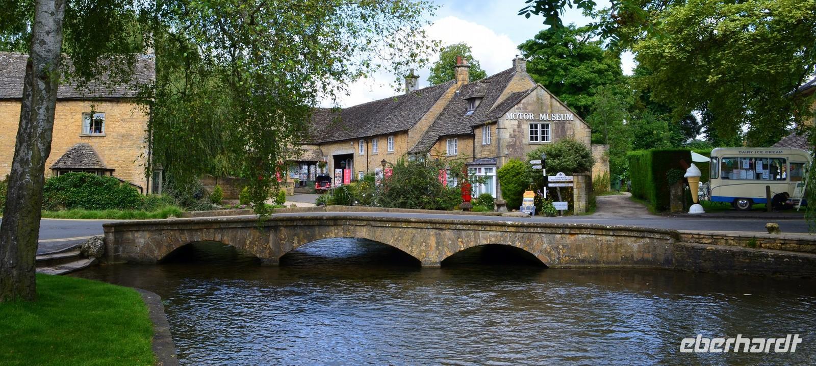 Der kleine reizende Ort Bourton on the Water ist unser Ziel - und ein sehr lohnendes. Mit den hübschen gelben Sandsteinhäusern und dem von vielen kleinen Brücken überspannten ruhigen Bachlauf.