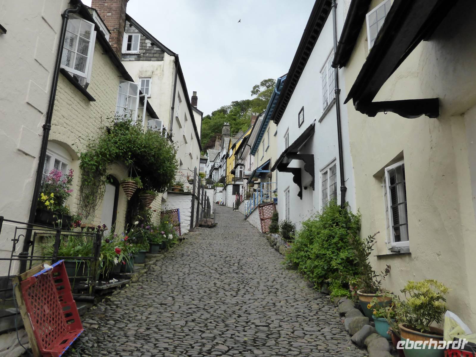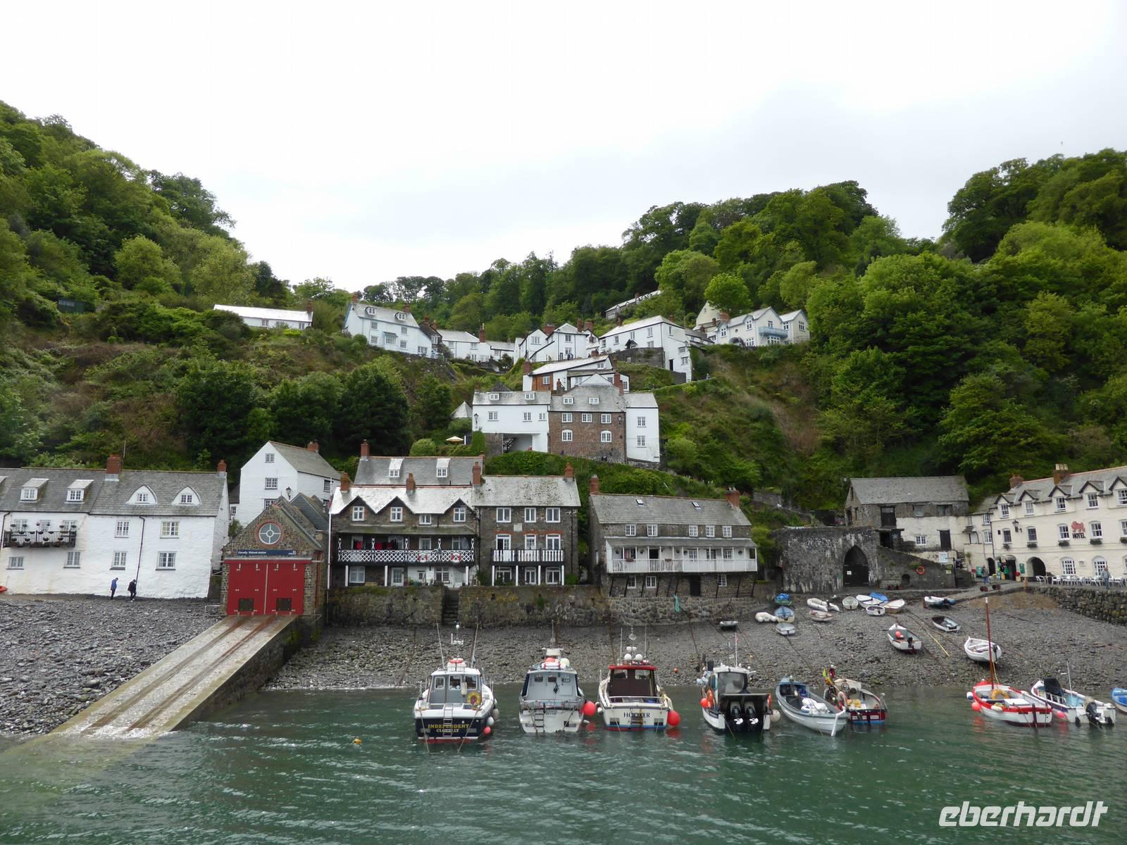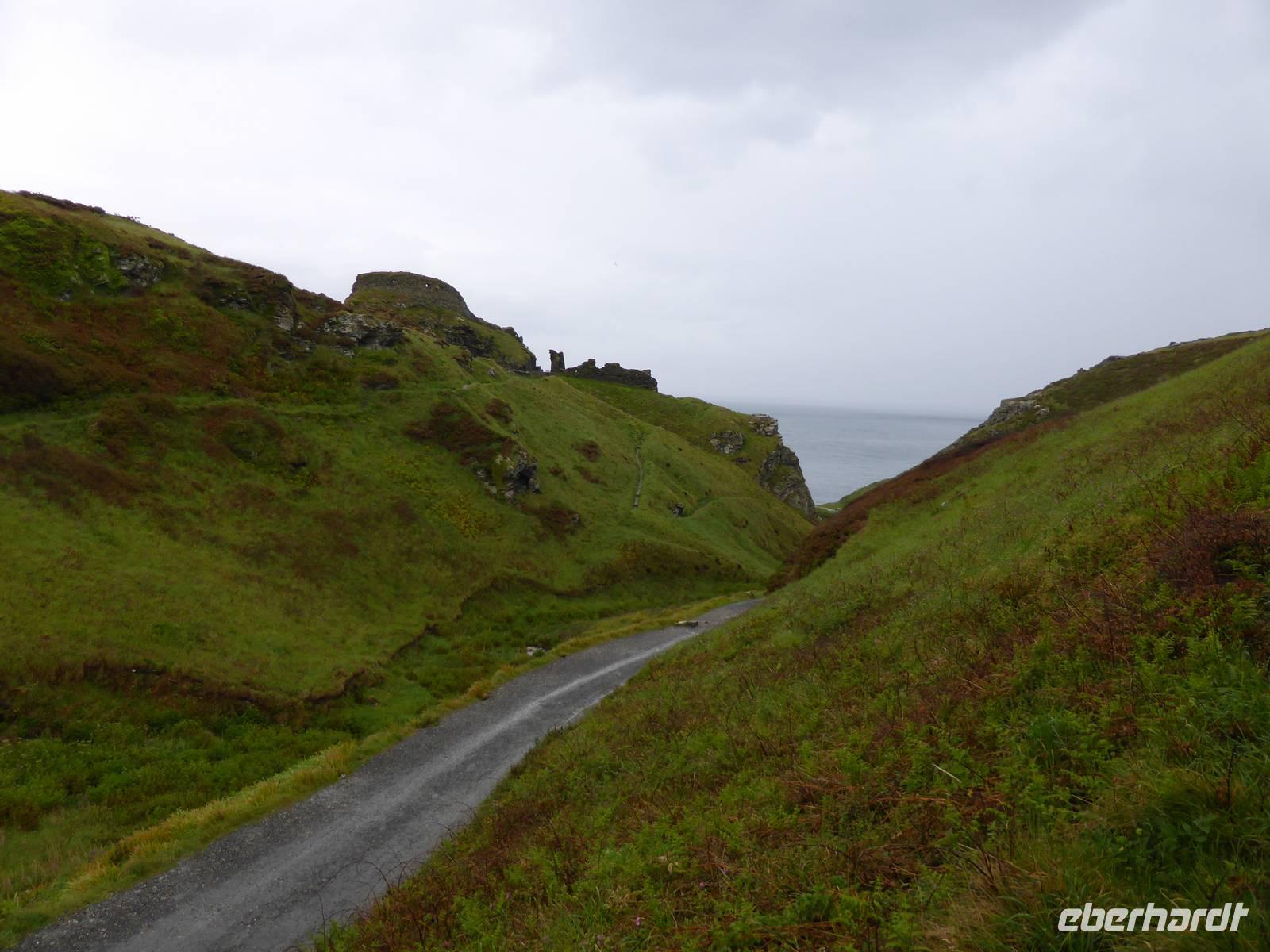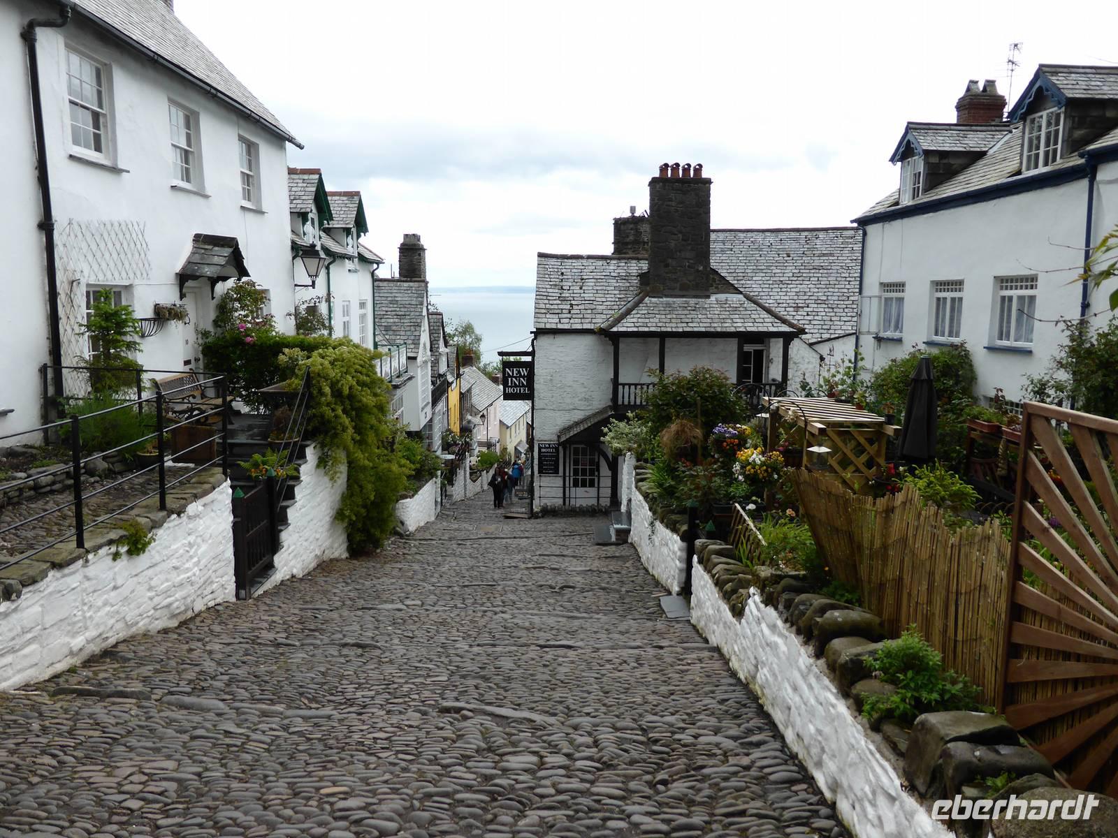 Leider sollte der heutige Tag total verregnet sein. Am Vormittag stand Tintagel, König Artus´ Burg auf dem Programm. Anziehungspunkt ist eine Burgruine auf zwei Klippen, wo Artus gezeugt und unter Anleitung des Zauberers Merlin aufgewachsen sein soll. Allerdings wurde die Burg ca. 700 Jahre nach König Artus anstelle einer keltischen Klostersiedlung errichtet. Bei strömenden Regen erklommen wir die Burgruine. Auf dem Weg hinauf drohte uns Artus mit einem Donner. Es hatte schon etwas Mystisches an sich. Über Boscastle, einem winzigen Weiler und ehemalige Schmugglerhochburg erreichten wir Clovelly. Während dieser Fahrt hatten wir tierische Hindernisse.
