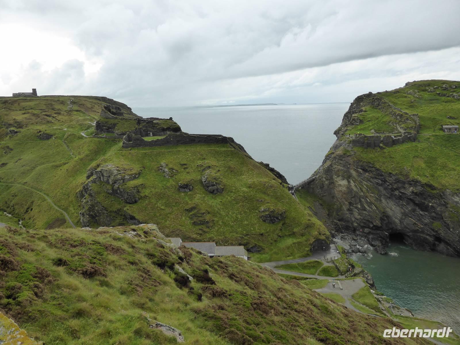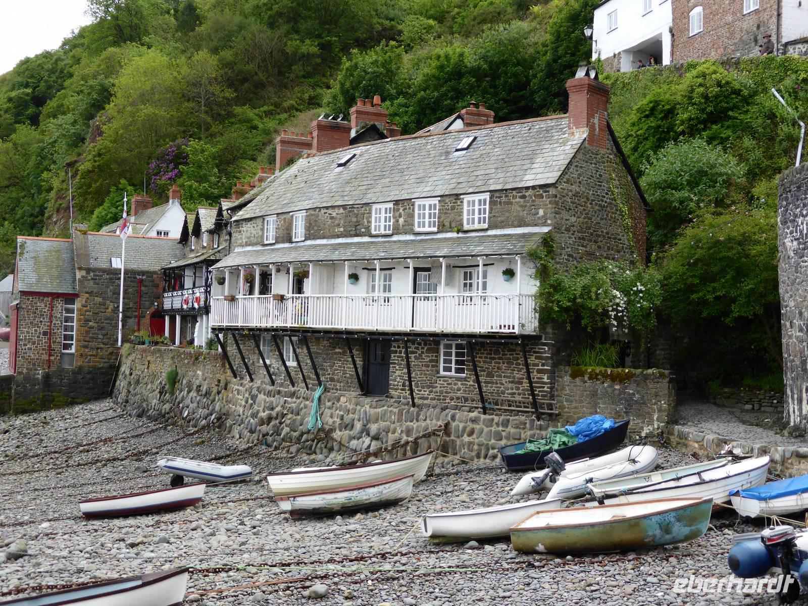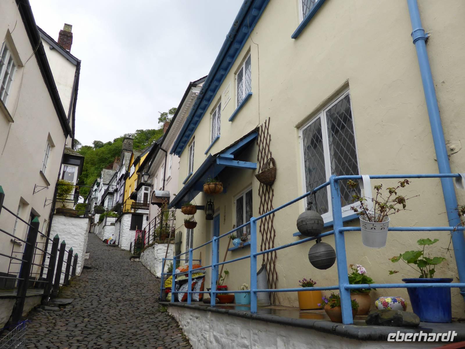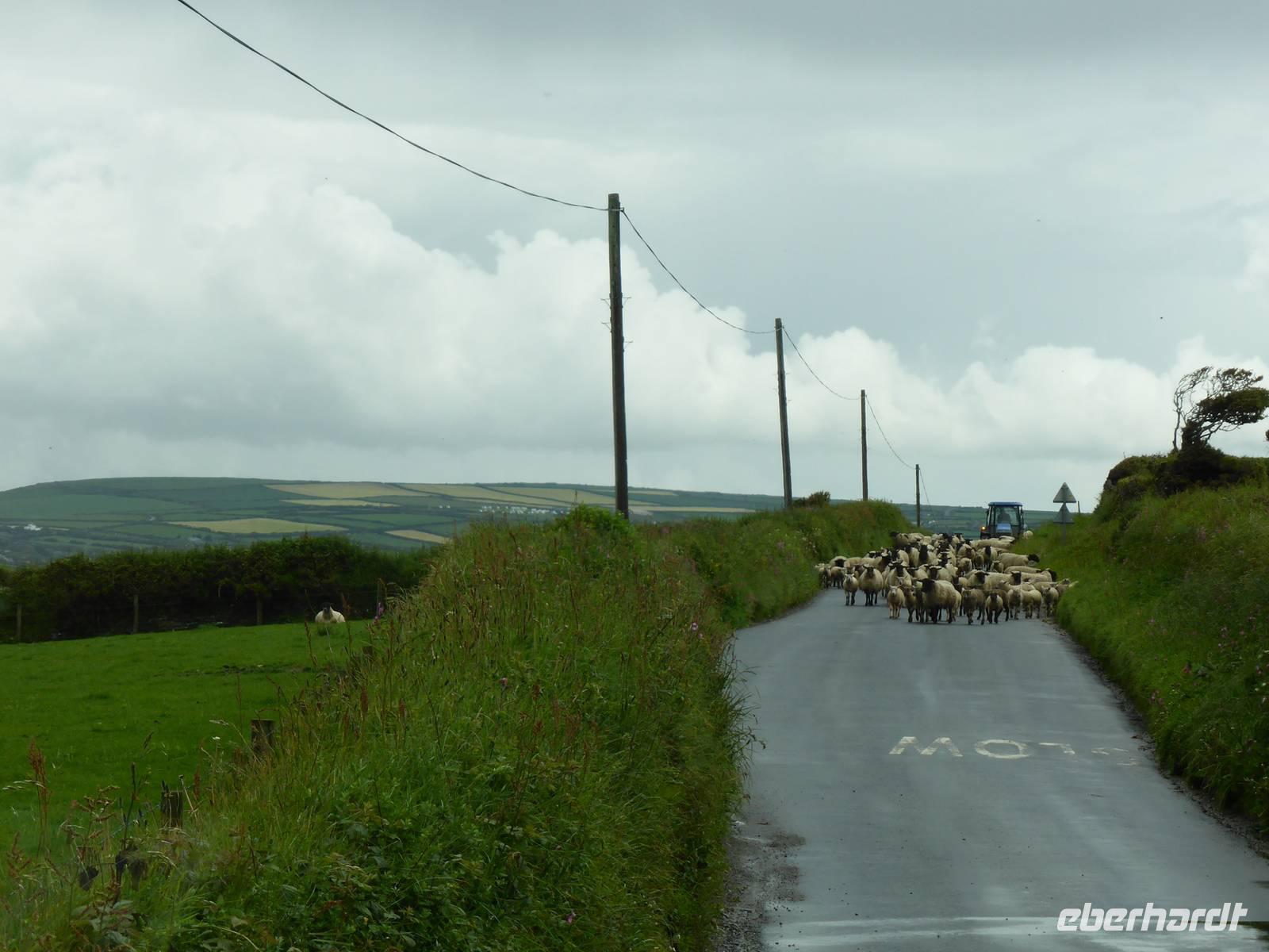 Leider sollte der heutige Tag total verregnet sein. Am Vormittag stand Tintagel, König Artus´ Burg auf dem Programm. Anziehungspunkt ist eine Burgruine auf zwei Klippen, wo Artus gezeugt und unter Anleitung des Zauberers Merlin aufgewachsen sein soll. Allerdings wurde die Burg ca. 700 Jahre nach König Artus anstelle einer keltischen Klostersiedlung errichtet. Bei strömenden Regen erklommen wir die Burgruine. Auf dem Weg hinauf drohte uns Artus mit einem Donner. Es hatte schon etwas Mystisches an sich. Über Boscastle, einem winzigen Weiler und ehemalige Schmugglerhochburg erreichten wir Clovelly. Während dieser Fahrt hatten wir tierische Hindernisse.