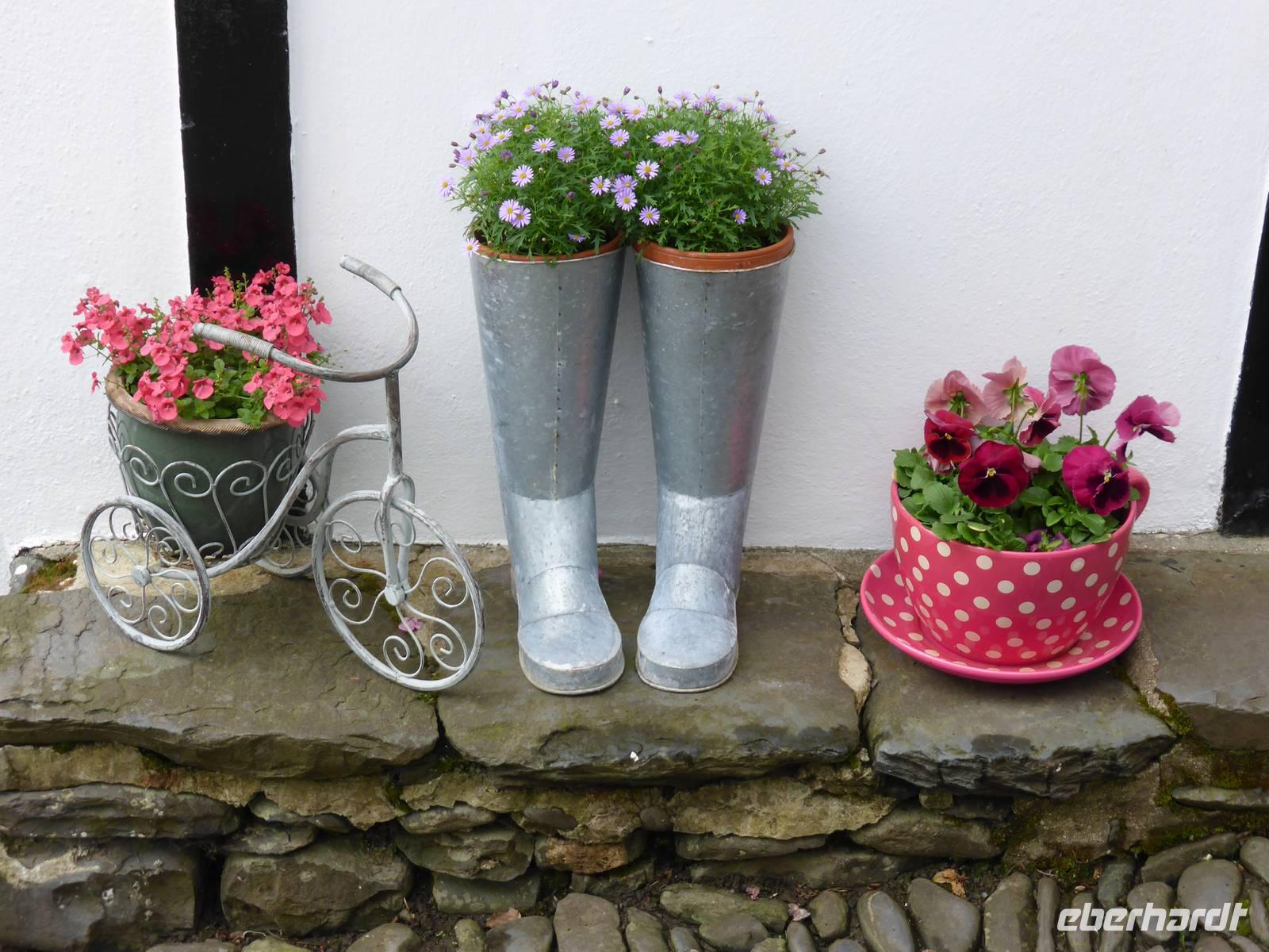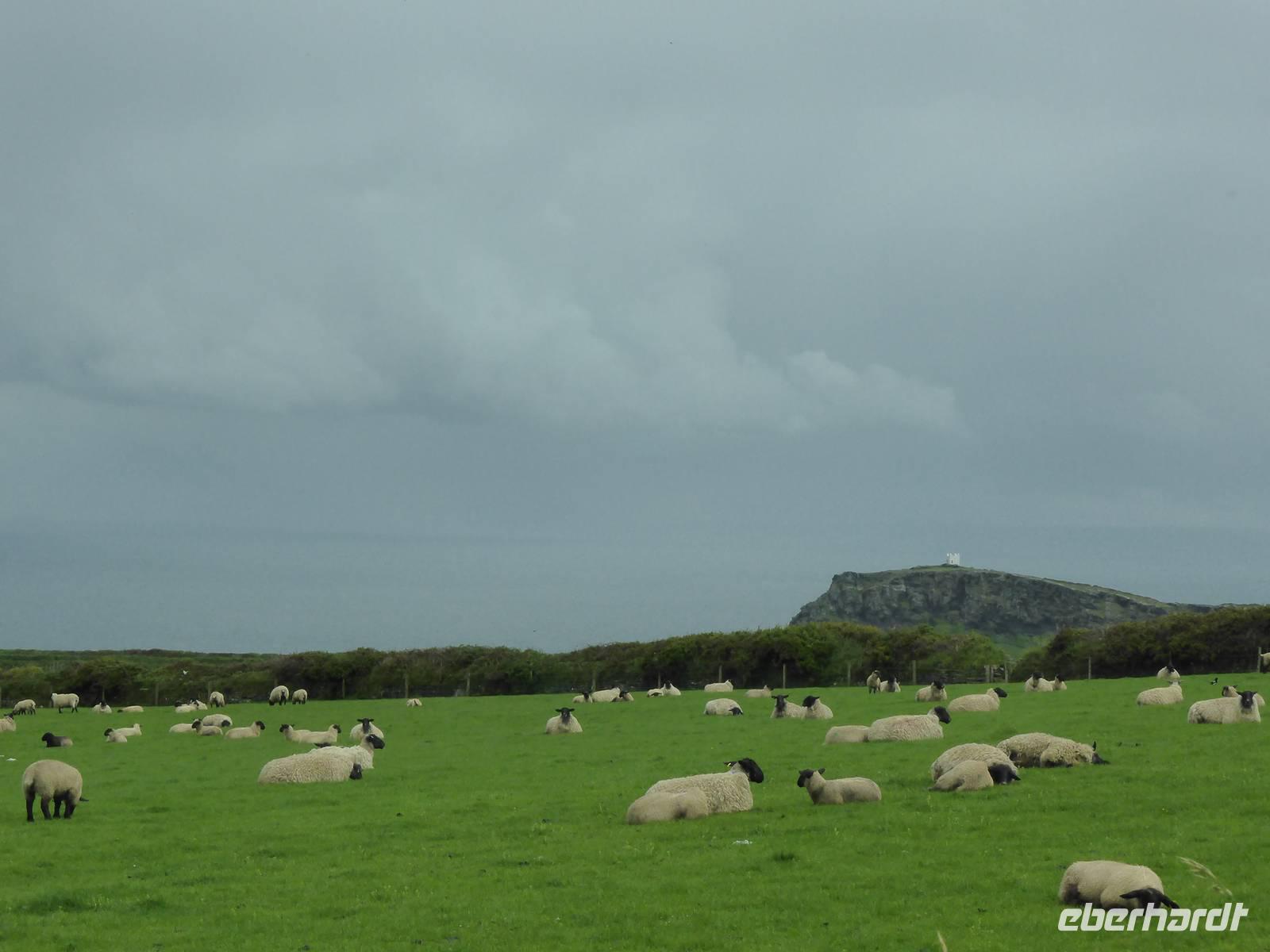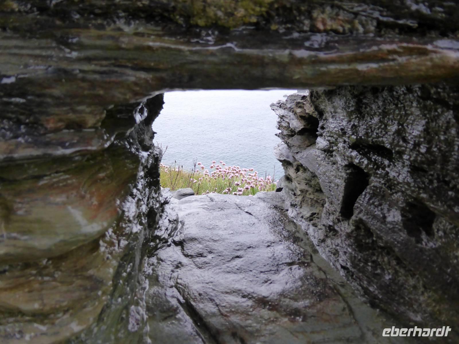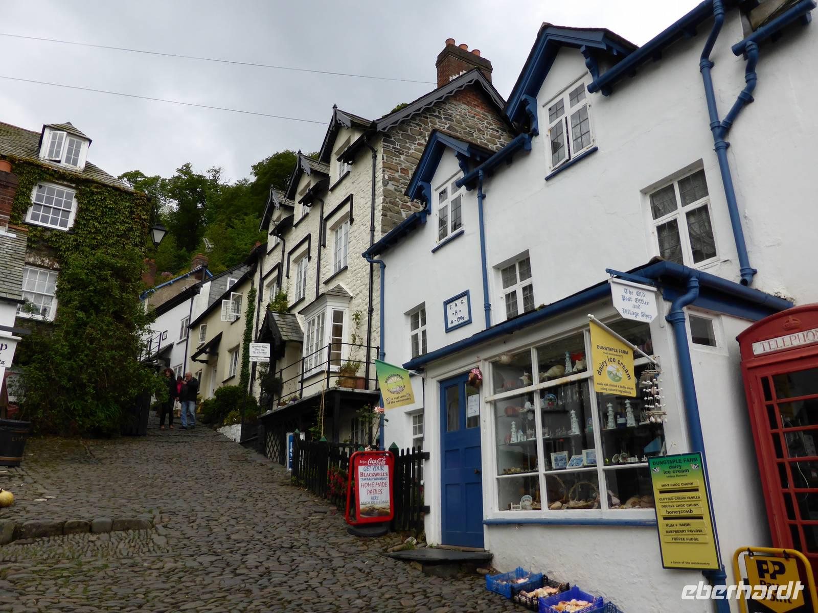 Leider sollte der heutige Tag total verregnet sein. Am Vormittag stand Tintagel, König Artus´ Burg auf dem Programm. Anziehungspunkt ist eine Burgruine auf zwei Klippen, wo Artus gezeugt und unter Anleitung des Zauberers Merlin aufgewachsen sein soll. Allerdings wurde die Burg ca. 700 Jahre nach König Artus anstelle einer keltischen Klostersiedlung errichtet. Bei strömenden Regen erklommen wir die Burgruine. Auf dem Weg hinauf drohte uns Artus mit einem Donner. Es hatte schon etwas Mystisches an sich. Über Boscastle, einem winzigen Weiler und ehemalige Schmugglerhochburg erreichten wir Clovelly. Während dieser Fahrt hatten wir tierische Hindernisse.