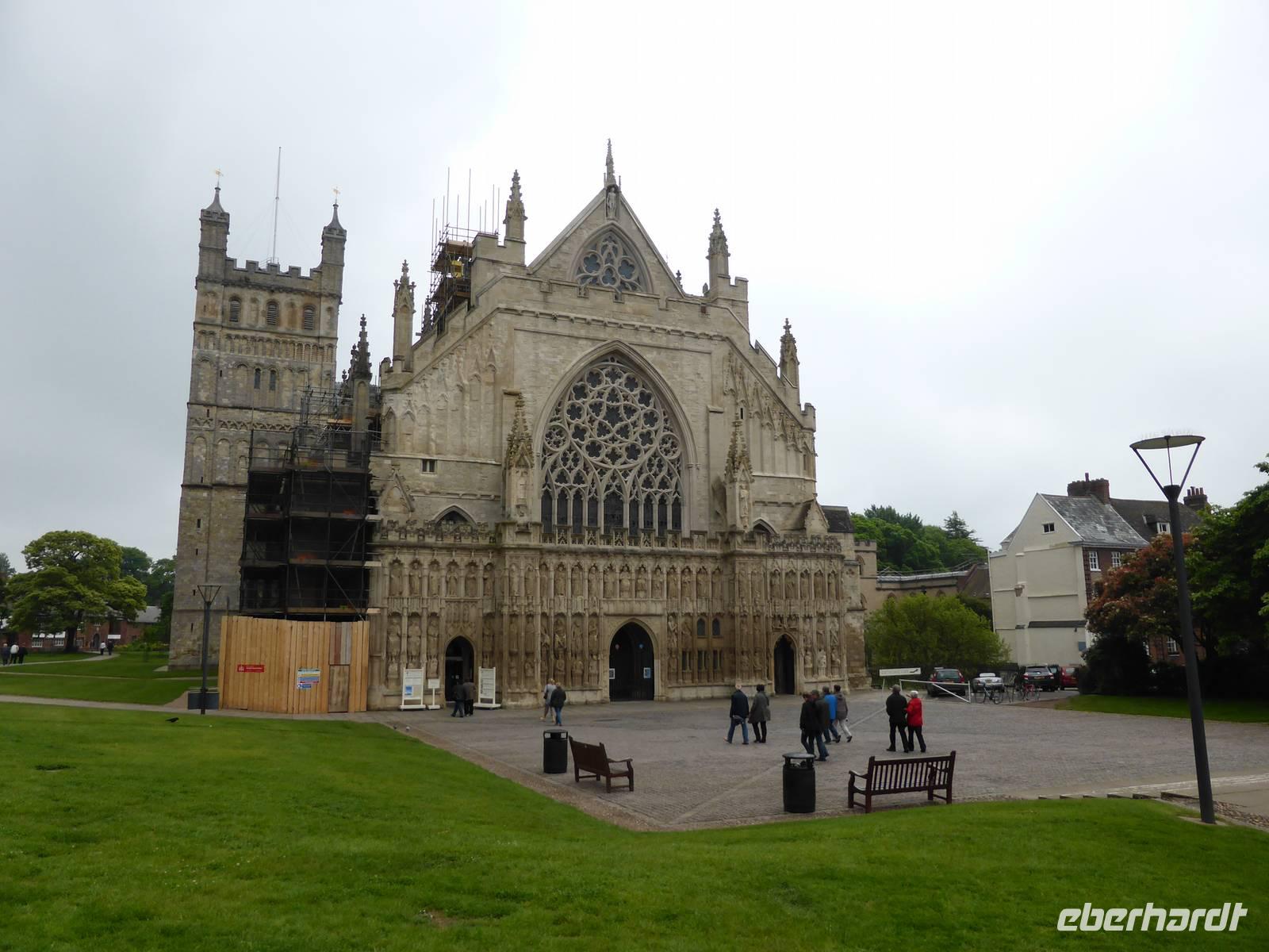 Gestärkt durch das Frühstück unternahmen wir einen Bummel durch Exeter. Dabei kamen wir vorbei am Rougemont Castle. Erst nach zwei Jahren der Belagerung konnte Wilhelm der Eroberer Exeter einnehmen und ließ diese Burg errichten, um die widerspenstige Ansiedlung besser kontrollieren zu können. Anschließend erreichten wir in der High Street die mächtige Guildhall, deren Ursprünge auf das Jahr 1160 zurück gehen. Damit ist es das älteste Verwaltungsgebäude Englands. Unser Ziel war die Kathedrale mit einer der kleinsten Domfreiheiten Englands. Die beeindruckende Westfassade ist im reinsten Decorated Style (englische Hochgotik) errichtet worden.