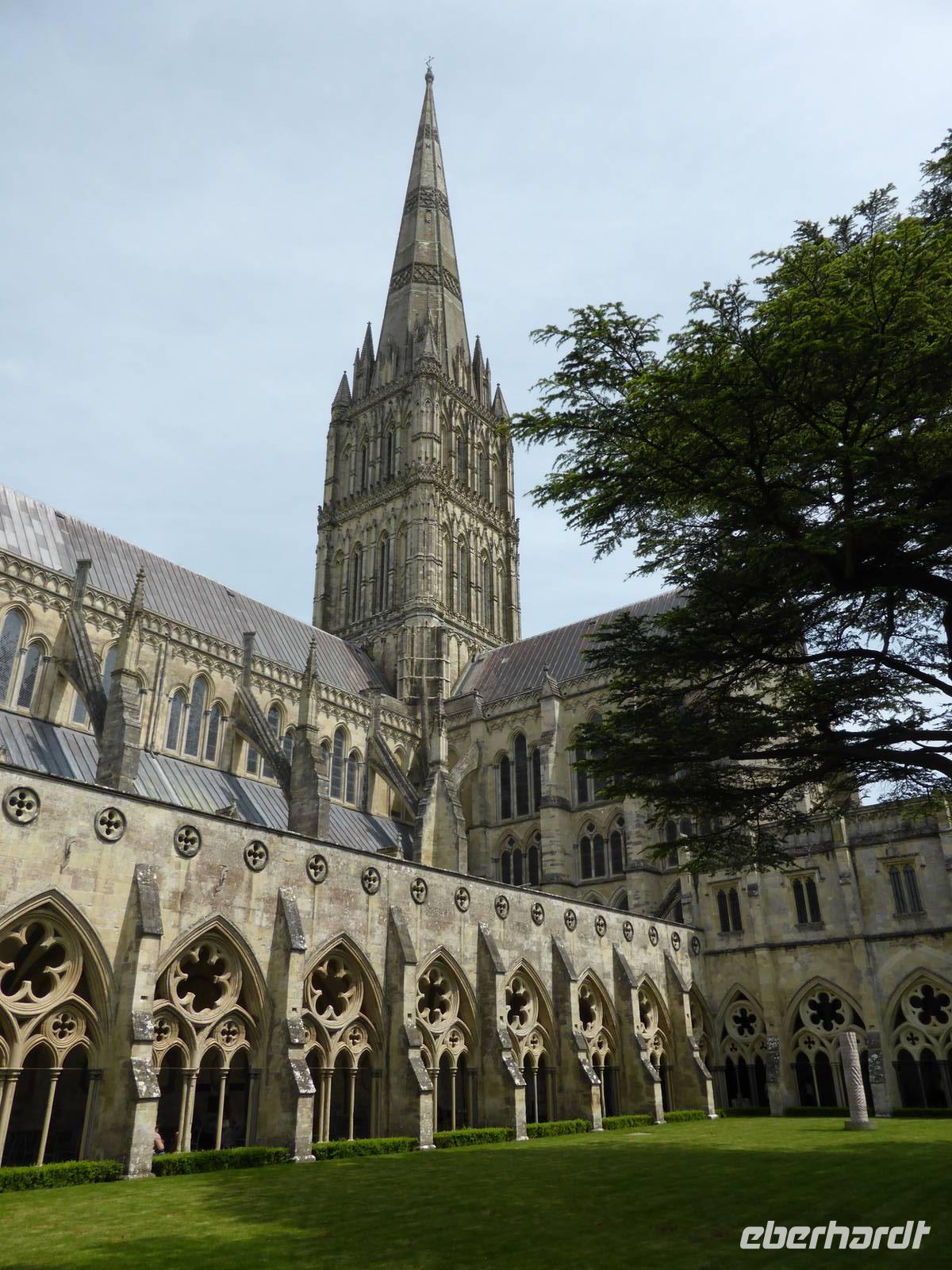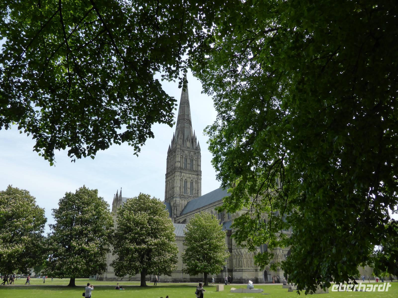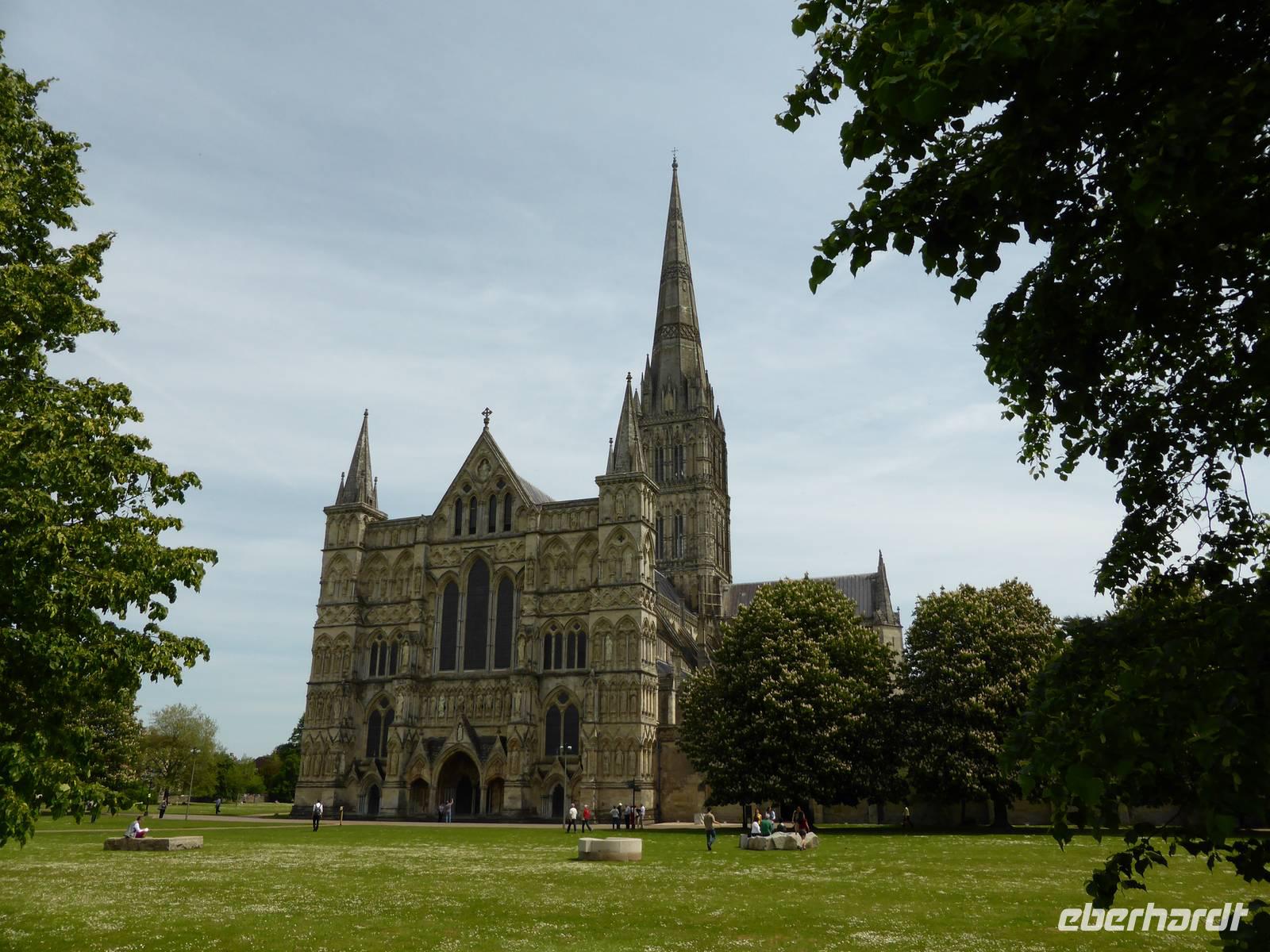 Nach diesem beeindruckendes Erlebnis führte uns der Weg nach Salisbury. Salisbury gehört mit der prachtvollen Kathedrale sowie der romantisch verträumten Altstadt zu den schönsten Städten Englands. Im 13. Jh. entstand in sehr kurzer Bauzeit ein gotisches Wunderwerk, das fast ausschließlich im reinsten Early-English-Stil (engl. Frühgotik) errichtet worden ist. Von Ferne grüßte uns bereits der 123 m hohe schlanke Turm, der höchste Kirchturm Englands. Dieser Turm brachte den Baumeistern viel Kopfzerbrechen, da er aus statischen Gründen nicht hätte gebaut werden dürfen. Unser Weg führte uns durch die größte Domfreiheit aller englischen Kathedralen zur Westfassade mit ihrem reichen Skulpturenschmuck.