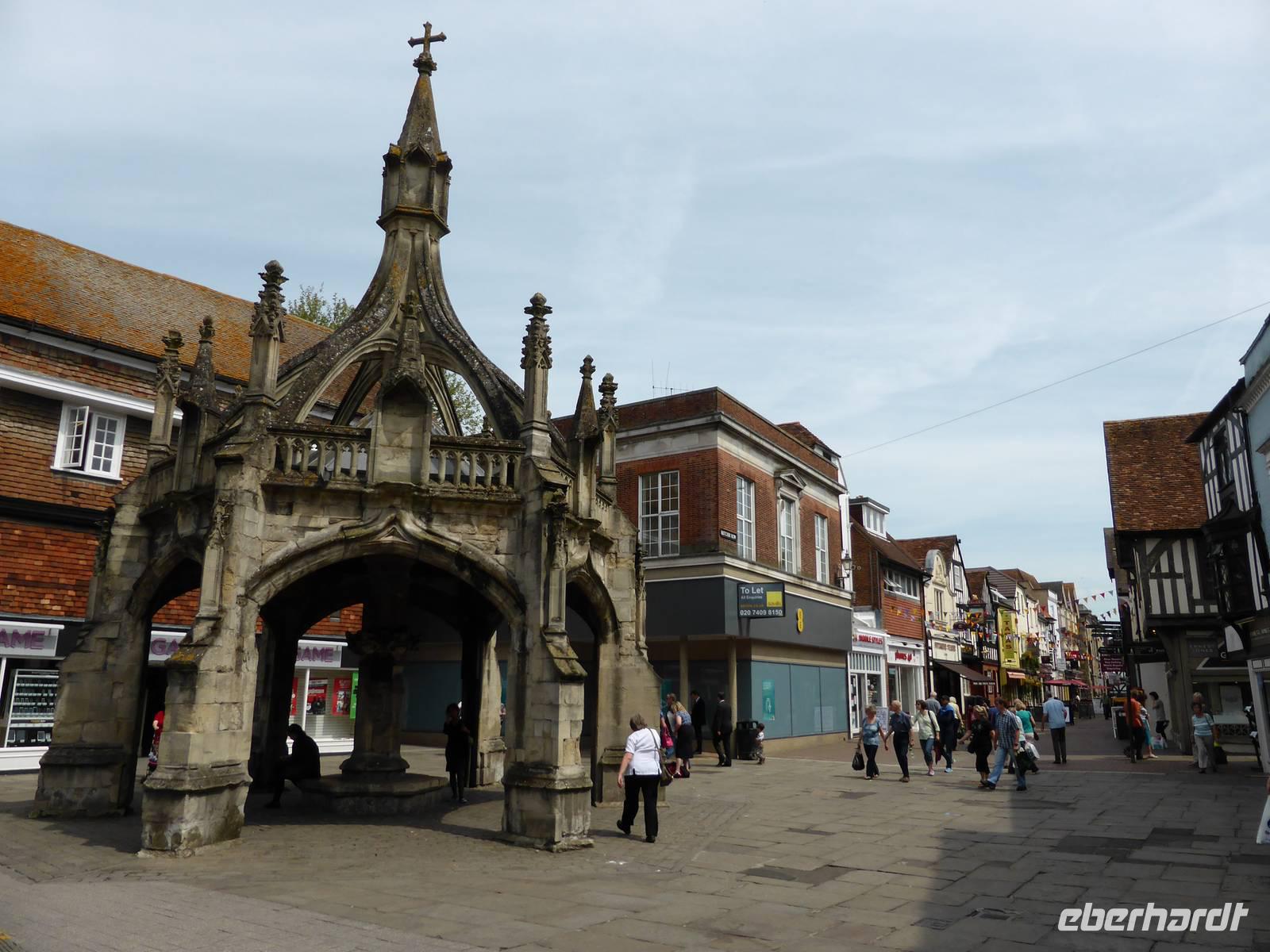 Unser Rundgang im Inneren führte uns vorbei an dem ältesten Uhrwerk Englands, durch die Vierung mit ihren verbogenen Hauptsäulen sowie an verschiedenen Grabmälern ins Kapitelhaus mit der berühmten Magna Charta. In dieser Urkunde aus dem Jahr 1215 erhielten Adel und Kirche weitreichende Rechte und zwangen den verhassten König John Ohneland diese zu unterschreiben. Eines von vier erhaltenen Exemplaren befindet sich im Kapitelhaus von Salisbury. Nach der Besichtigung stand die verbleibende Zeit zur freien Verfügung. Einige Gäste nutzen die Gelegenheit, sich die Altstadt von Salisbury anzuschauen.