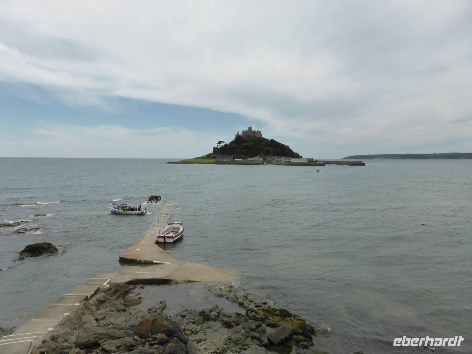 Unsere ersten Ausflugsziele waren heute St. Michael´s Mount sowie die westliche Spitze von Cornwall - Lands End. Aufgrund der Flut nutzen wir in Marazion die kleinen Boote, um auf die Insel von St. Michaels Mount zu gelangen. In der Chronik der Felseninsel heißt es, dass 495 der Hl. Michael den Fischern erschienen sein soll. So wurde der Platz zum heiligen Ort, an dem das Christentum bis zur Reformation gepflegt wurde. Wilhelm der Eroberer überließ es bretonischen Benediktinermönchen des Mont St. Michel.