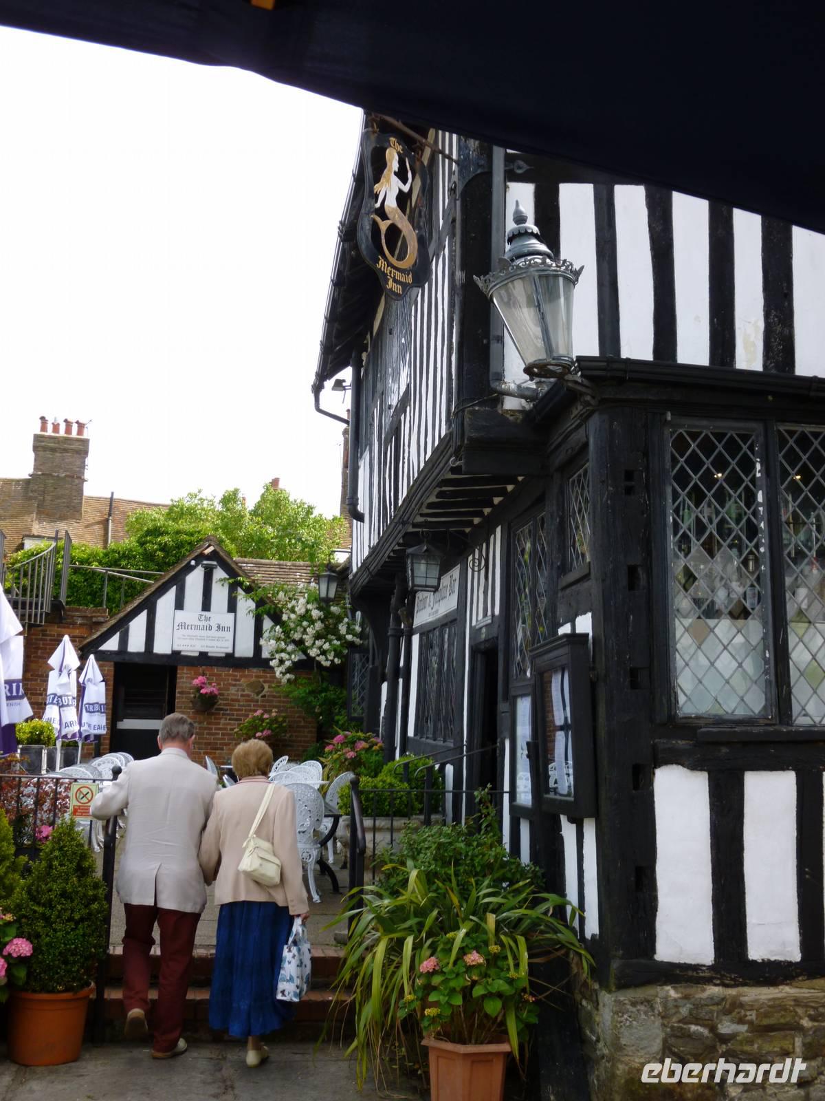 Gemeinsam spazierten wir über das Kopfsteinpflaster der Mermaid Street zum ehemaligen Schmugglerlokal "Mermaid Inn" (mit Gedicht von Rudyard Kipling) und "House Opposite" (für die, die fälschlicherweise statt in die Schmugglerkneipe dorthin verwiesen wurden), zum "Lamb House" bis zum Platz mit Kastell und Kirche auf dem Friedhof, wo gerade Filmaufnahmen mit 30er Jahre Kostümen gemacht wurden.