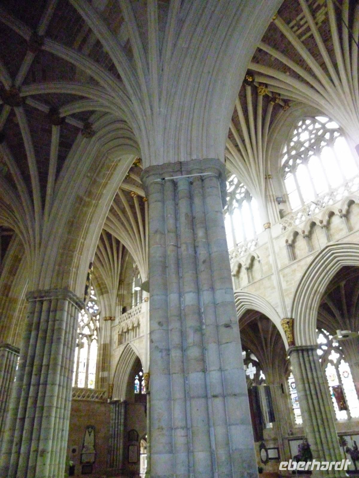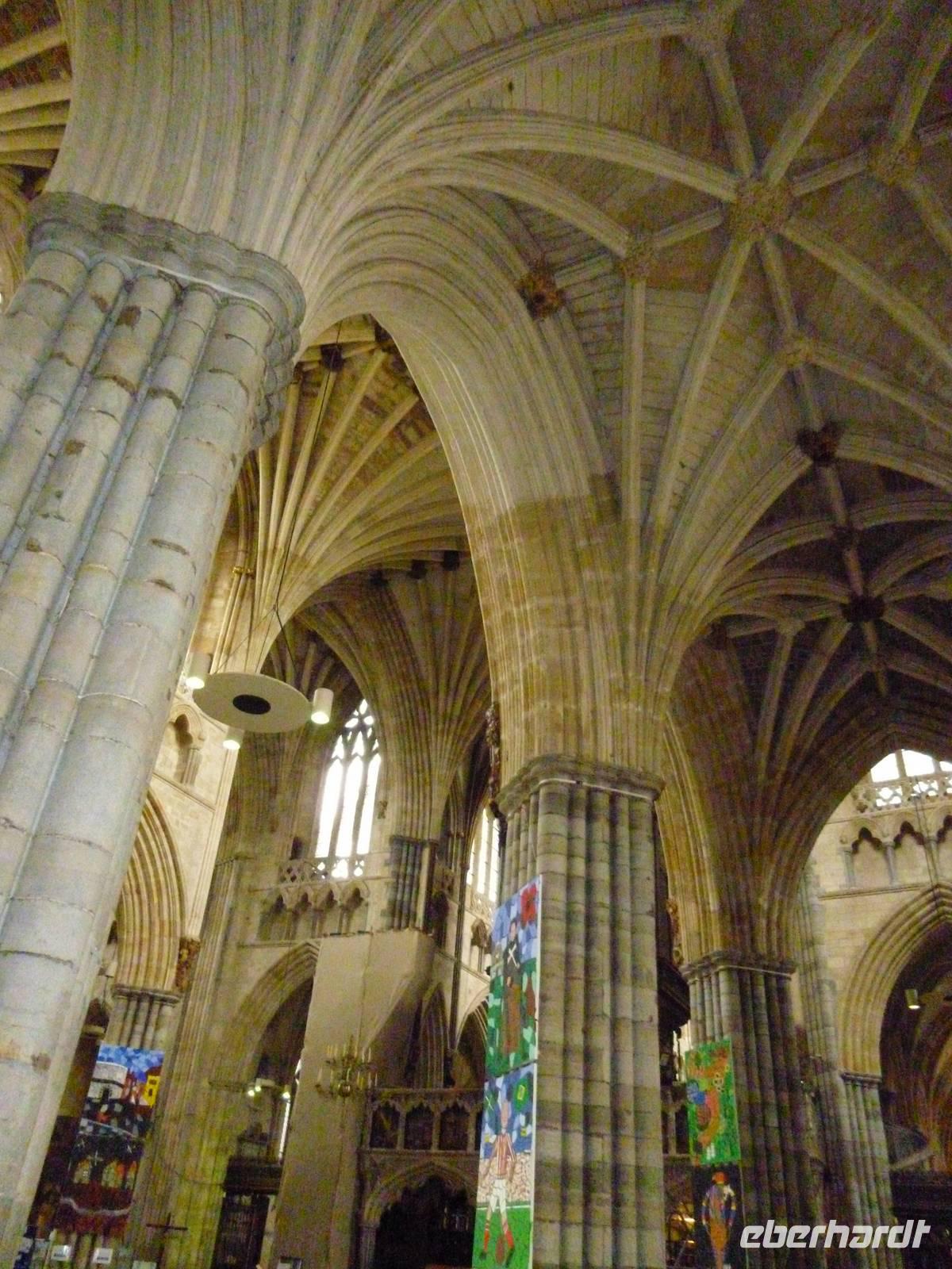 Die Römer, Normannen und Freibeuter waren natürlich vor uns auch in Exeter, der Hauptstadt der Grafschaft Devon. Von der Römischen Stadtmauer und der "Guildhall" aus dem Jahre 1468 auf der High Street sind es nur wenige Schritte (vorbei am "Ships Inn", wo Francis Drake gern einkehrte) zum Cathedral Close, wie durch ein Wunder von den Bomben des zweiten Weltkriegs verschont. Dort bewundern wir die St. Mary und St. Peter geweihte Exeter Cathedral, in einem Zuge im Stil der englischen Hochgotik (Decorated Style) 1275 vollendet.