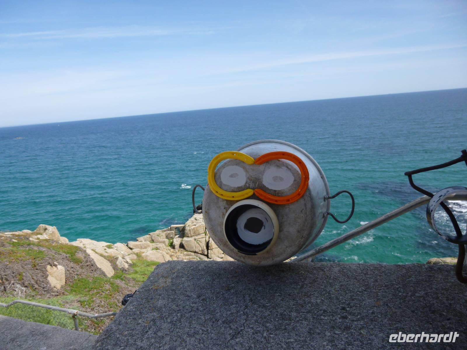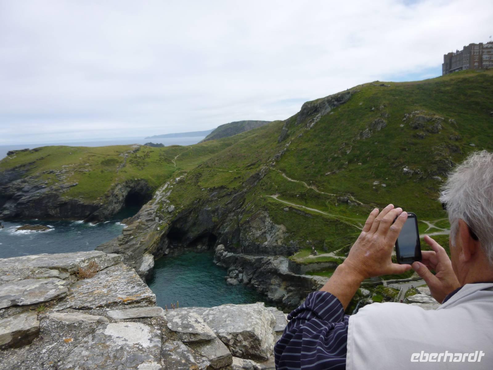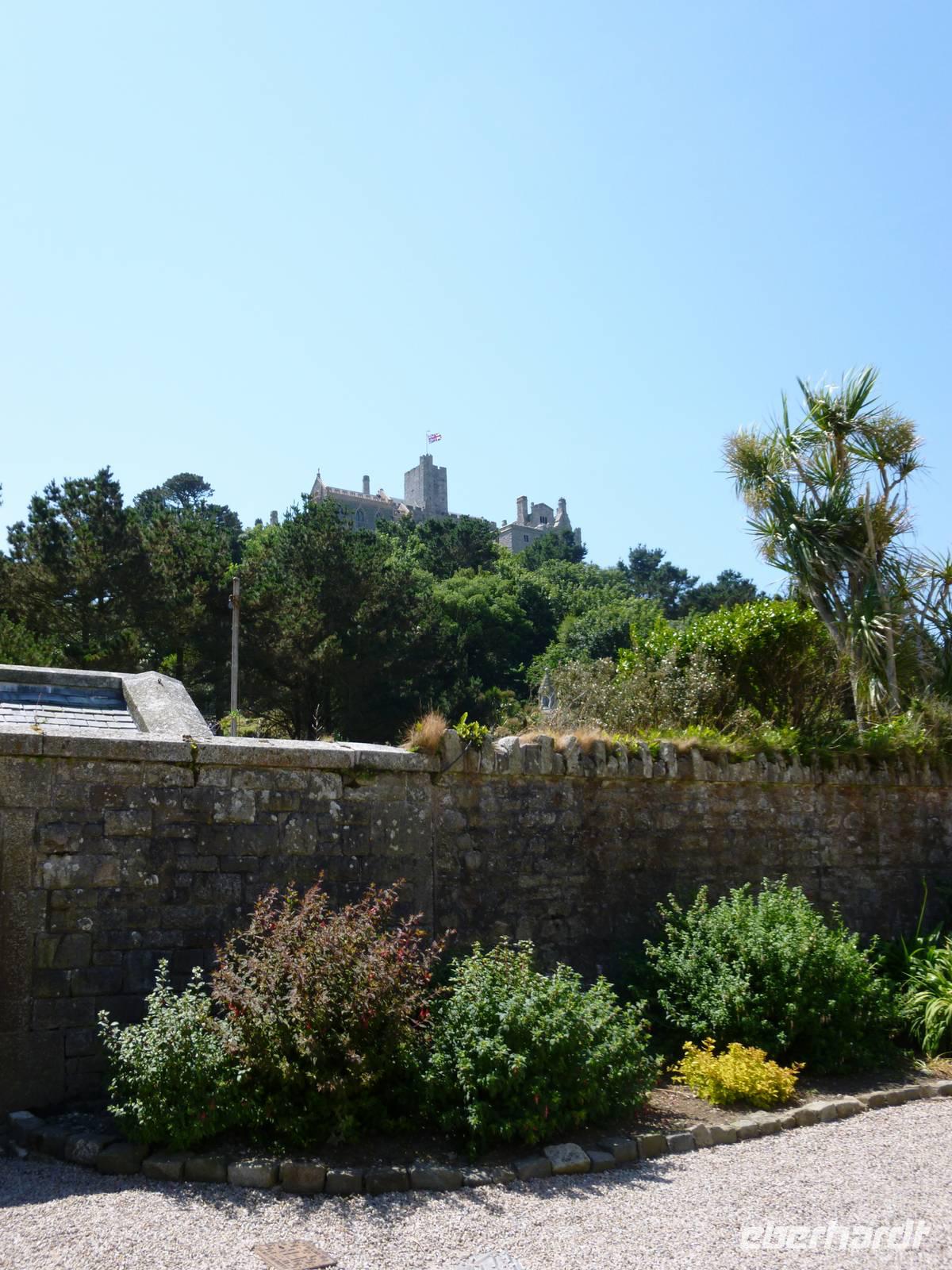 Auf dem Weg zur Burg nehmen wir die Boote durch die Flut und finden fast oben das steinerne Herz des Riesen Comoran, der die Menschen hier terrorisierte und von Jack getötet und dafür von König Artus zum Ritter seiner Tafelrunde geschlagen wurde. Nach Besuch der Räume der Familie Aubyn hatten wir einen wunderbaren Blick vom Burghof auf die Insel und die Bucht. Die Felsengärten wurden gerade von Bergsteigern saniert.