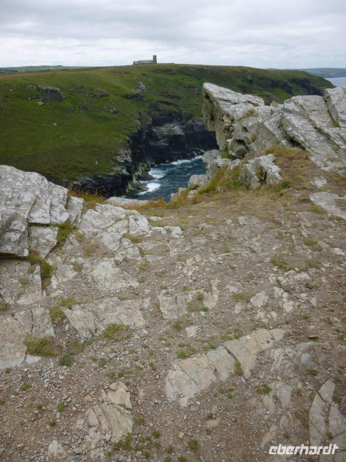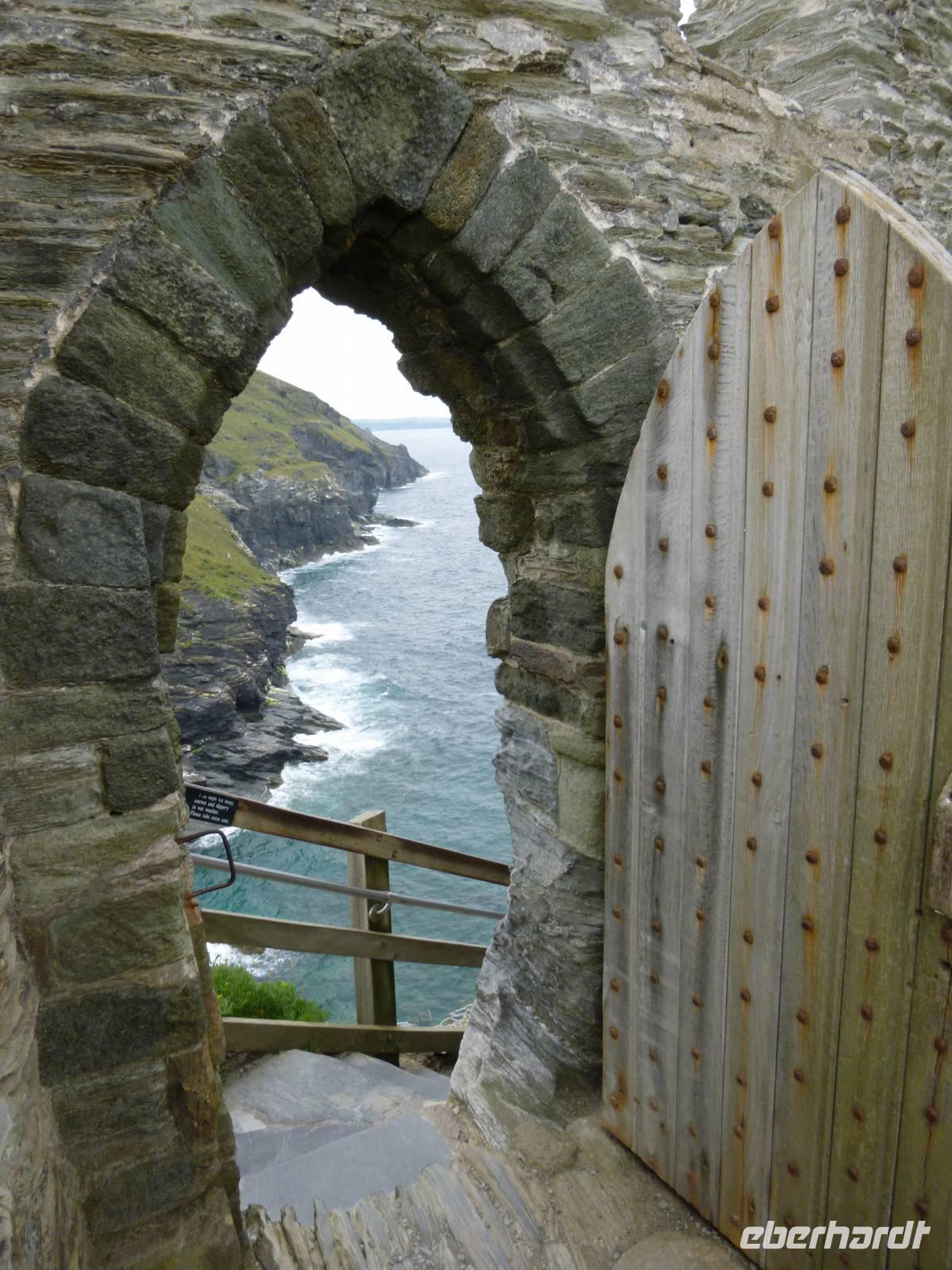 Heute nun folgen wir wieder dem Sagenkreis um König Artus aus dem 6. Jahrhundert und besuchen den Ort seiner Geburt, Tintagel und Slaughter Bridge, den Ort seiner Niederlage durch Verrat. Wir fahren über den mythischen Ort Camelford und sehen zunächst auf unserem Weg zur Burg ein windsschiefes Häuschen aus dem 14. Jahrhundert, die Old Post Office (Musem), bevor wir vor den brandungsumtosten malerischen Resten der steinernen Festungsanlage aus dem 13. Jahrhundert stehen, erbaut von Earl Richard von Cornwall, Bruder Heinrich des II. Die Höhle an ihrem Fuß ist nach dem Zauberer Merlin benannt, dem Artus Eltern ihren Sohn zur keltischen Erziehung anvertrauten. Oben über eine steile Treppe angelangt, genießen wir den herrlichen Blick vom Festungsfelsen auf die zerklüftete Granitküsteund entdecken knapp über dem Abhang eine kleine sportliche Ziegenherde.
