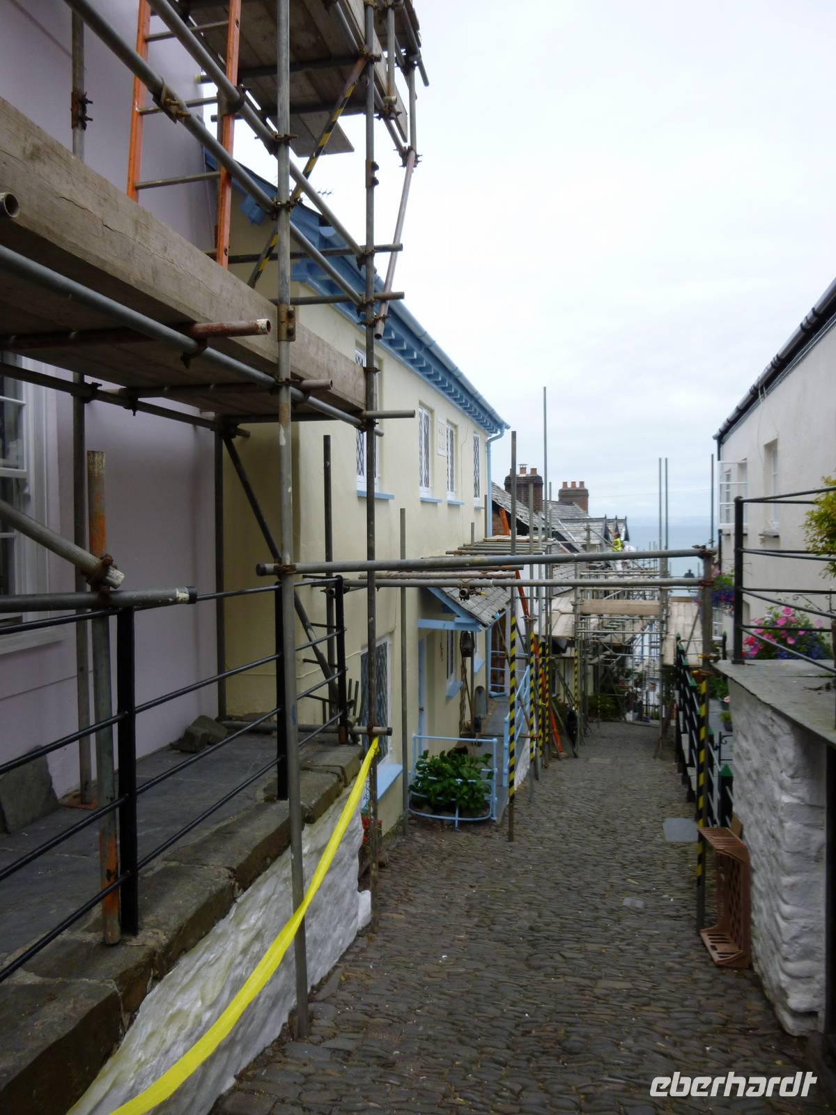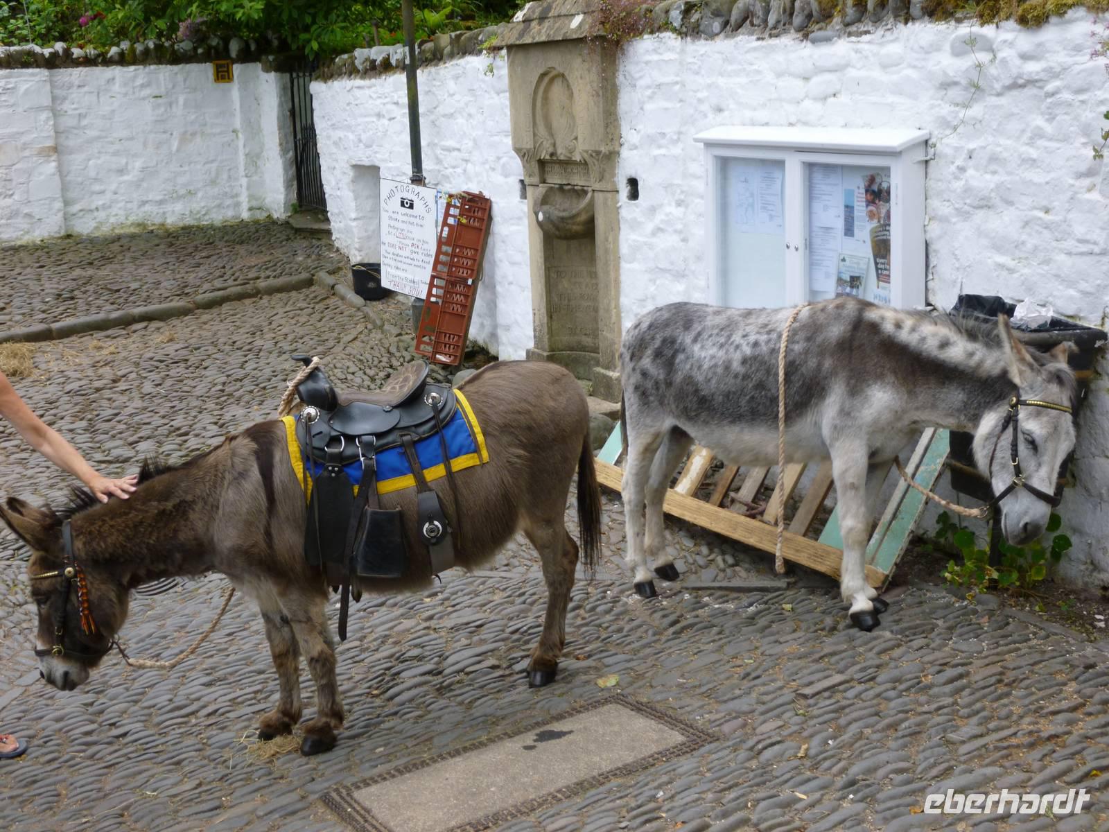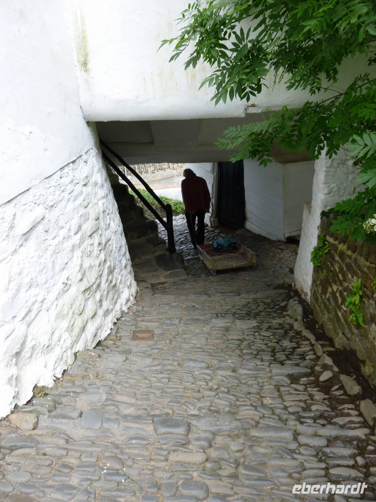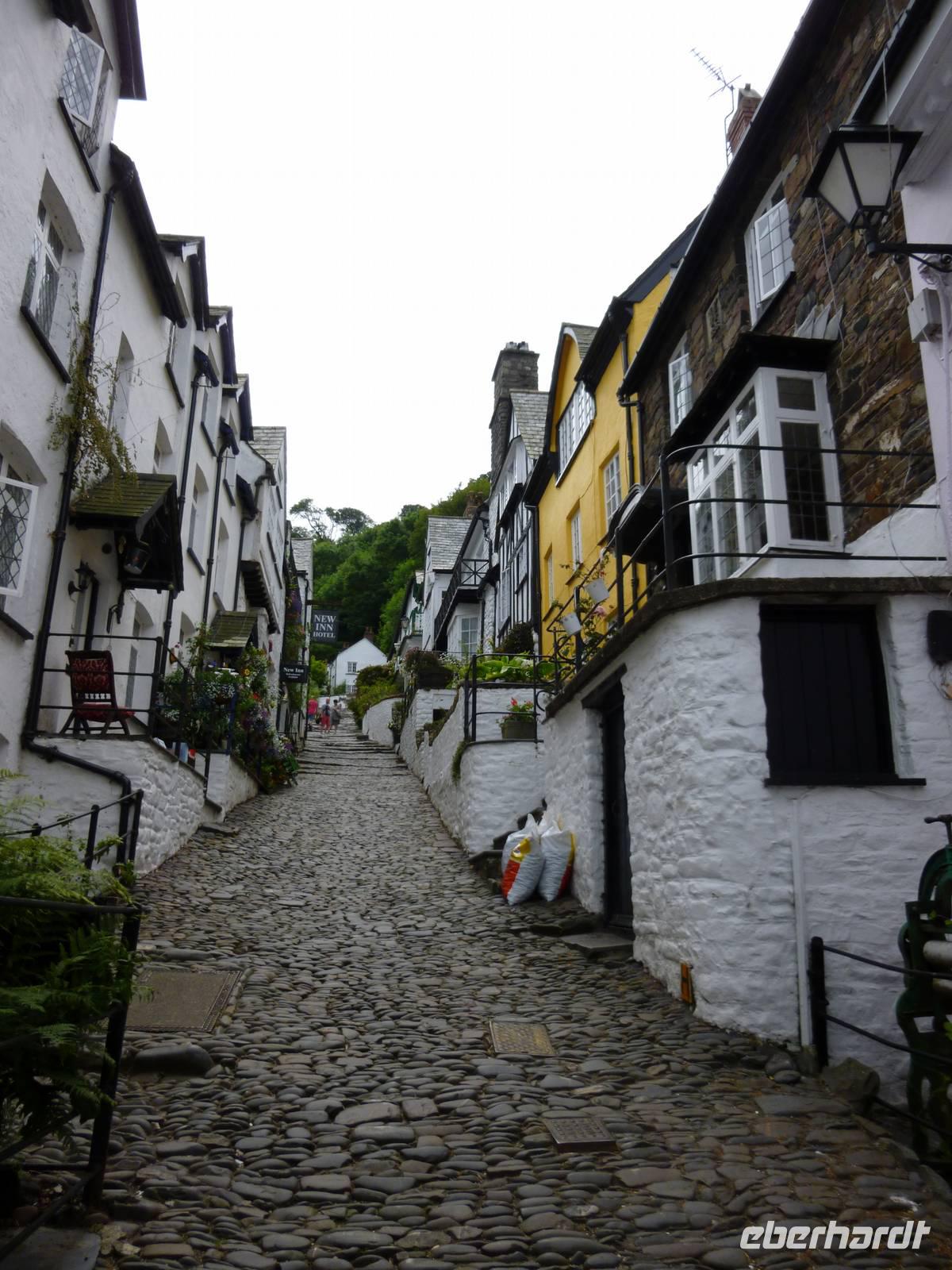 Über Slaughterbridge erreichen wir das letzte Ziel unseres Tages, das idyllisch gelegene Museumsdörfchen Clovelly in Devon. Seit 1738 gehört es der Familie Rous, Einheimische werden als Mieter bevorzugt unter bestimmten Auflagen. Wir steigen auf der steilen gepflasterten Hauptstraße zum Hafen hinab und treffen Eseltreiber und Schlittenführer für den wagentransport. Ein hübsches Museum zeigt Wohnen und Alltag der Fischer und die weiß getünchten Häuser mit dem reichen Blumenschmuck wirken alle gepflegt.