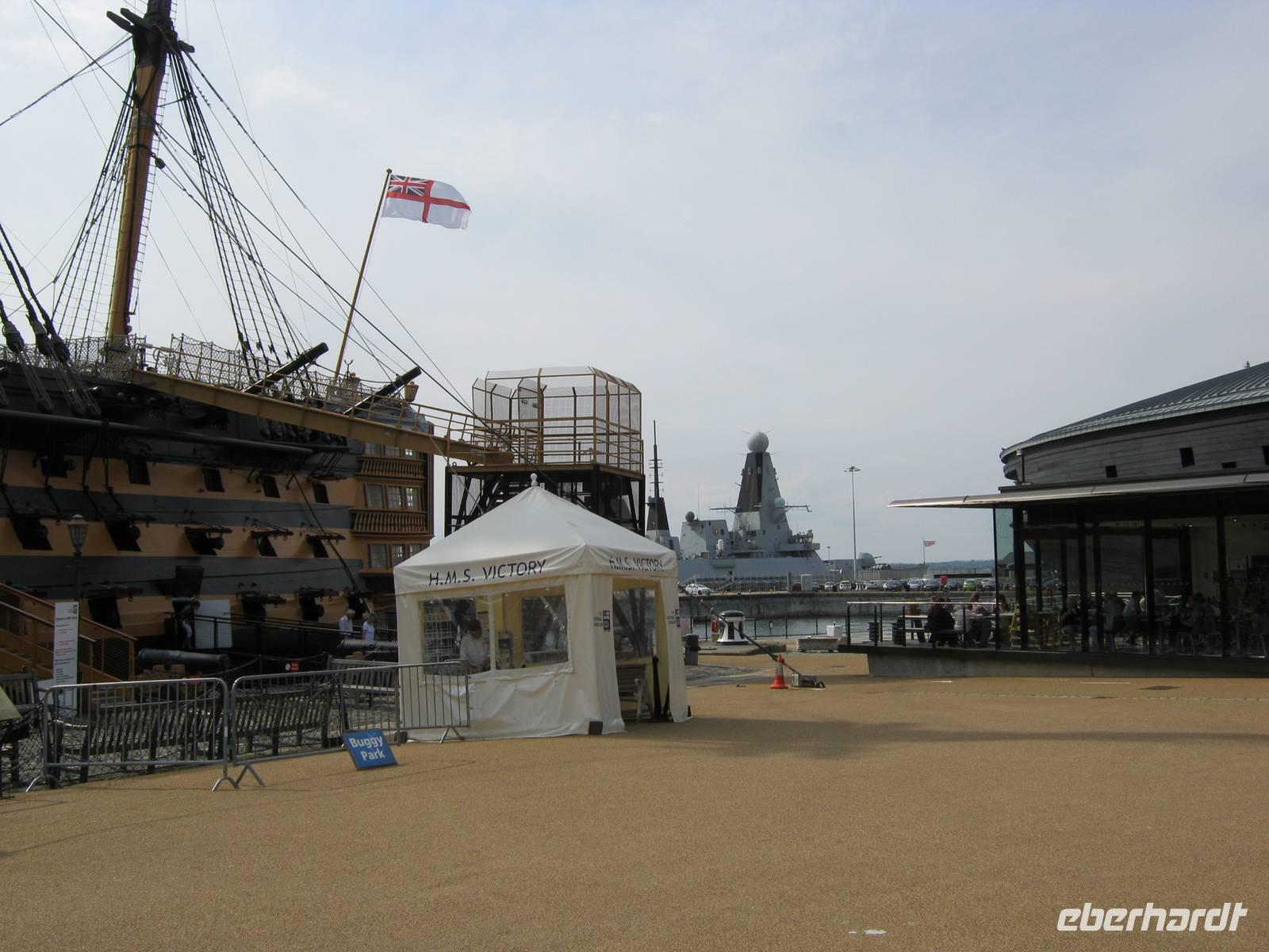 Einer der absoluten Höhepunkte dieser Reise ist für mich immer der Besuch auf der HMS Victory. Zwar liegt das einstige Flaggschiff Admiral Nelsons in der Schlacht von Trafalgar seit langer Zeit im größten britischen Marinestützpunkt Portsmouth im Trockendock, wo es auch ständig Stück für Stück konserviert und restauriert wird, doch wurde es nie formell außer Dienst gestellt. Von der Admiralskajüte bis in den untersten Schiffsraum führt die Besichtigungstour und gibt so einen authentischen Einblick in das harte Leben der Seeleute. Die Bronzeplatte auf dem Oberdeck zu sehen, die an der Stelle angebracht wurde, wo Nelson die tödliche Kugel traf, ist für mich immer besonders bewegend. Mit dem trotzdem siegreichen Ausgang der Schlacht nahm die europäische Geschichte eine entscheidende Wendung.