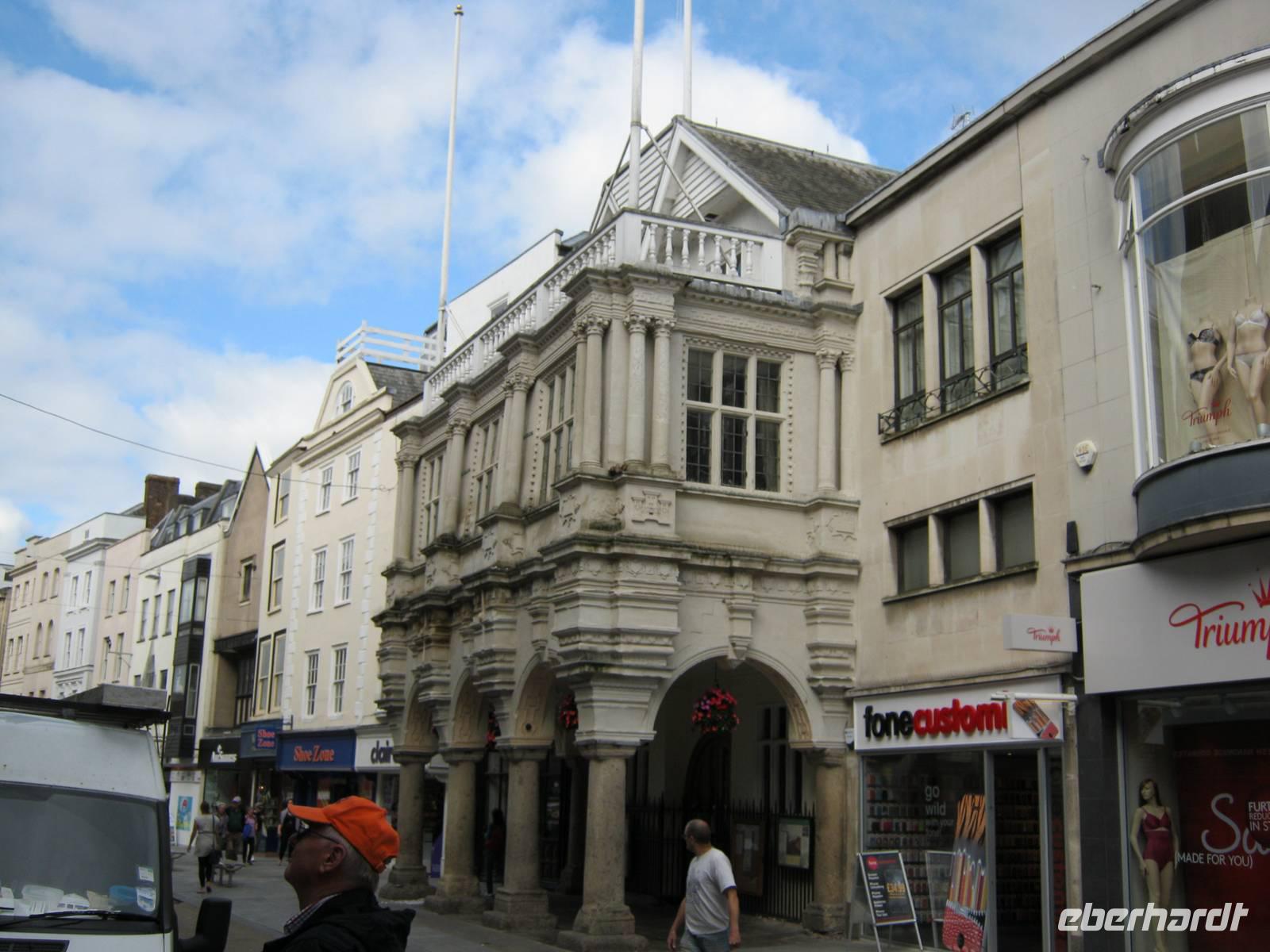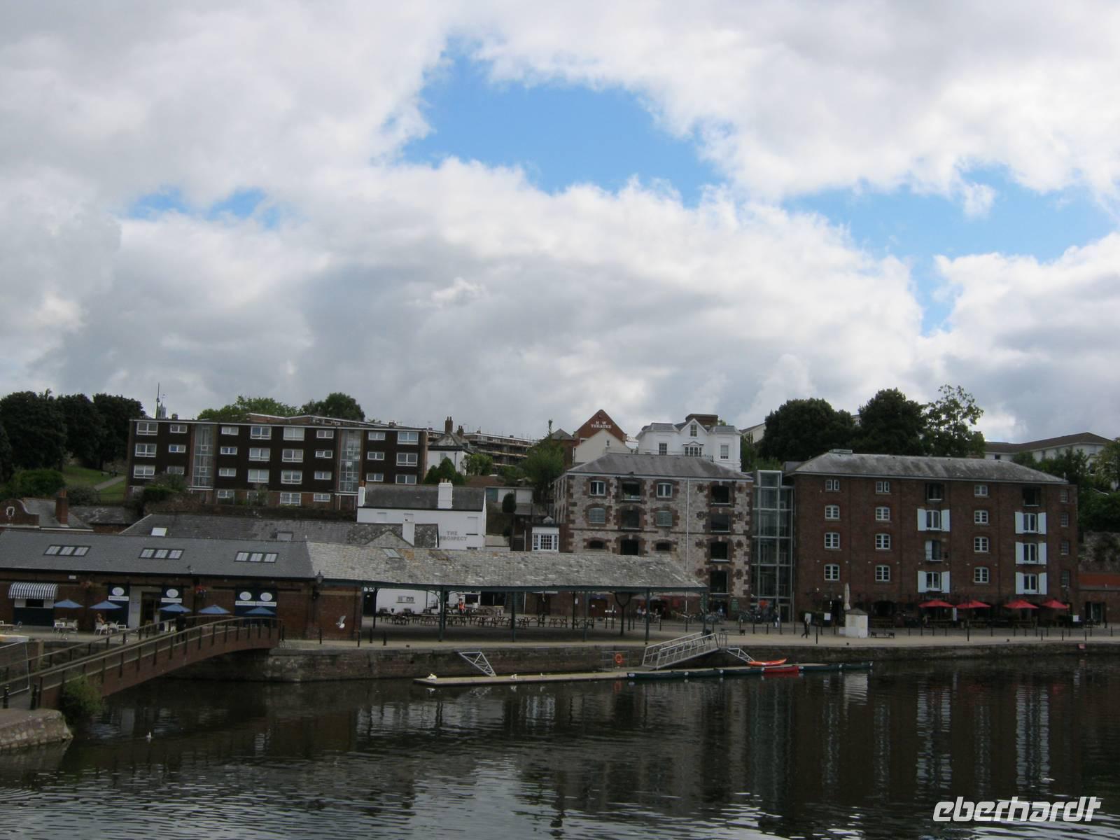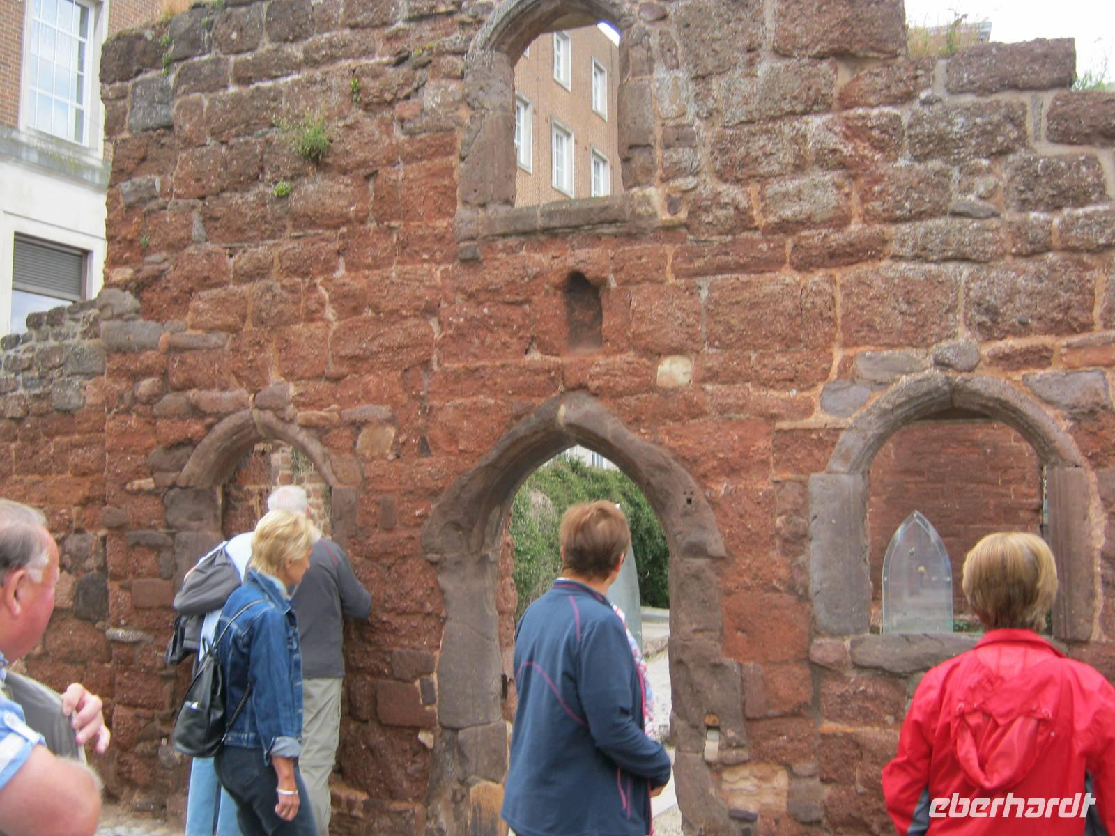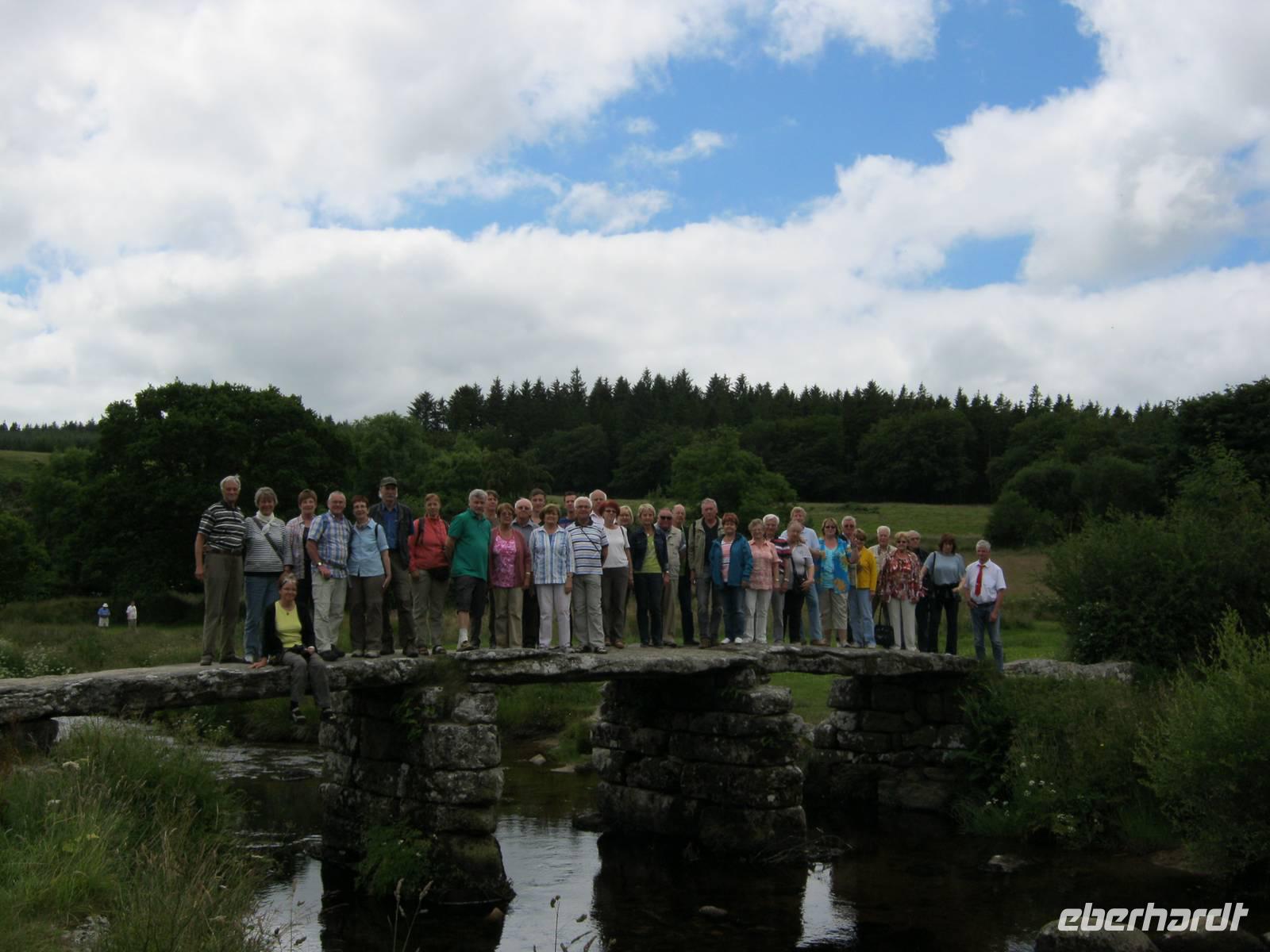 Das auch ein Ketten-Hotel für die Gäste erfreulich gut funktionieren kann, bewies man uns in Exeter. Von den Resten der römischen Stadtmauer die High Street hinunter in Richtung der ehemaligen Hafenanlagen, die heute vielfältig anderweitig genutzt werden, liegt jede Menge sehenswertes am Wege: in den Nachkriegsneubauten integriert die Ruinen eines Klosters, die Stammkneipe von Sir Francis Drake und wieder eine wunderschöne Kathedrale mit dem angeblich längsten gotischen Rippengewölbe der Welt. Dazu die immer noch funktionierende Guild Hall, sowie eine Straße, die so schmal ist, das man nicht einmal mit dem Fahrrad durchkäme. Vor einer Konditorei bot man uns eine Kostprobe köstlichen Mandelgebäcks an - Gastfreundschaft ist wundervoll. Die nette Verkäuferin ist übrigens Slowakin. An der verabredeten Stelle nahm uns der Bus auf; Steffen wie immer zuverlässig. Und ab ging's ins Dartmoor. Diese legendäre Landschaft ist zumindest heutzutage viel angenehmer als ihr Ruf - bis auf die schwierigen Straßenverhältnisse: schmal, mit Hohlwegen und Hecken, die dem Chauffeur seine ganze Kunst abverlangen. Moretonhampstead ist ein typischer Marktflecken, in dem die Zeit stehen geblieben zu sein scheint. Der dortige Gemischtwarenladen erweckt Erinnerungen an die Kindheit. In dem Weiler Postbridge befindet sich das Nationalparkzentrum und neben der für Postkutschen geeigneten schönen Bogenbrücke findet sich eine der berühmten Clapper Bridges, die früher vom Getrappel der Hufe der Tragtiere für den Transport des Erzes widerhallten. Heute beliebtes Fotomotiv. Ebenso wie das berüchtigte Dartmoor Prison. Im Vorbeifahren sahen wir an der Straße nicht nur viele Schafe sondern auch Dartmoor Ponies. Von der Hochfläche hinab ging's über Tavistock, eine der Stannary Towns, deren heutiges Erscheinungsbild von Francis Duke of Bedford geprägt wurde, dessen Statue den halbrunden Marktplatz schmückt. In einem Kreisverkehr das Standbild des berühmtesten Sohnes der Stadt: Sir Francis Drake.