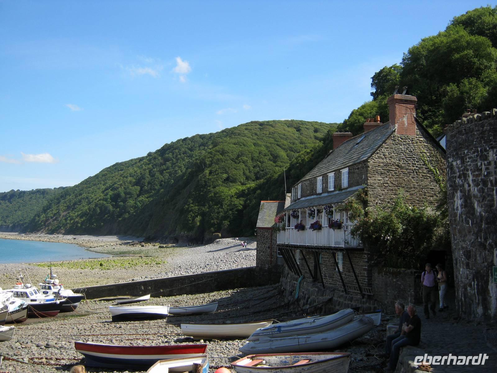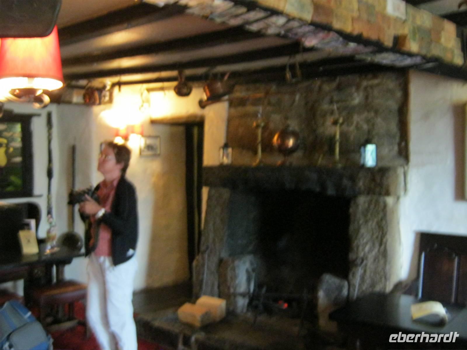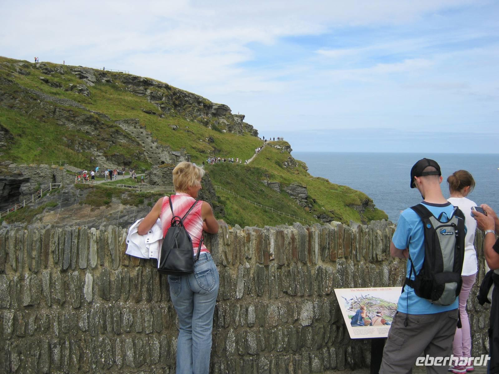 Ein fakultativer Ausflug, an dem fast alle teilnahmen, führte uns zunächst nach Tintagel. Dort besichtigten wir zunächst das alte Postamt, welches in einem schon vom Alter gebeugten früheren Herrenhaus als stimmungsvolles Museum weiter existiert. Dann machten wir uns auf den Weg zur sagenumwobenen Burg, die unmittelbar mit dem Sagenkreis um König Artus verbunden ist. Hier soll er gezeugt worden sein. Wenn auch die wissenschaftlichen Erkenntnisse eine andere Sprache sprechen und die baulichen Überreste in eine andere Epoche gehören, so ist es allemal der Mühe wert, das Plateau zu erklimmen und sich dort oben umzuschauen - der Blick auf einen ausgedehnten Küstenabschnitt ist einmalig. Erstaunlich viele ließen sich auf den Vorschlag des Reiseleiters ein und stiegen zuerst wieder ab, dann hinauf auf die Vorburg und über den Klippenweg zur alten Dorfkirche mit ihrem trutzigen Aussehen, um dann den Kreis zu schließen. Der Nachmittag war dem Besuch in Clovelly gewidmet, einem Dorf wie es kein zweites mehr gibt. Seit Jahrhunderten in Familienbesitz, liegt es in einer steilen Schlucht, die zu dem kleinen Hafen hinunterführt. Die kopfsteingepflasterte einzige Straße an der sich die gepflegten, mit Blumen reich geschmückten Cottages aufreihen, ist mit Autos nicht befahrbar; der Transport vollzieht sich mit Eseln und Schlitten. Ist man erst unten, so kann man sich durch enge Gässchen und über das Geröll des Strandes nach rechts wenden und gelangt mit angemessener Mühe (hatte doch der Reiseleiter die Mär verbreitet, es handle sich um einen Jungbrunnen!) zu einem kleinen Wasserfall. Wer sich gut fühlt, kann auch zu Fuß wieder hinauf, für andere steht ein Allrad-Shuttle zur Verfügung. Die sausende Fahrt mit dem Landrover hat auch etwas Abenteuerliches an sich.