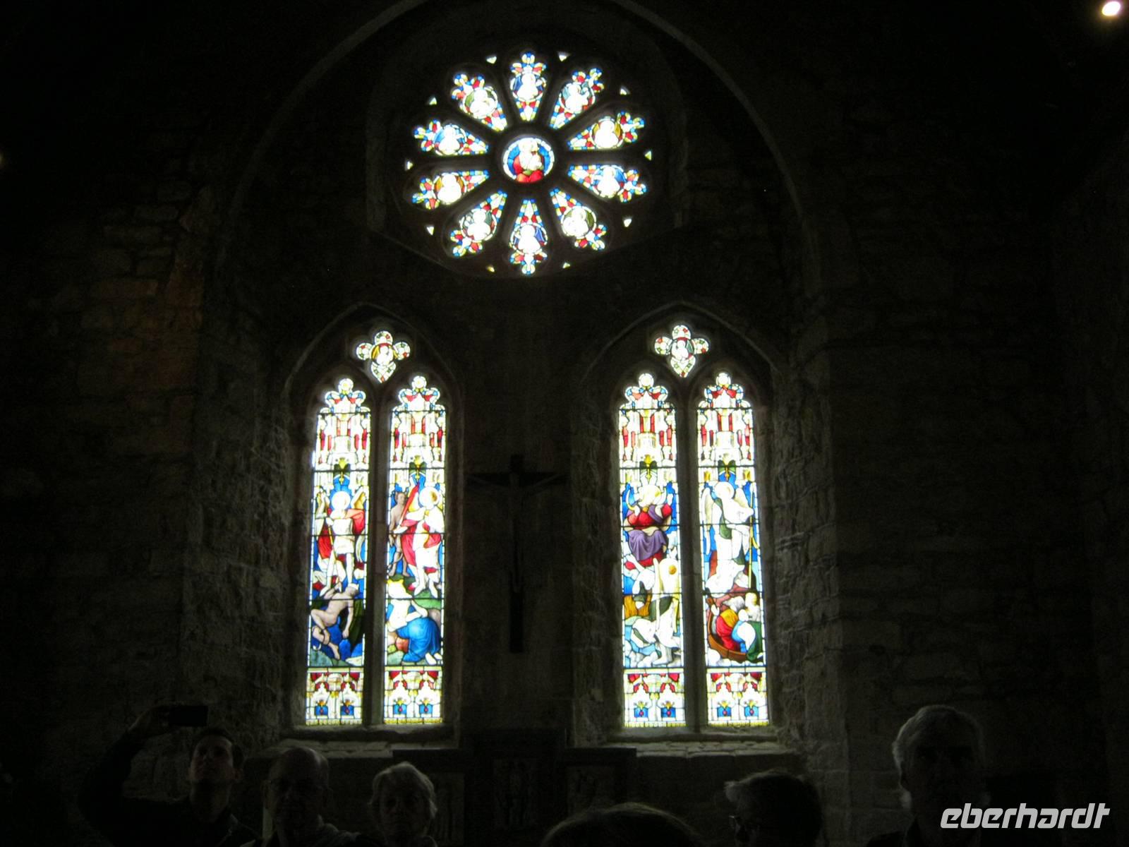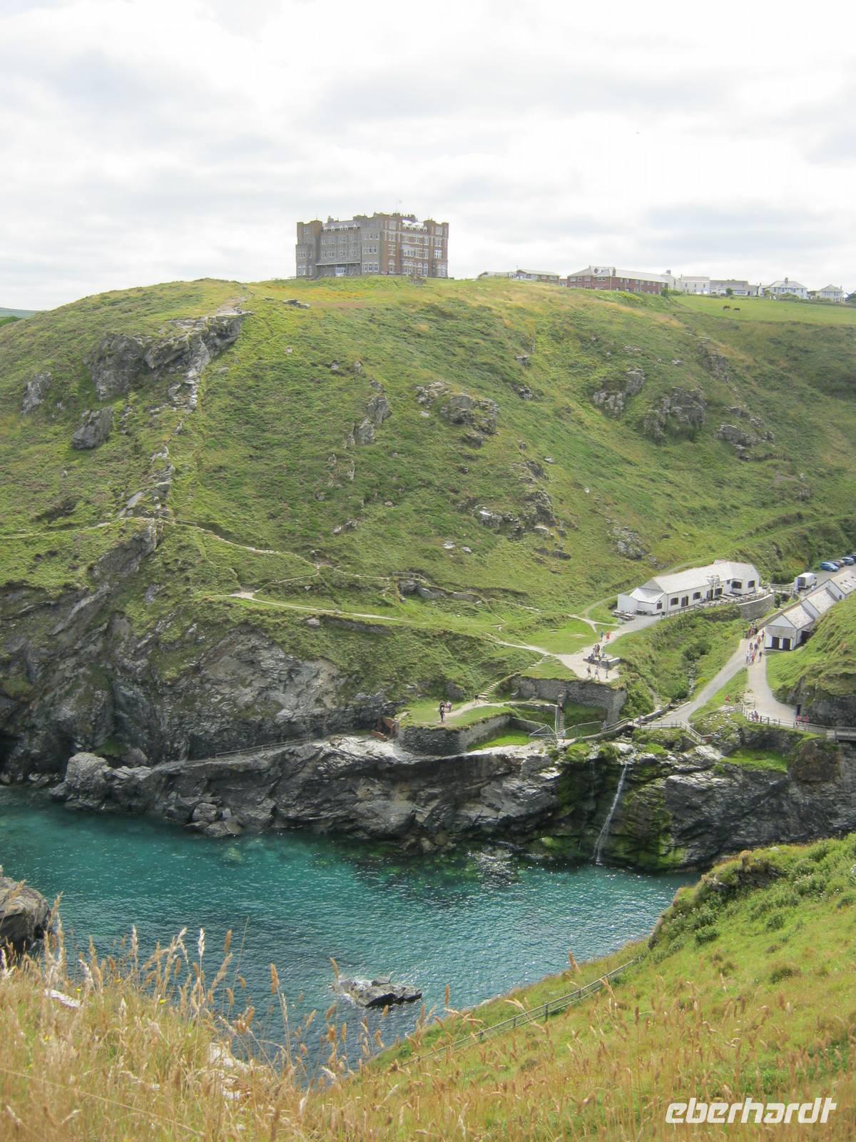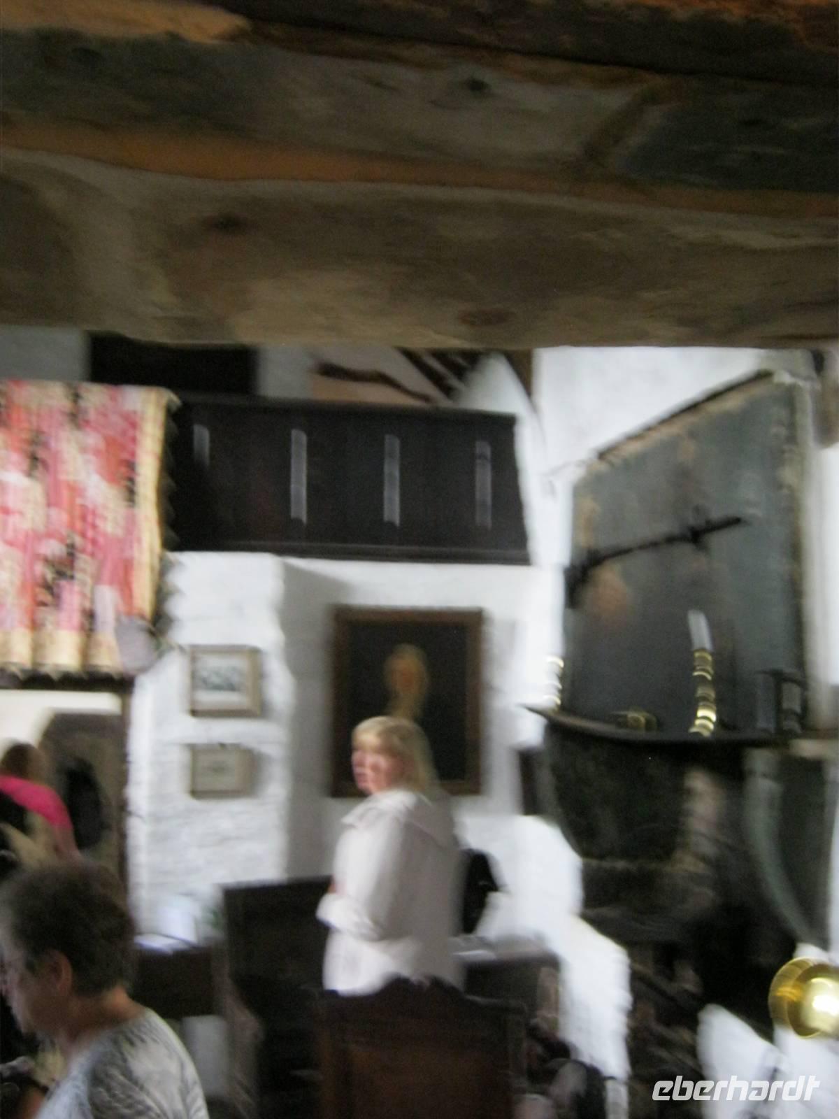 Ein fakultativer Ausflug, an dem fast alle teilnahmen, führte uns zunächst nach Tintagel. Dort besichtigten wir zunächst das alte Postamt, welches in einem schon vom Alter gebeugten früheren Herrenhaus als stimmungsvolles Museum weiter existiert. Dann machten wir uns auf den Weg zur sagenumwobenen Burg, die unmittelbar mit dem Sagenkreis um König Artus verbunden ist. Hier soll er gezeugt worden sein. Wenn auch die wissenschaftlichen Erkenntnisse eine andere Sprache sprechen und die baulichen Überreste in eine andere Epoche gehören, so ist es allemal der Mühe wert, das Plateau zu erklimmen und sich dort oben umzuschauen - der Blick auf einen ausgedehnten Küstenabschnitt ist einmalig. Erstaunlich viele ließen sich auf den Vorschlag des Reiseleiters ein und stiegen zuerst wieder ab, dann hinauf auf die Vorburg und über den Klippenweg zur alten Dorfkirche mit ihrem trutzigen Aussehen, um dann den Kreis zu schließen. Der Nachmittag war dem Besuch in Clovelly gewidmet, einem Dorf wie es kein zweites mehr gibt. Seit Jahrhunderten in Familienbesitz, liegt es in einer steilen Schlucht, die zu dem kleinen Hafen hinunterführt. Die kopfsteingepflasterte einzige Straße an der sich die gepflegten, mit Blumen reich geschmückten Cottages aufreihen, ist mit Autos nicht befahrbar; der Transport vollzieht sich mit Eseln und Schlitten. Ist man erst unten, so kann man sich durch enge Gässchen und über das Geröll des Strandes nach rechts wenden und gelangt mit angemessener Mühe (hatte doch der Reiseleiter die Mär verbreitet, es handle sich um einen Jungbrunnen!) zu einem kleinen Wasserfall. Wer sich gut fühlt, kann auch zu Fuß wieder hinauf, für andere steht ein Allrad-Shuttle zur Verfügung. Die sausende Fahrt mit dem Landrover hat auch etwas Abenteuerliches an sich.