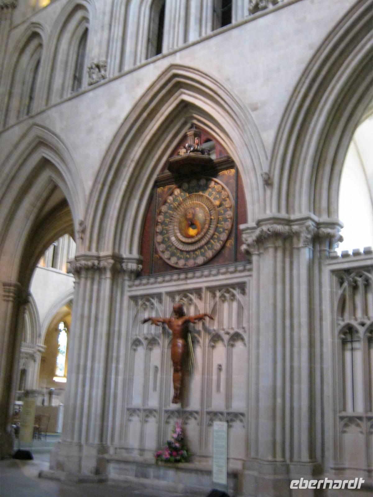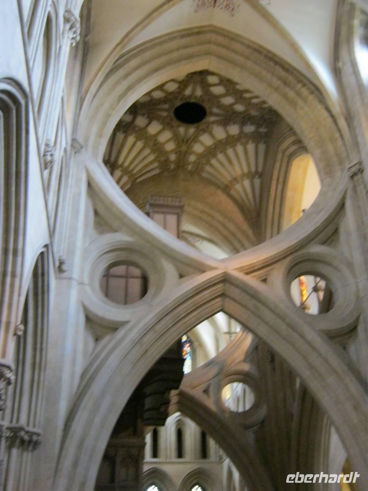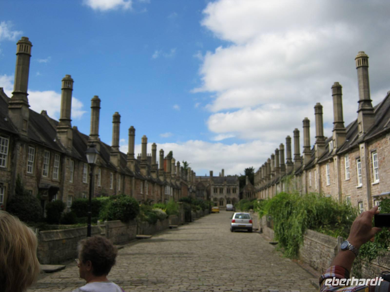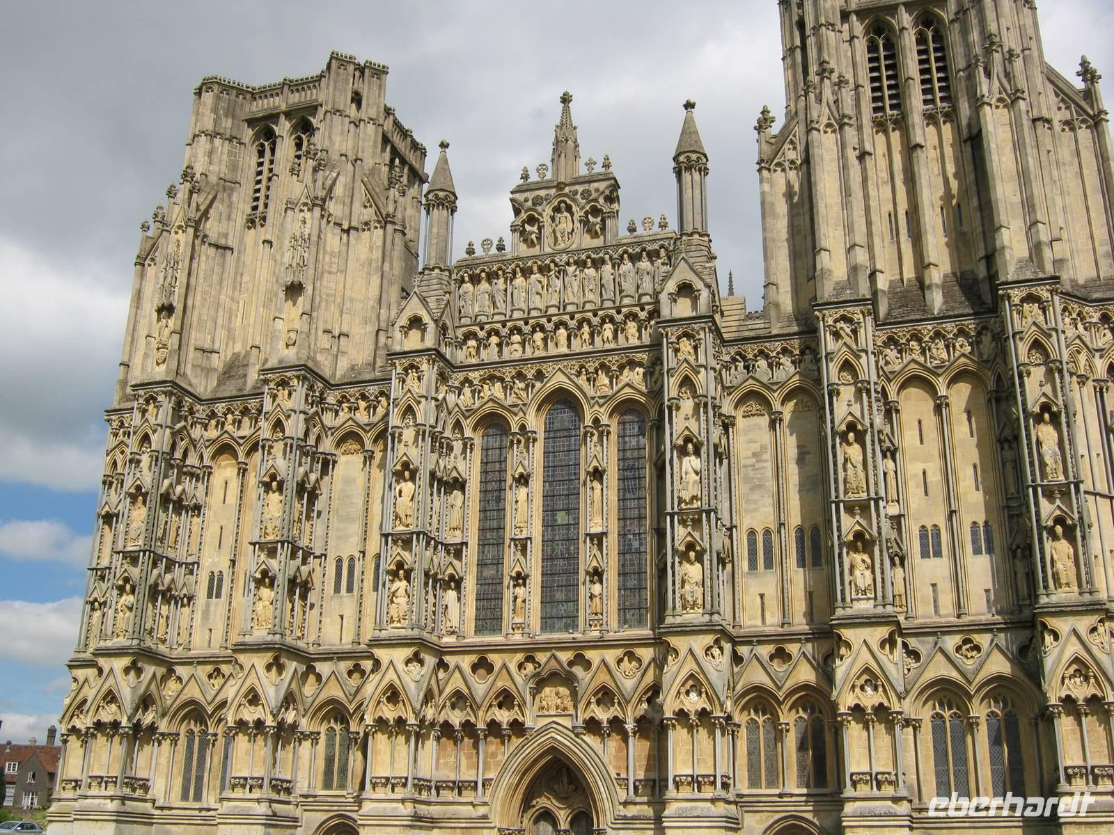 Wells, die kleinste City Englands, verdankt ihren Namen den Quellen, die vom Wassergraben des bischöflichen Palastes (oder sollte man besser Burg sagen?) ausgehend die Stadt durchfließen. Die dortige Kathedrale gilt zu Recht als Höhepunkt der Gotik. Ihr angeschlossen ist der Vicar's Close, der gelegentlich als die älteste Reihenhaussiedlung Europas bezeichnet wird. Im Inneren überrascht das Gotteshaus mit einzigartigen architektonischen Einfällen. Schon im 14. Jh. Wurden die modern und formschön wirkenden Scherenbögen eingezogen, um statische Probleme an der Vierung auszugleichen. Das großartige Rippengewölbe des Kapitelhauses - die dorthin führenden Stufen aus Sandstein sind durch die jahrhundertelange Benutzung ausgetreten - wird von einem einzigen Bündelpfeiler, der wie eine steinerne Palme aussieht getragen. Die astronomische Uhr schickt regelmäßig Ritter ins Turnier.